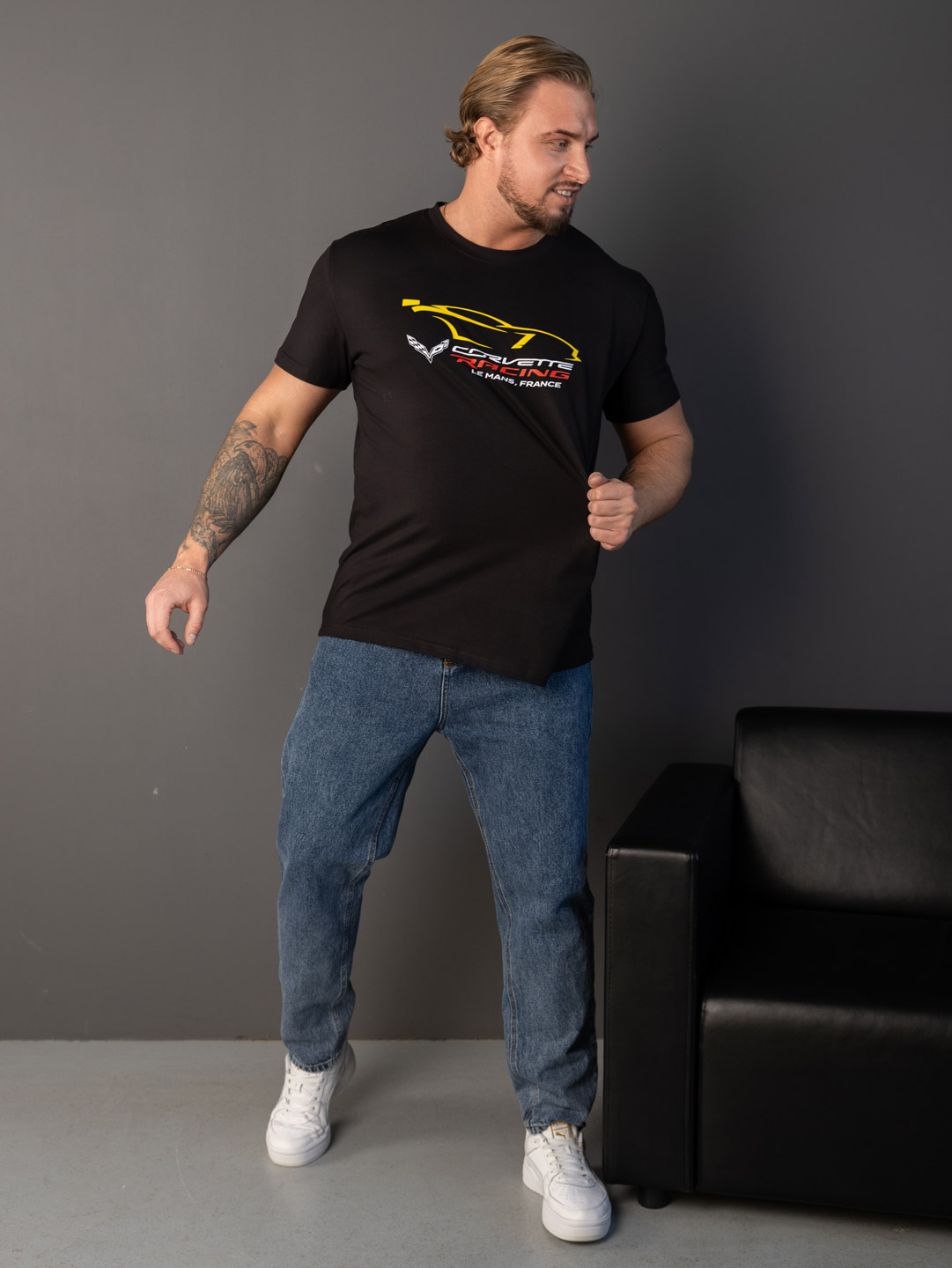 Мужская футболка из кулики с лайкрой, базового кроя, с О-образной горловиной, коротким рукавом и принтом спереди.