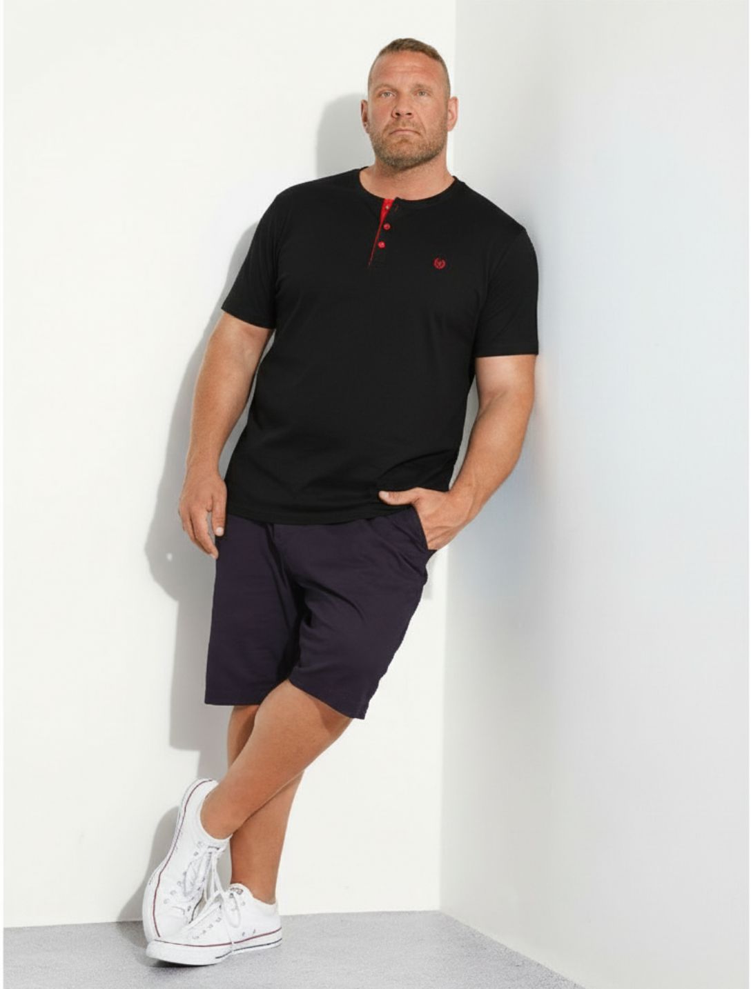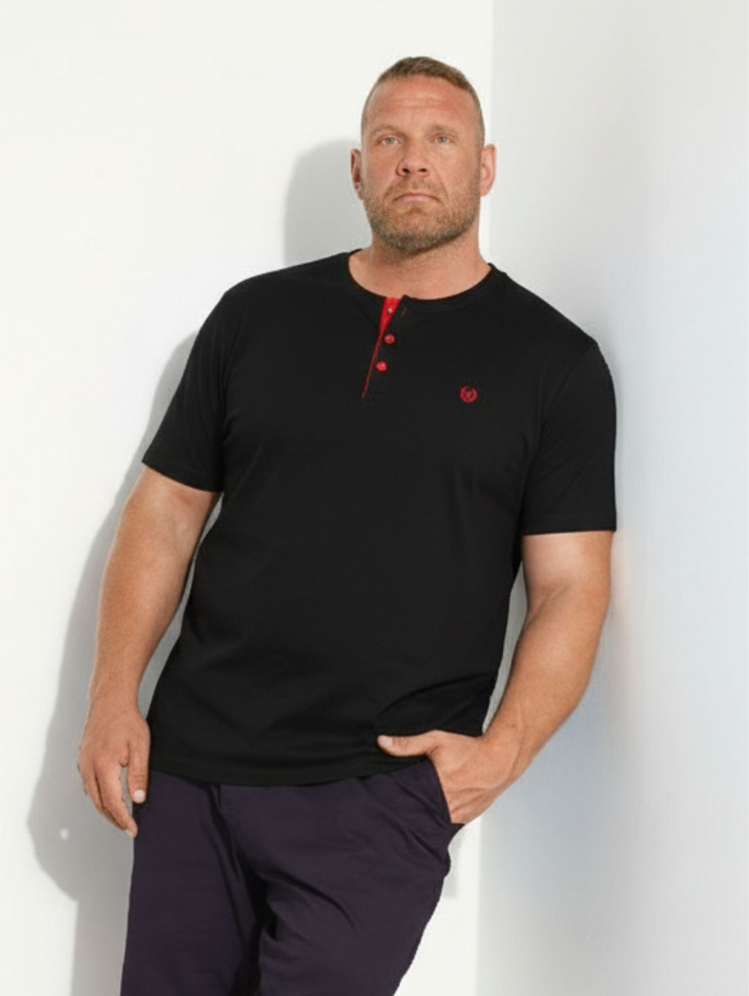Футболка прямого силуэта, украшена печатью . Горловина декорирована треугольным вырезом со вставкой, украшена пуговицами.