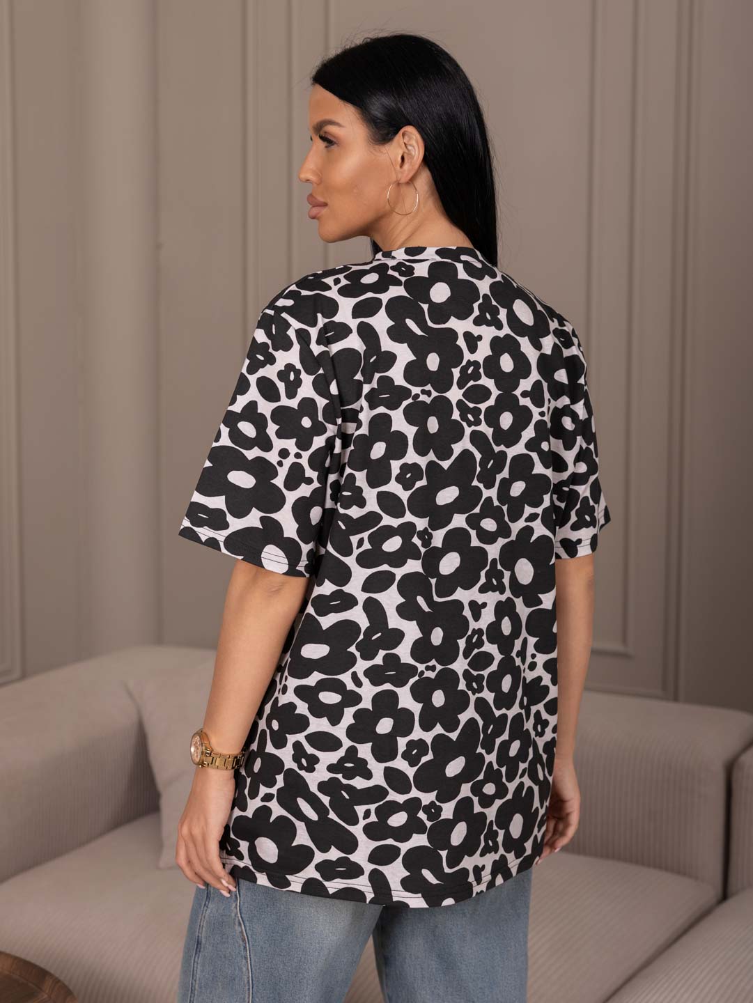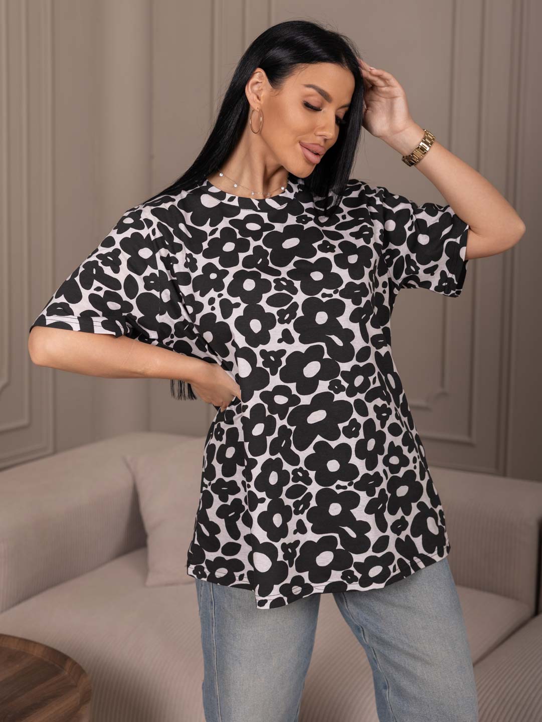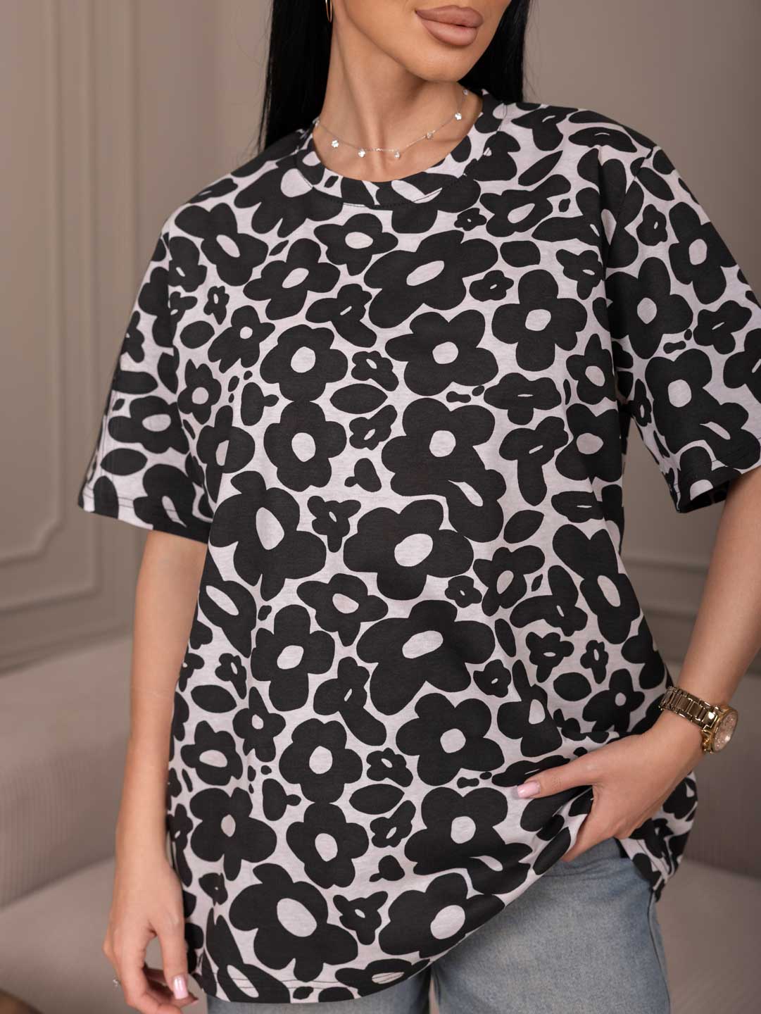 Классическая футболка с коротким рукавом и О-образной горловиной, выполнена из набивной кулирки.