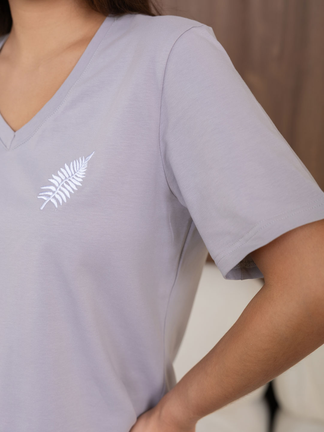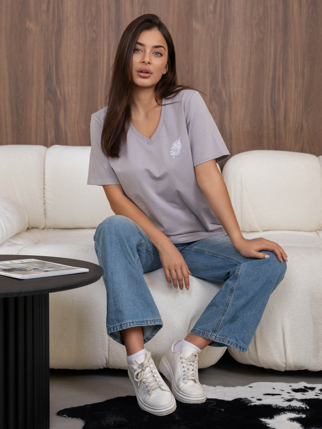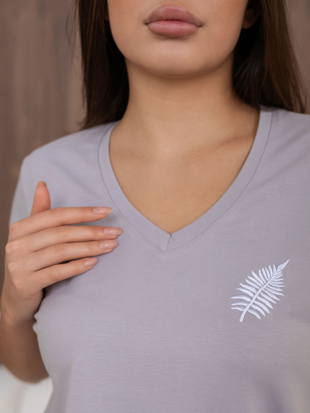 Футболка женская из кулирки с лайкрой, качества пенье с V-вырезом, коротким рукавом и лаконичной вышивкой. Рост модели 165см.