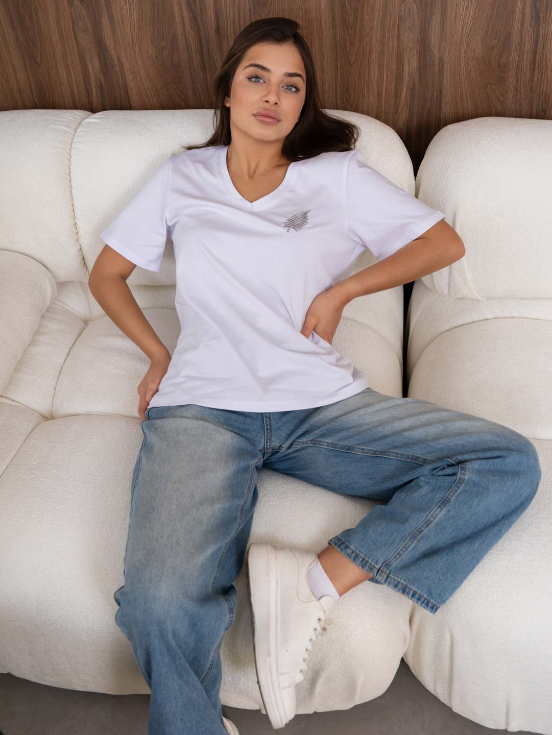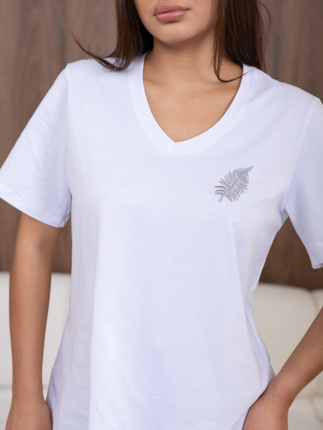 Футболка женская из кулирки с лайкрой, качества пенье с V-вырезом, коротким рукавом и лаконичной вышивкой. Рост модели 165см.