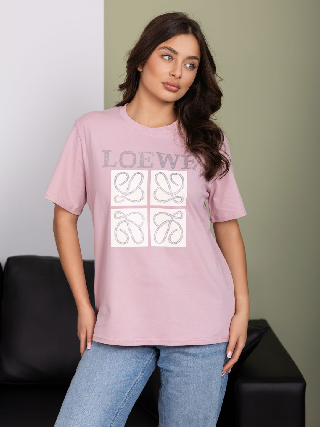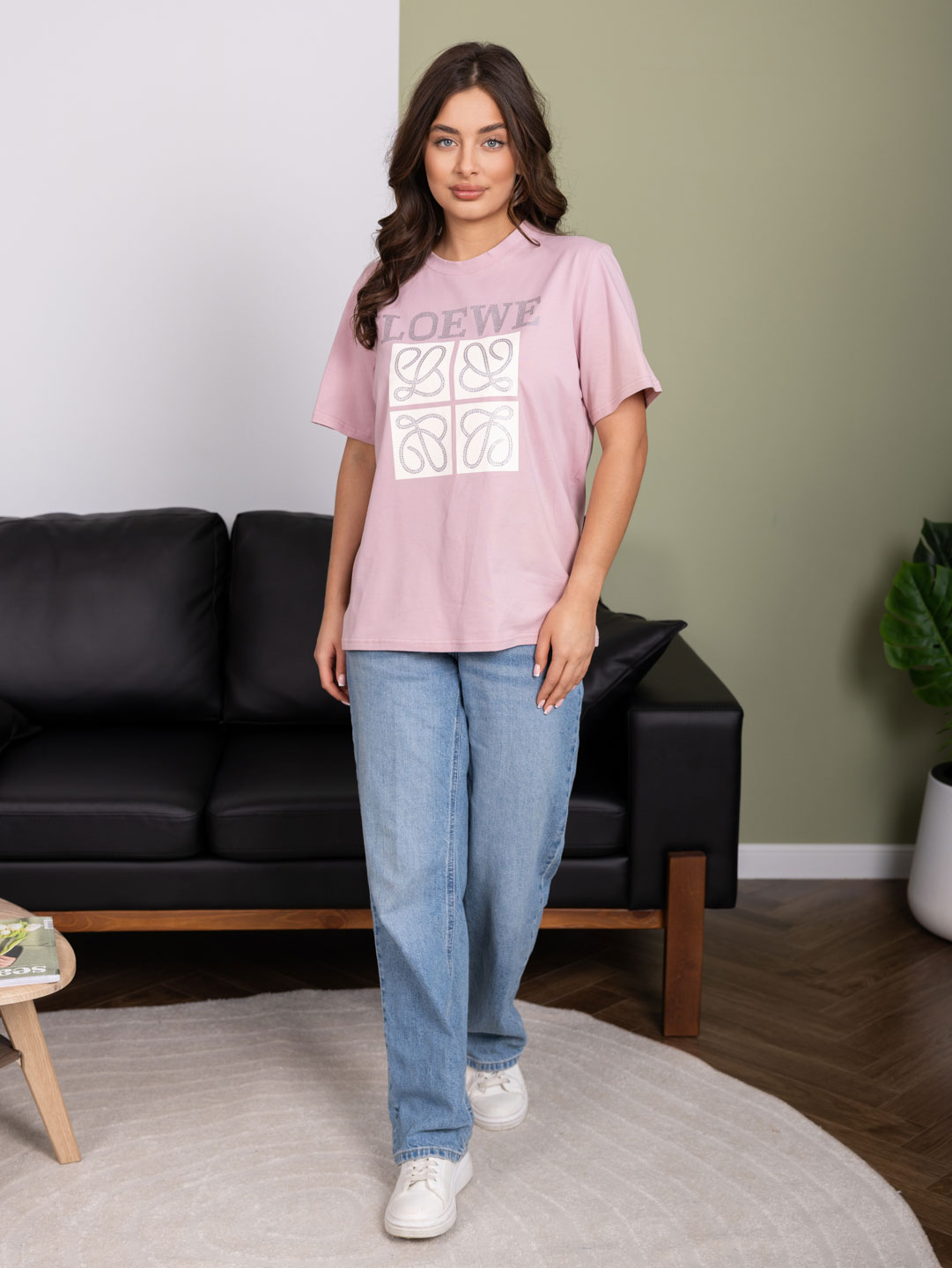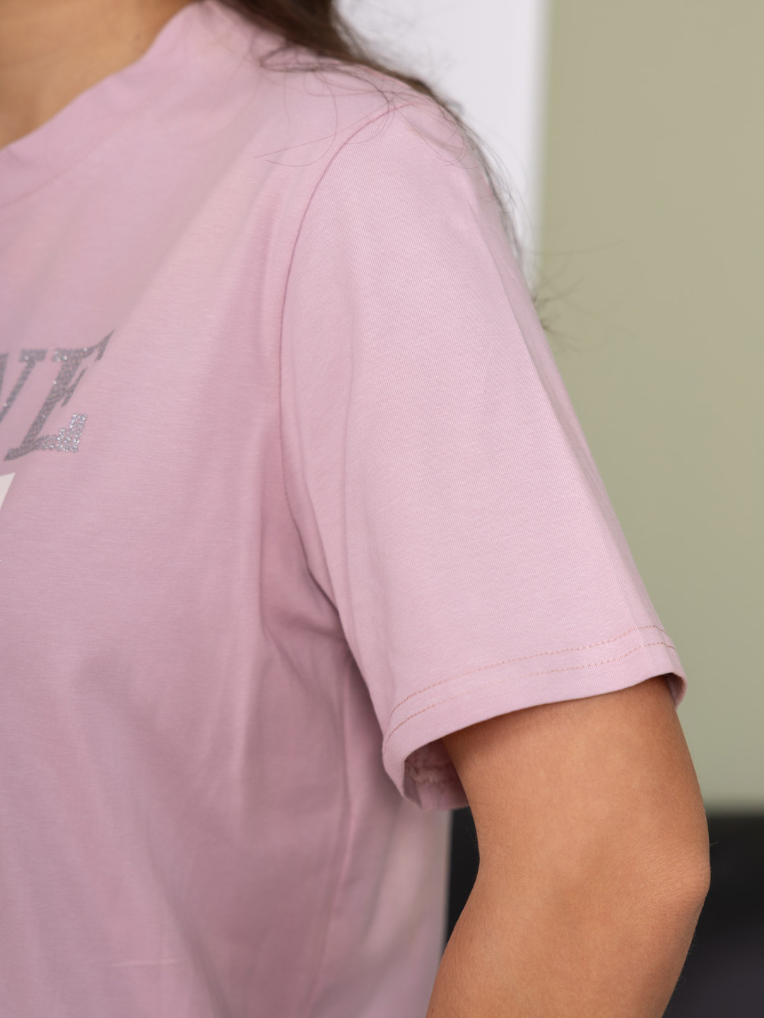 Женская базовая футболка трендового оттенка, с втачным рукавом, О-образной горловиной, длиной до середины бедра. Спереди печать с блестками.