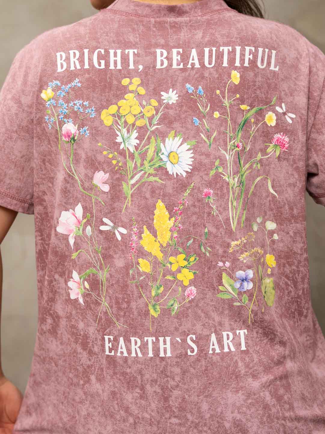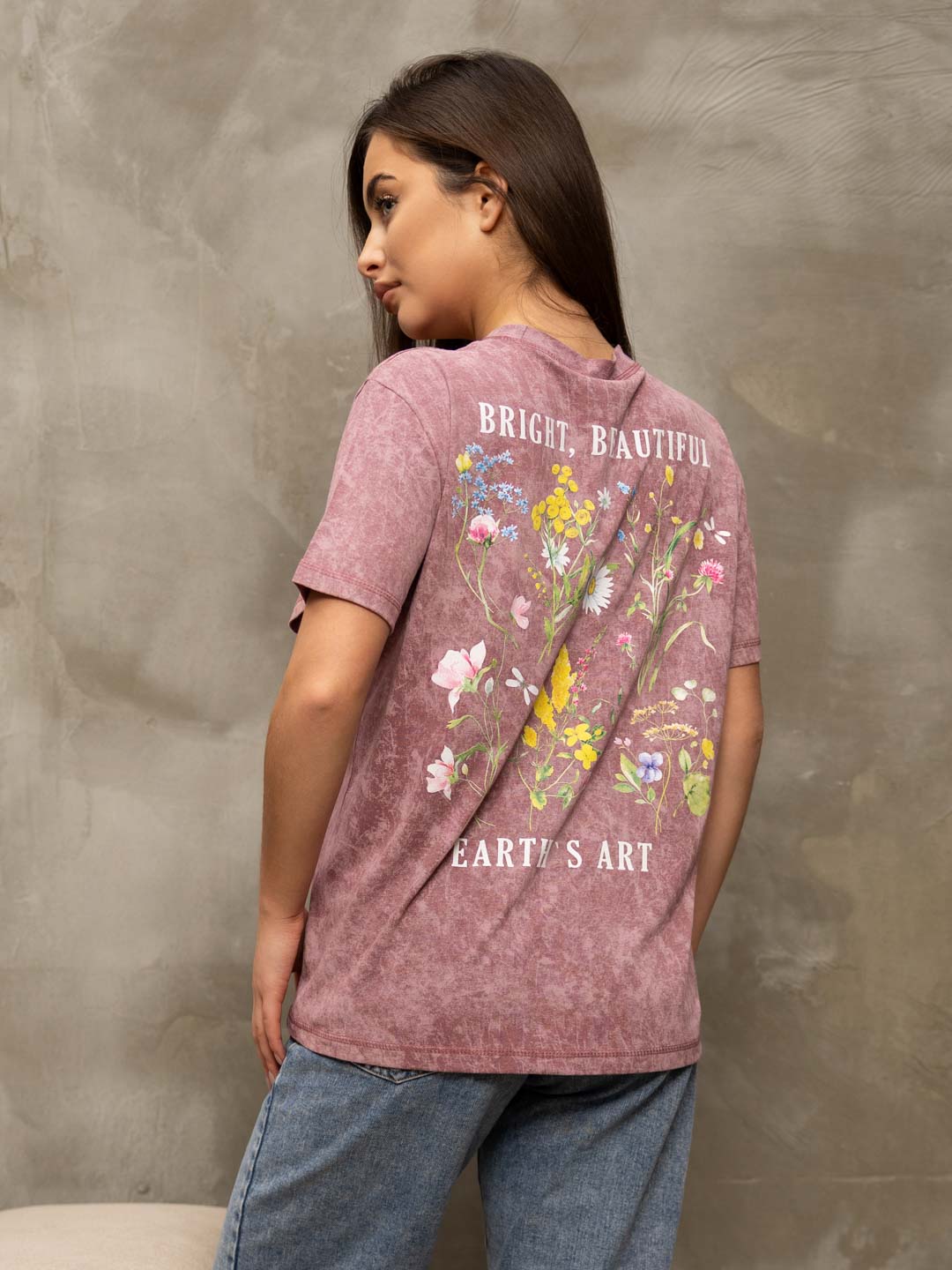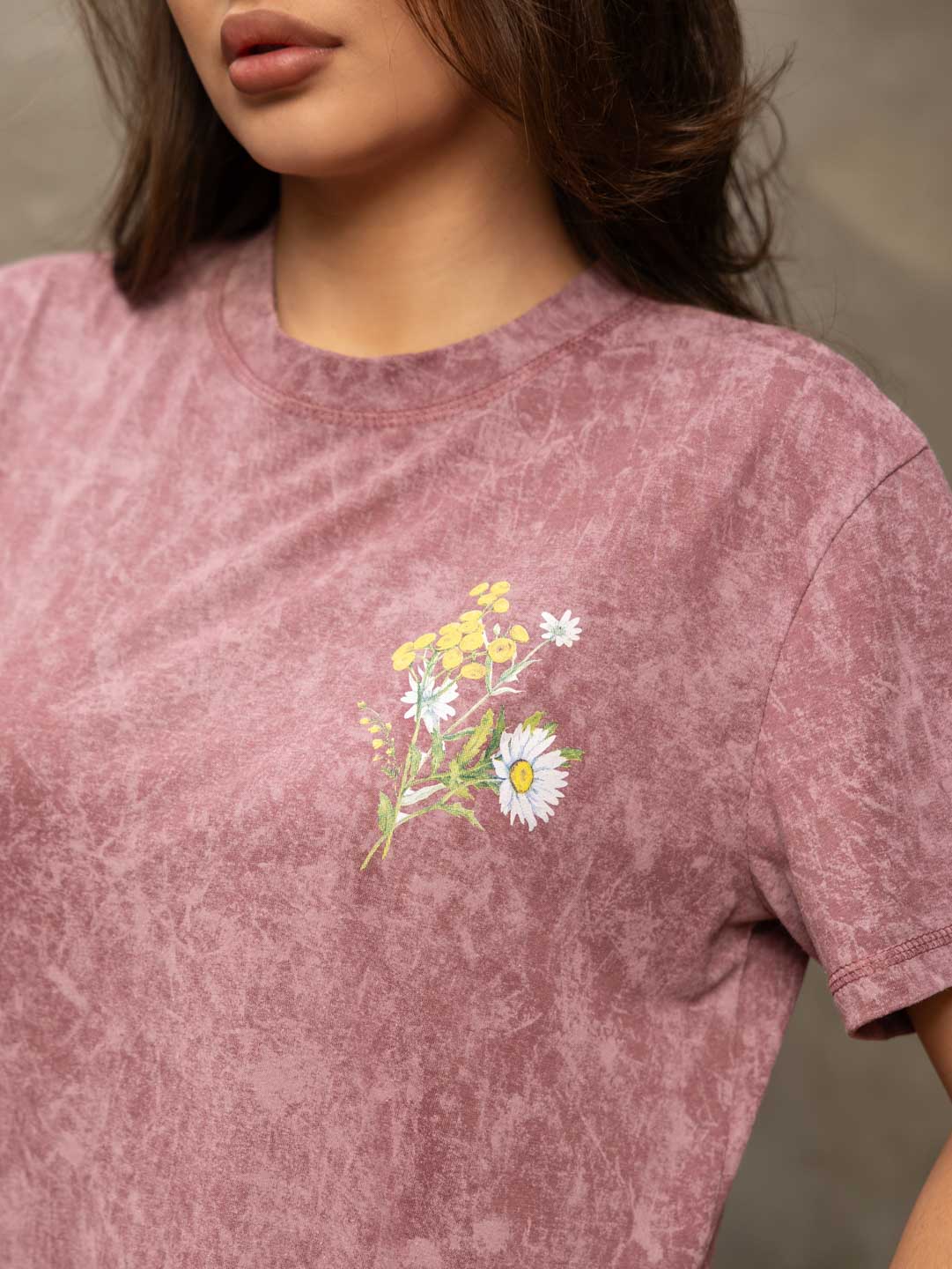 Базовая женская футболка из 100% хлопка с эффектом варенки, умеренного обьема, О-образной горловиной и коротким рукавом. По горловине, рукаву и низу изделия - декоративная строчка. Спереди и сзади нанесен принт "Полевые цветы". Рост модели 167см.