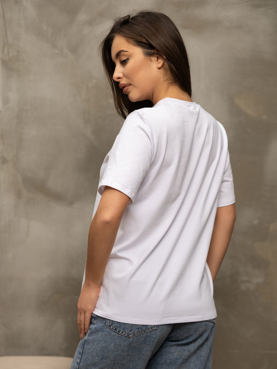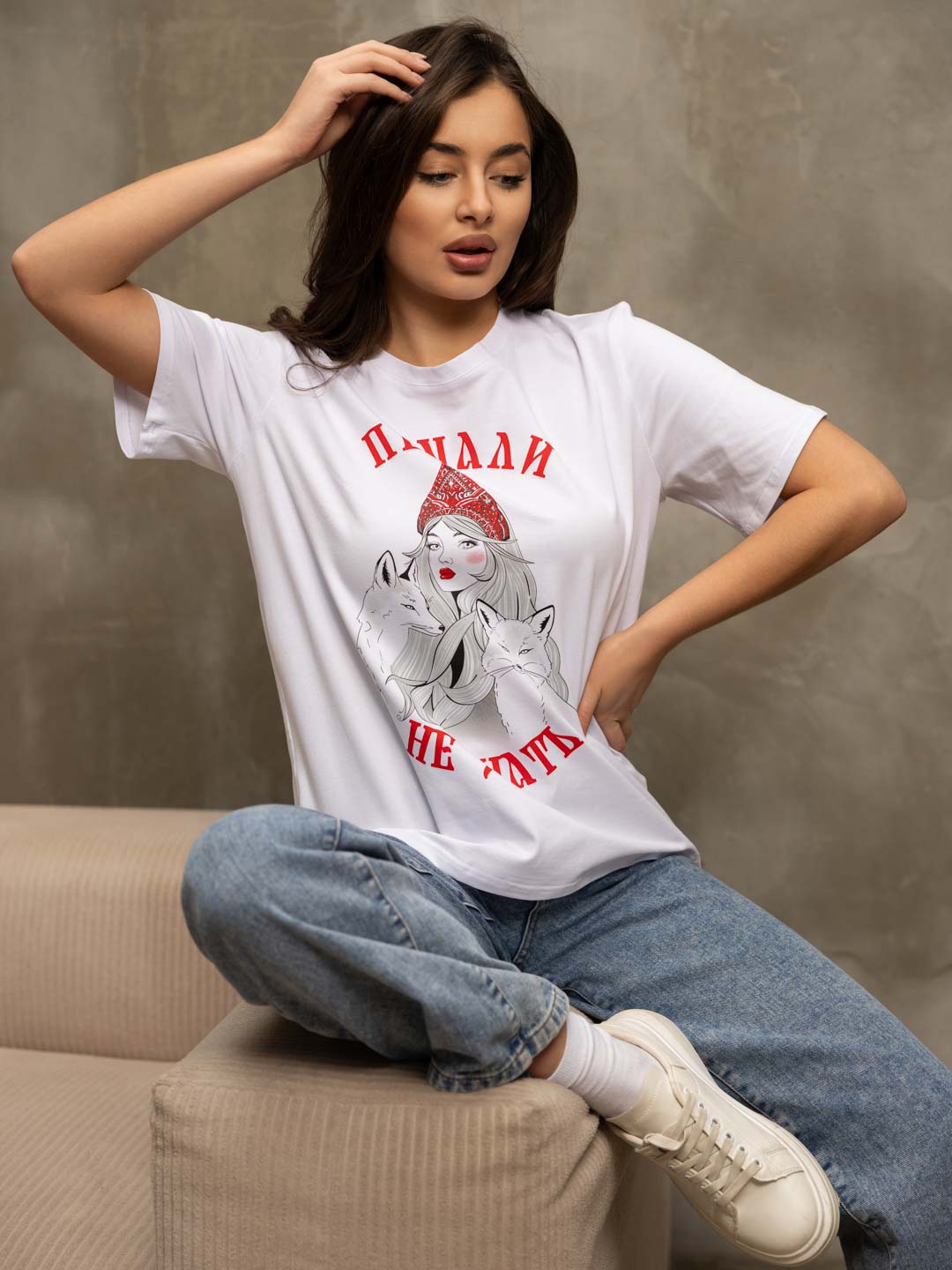 Женская футболка из кулирки с лайкрой высокого качества, базового кроя, с коротким руавом и О-образной горловиной. Печать с нотками патриотизма добавляет изюминку образу.
