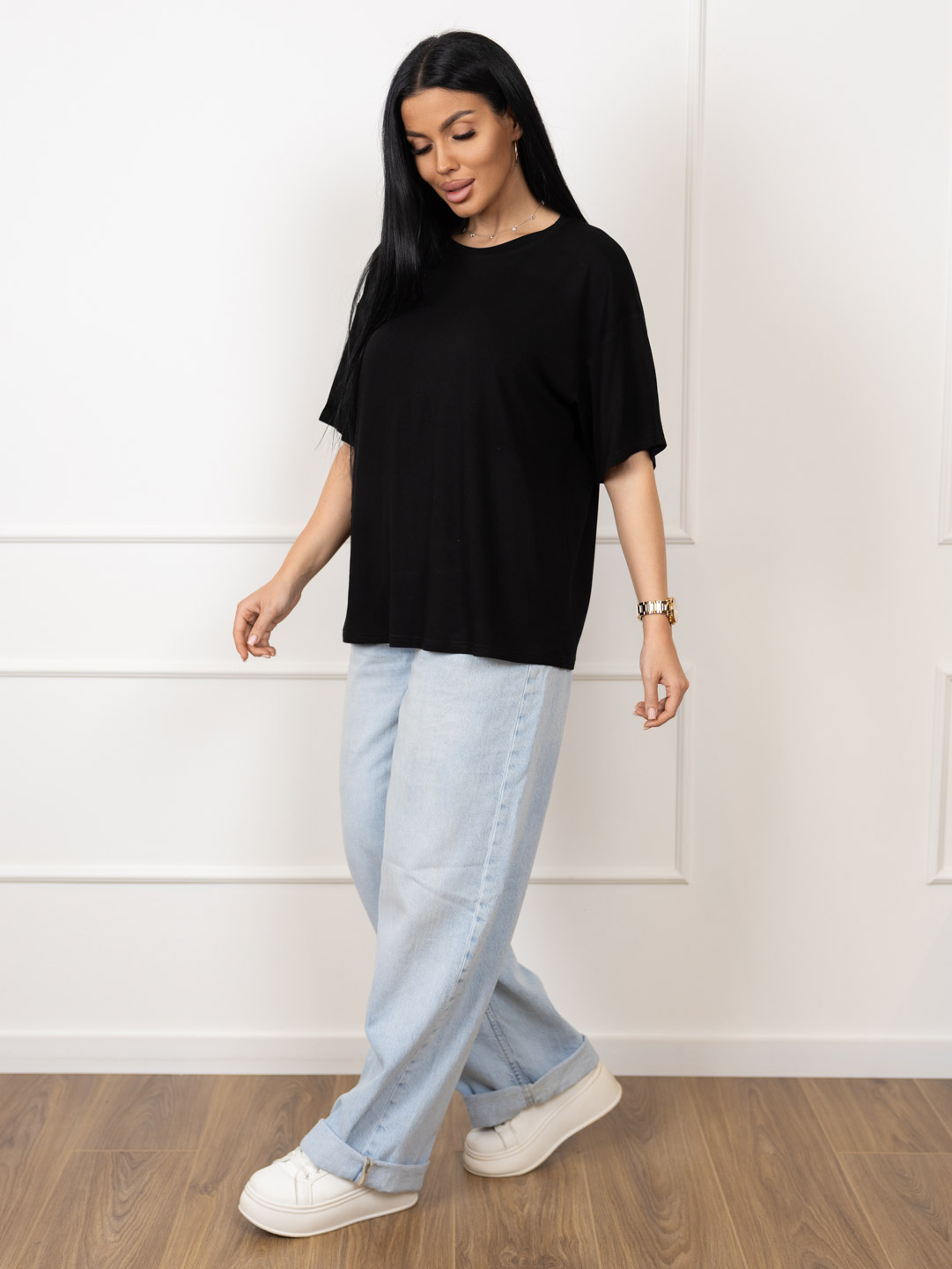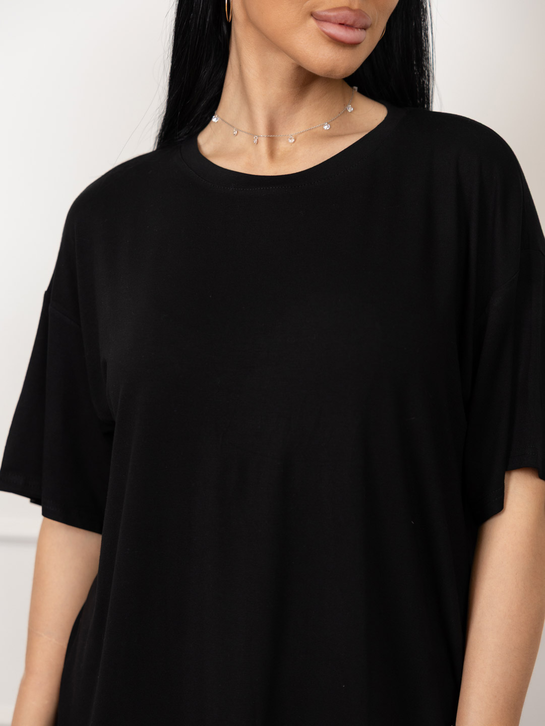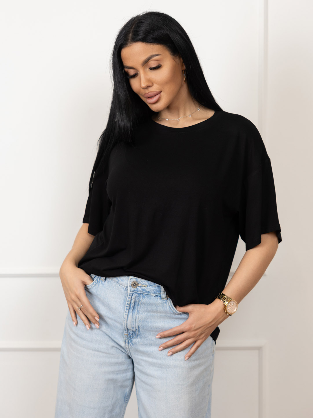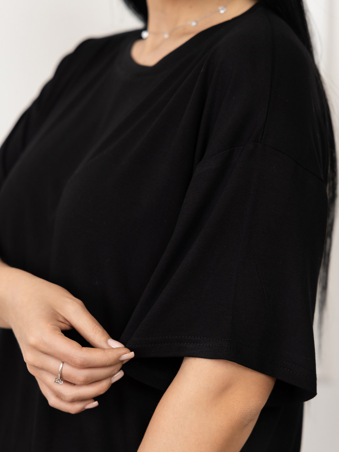 Базовая черная футболка из качественной вискозы, спущенная линия плеча, О-образная горловина