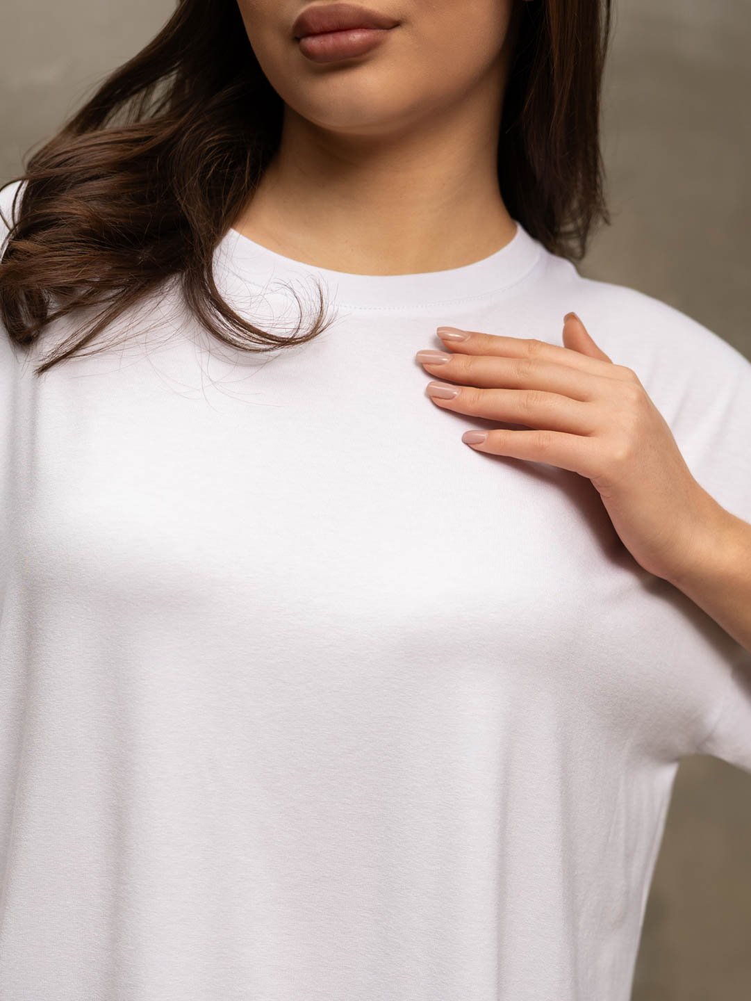 Базовая белая футболка из качественной вискозы, спущенная линия плеча, О-образная горловина, модный силуэт оверсайз. То что нужно в качестве базы под пиджак, кардиган, бомбер.