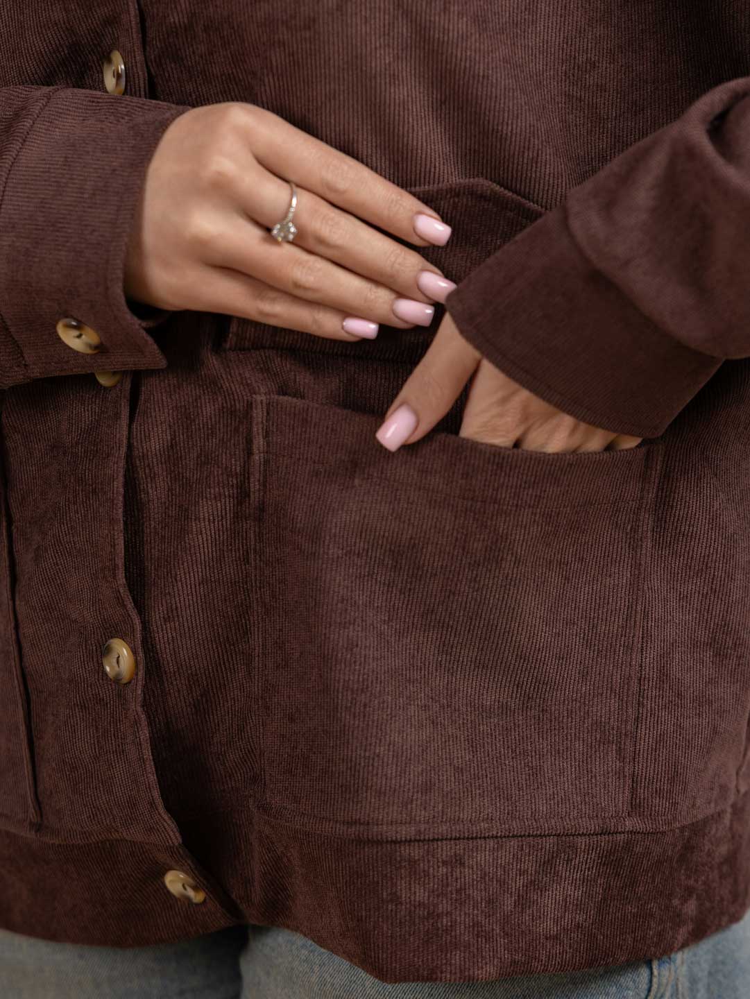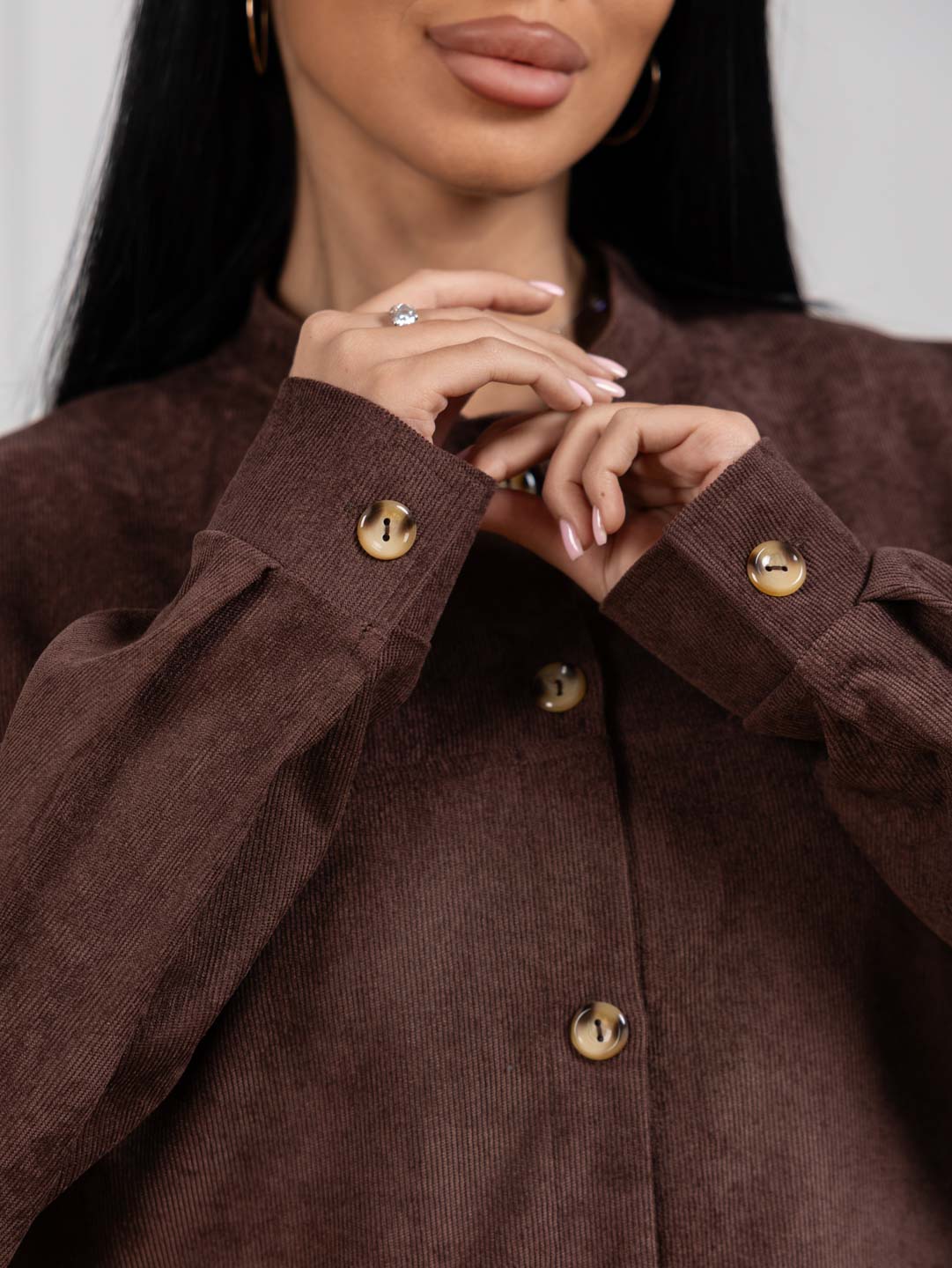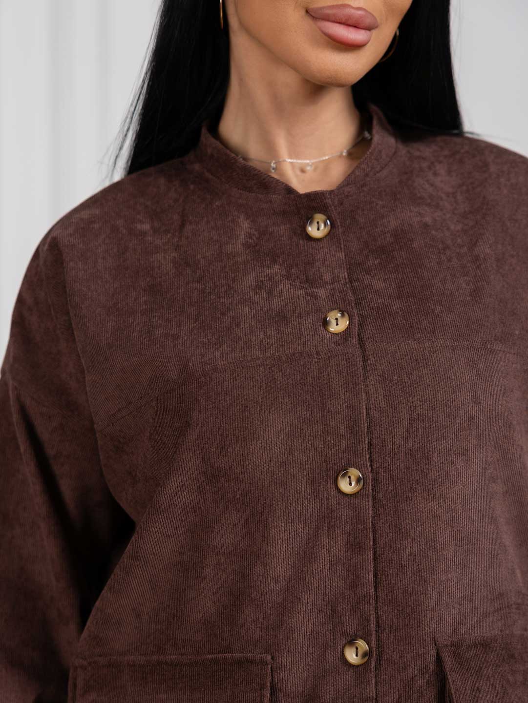Бомбер из микровельвета, на пуговицах с большими накладными карманами, длинным рукавом и манжетой. Рост модели 165см.