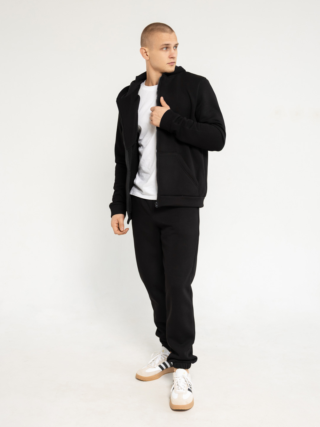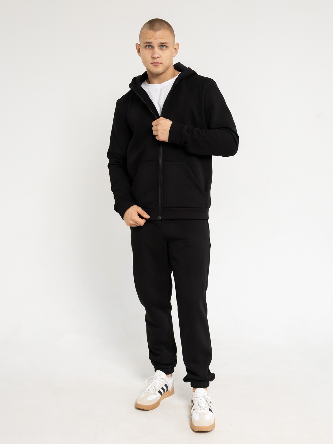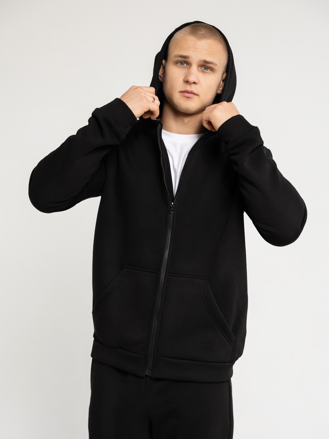Утепленный мужской костюм из футера с начесом, состоящий из худи на молнии и брюк джоггеров. Толстовка с капюшоном и карманом кенгуру - подарит комфорт даже в самый морозный день. Брюки с поясом на резинке и манжетой по низу - защитят Вас от ветра и снега, сохранят тепло. Наш утепленный костюм идеально подойдет для вечерних прогулок и активных занятий спортом на свежем воздухе!