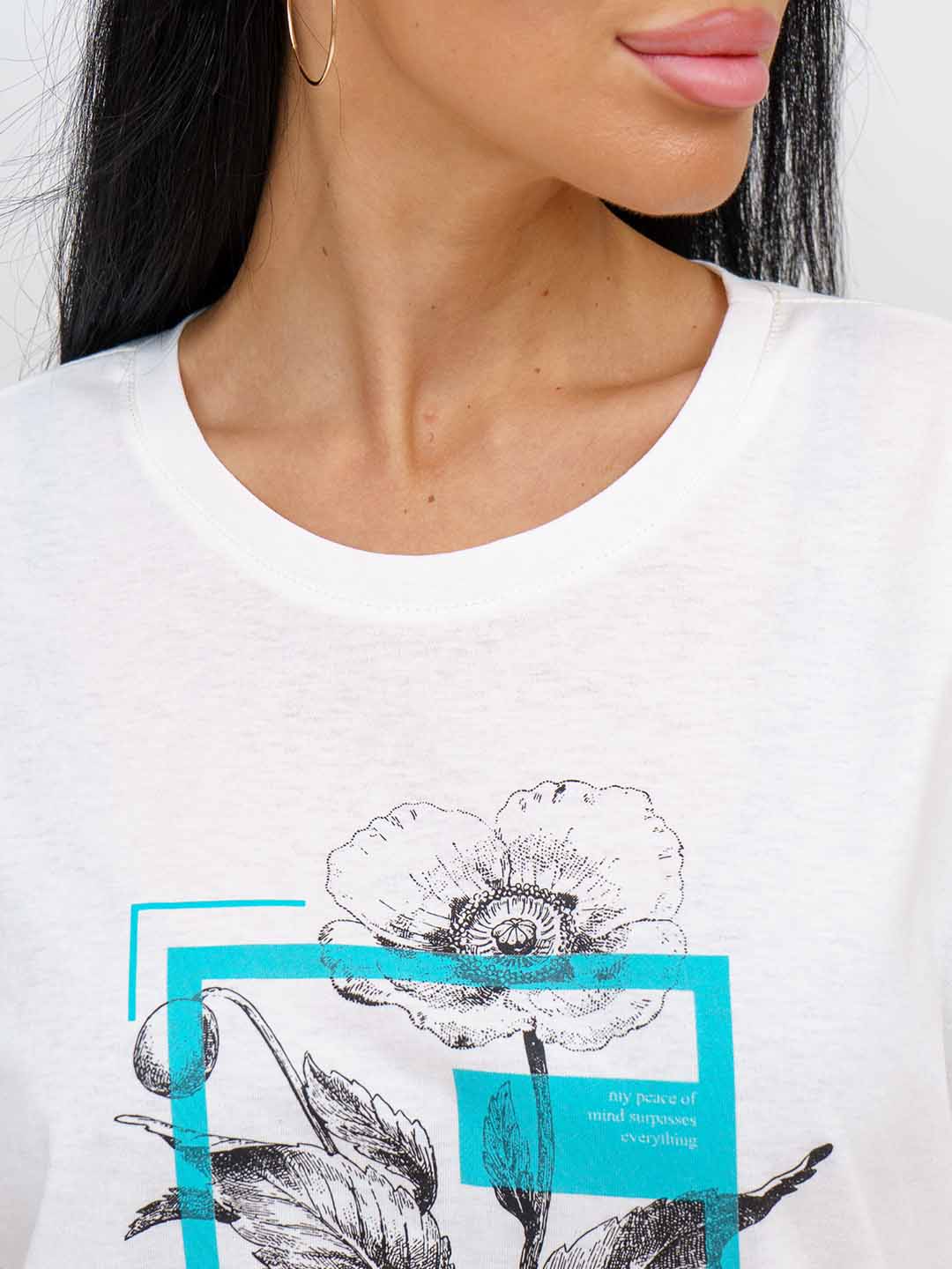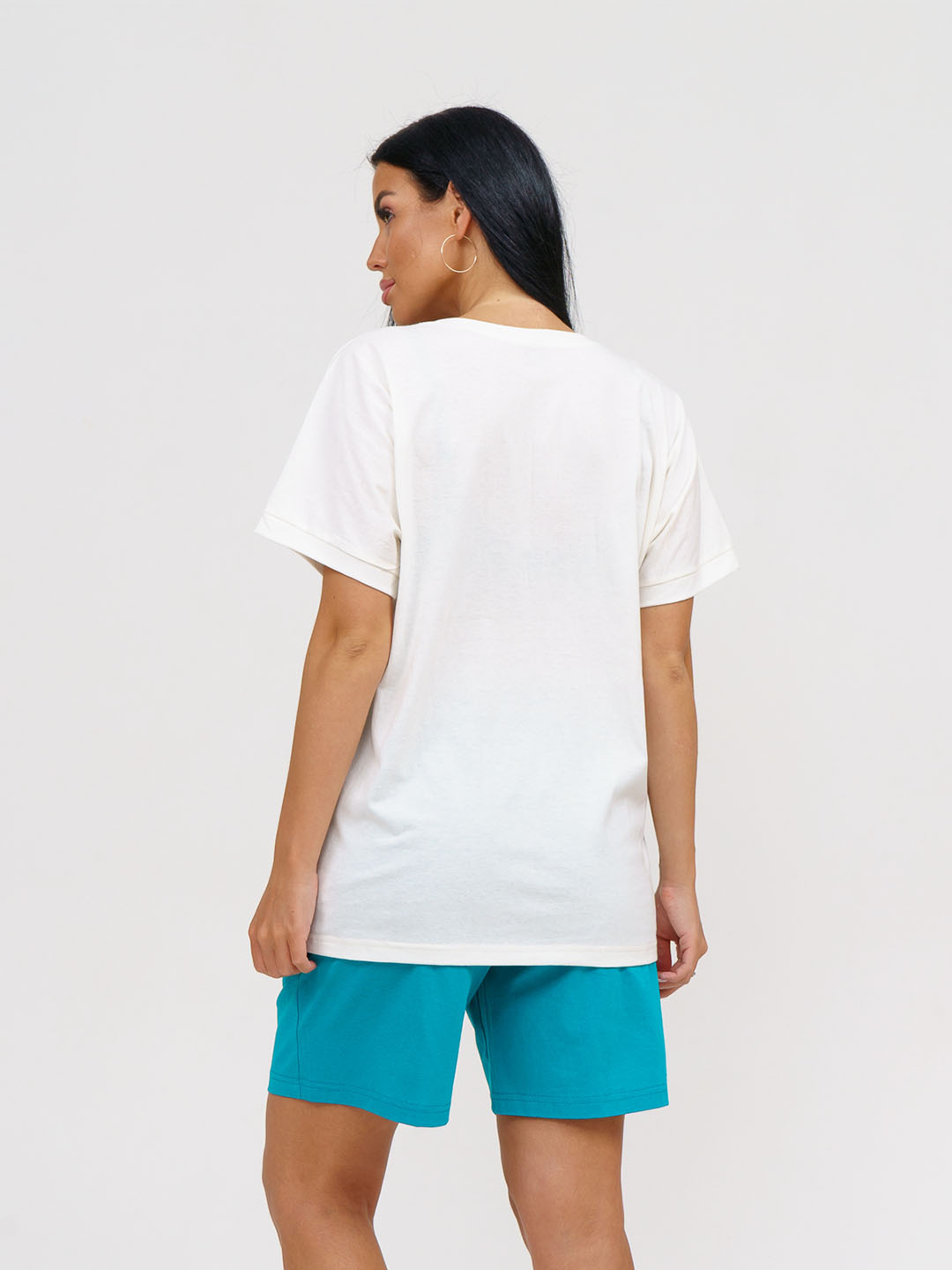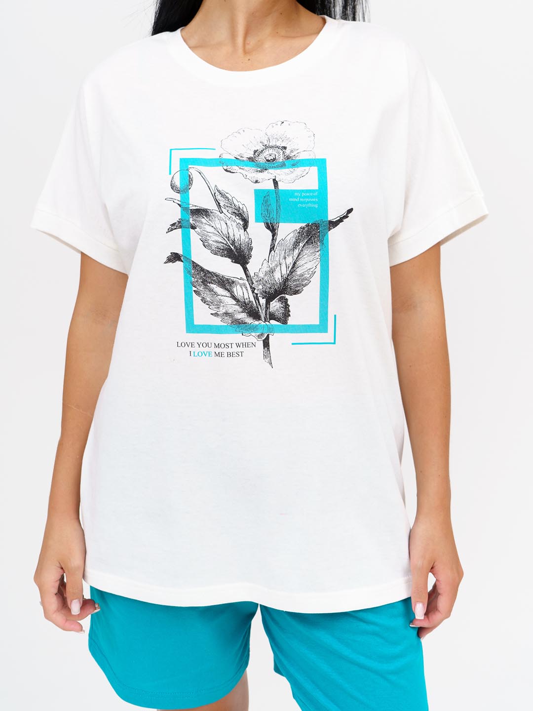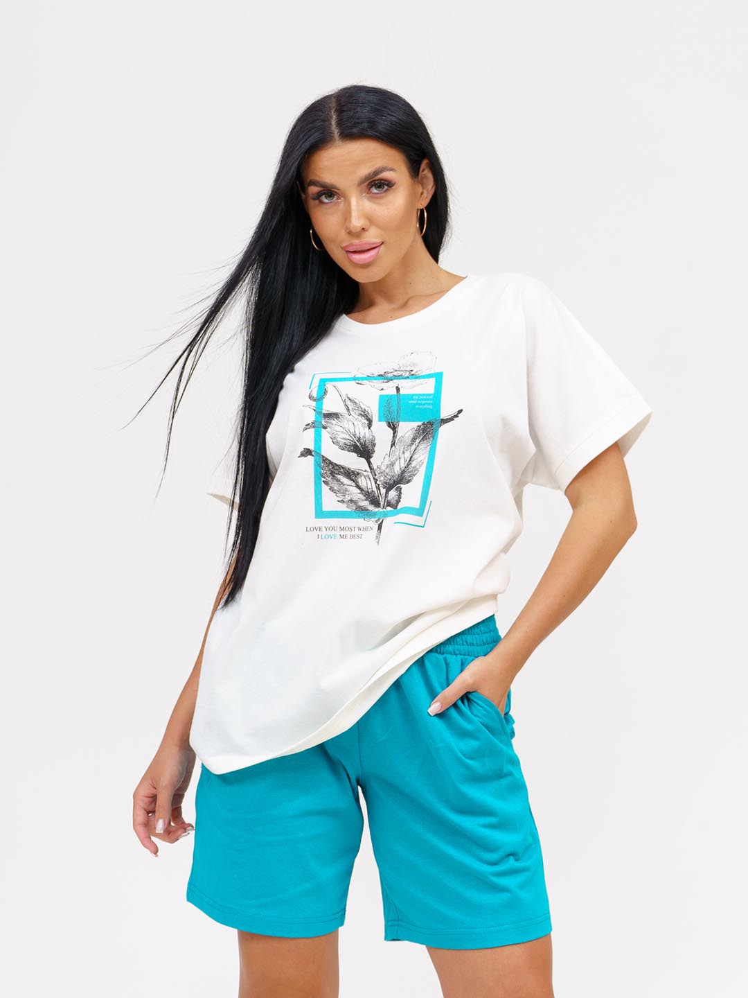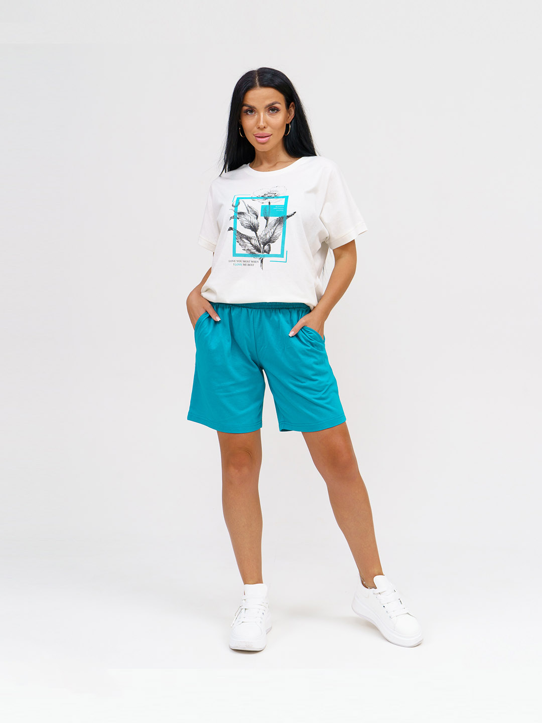Сочетание комфорта и стиля в этом легком и удобном хлопковом трикотажном костюме! Яркий бирюзовый цвет шорт подчеркнет вашу индивидуальность, а белая футболка с оригинальным принтом на груди добавит нотку модного акцента. Идеальный выбор для повседневного летнего гардероба!