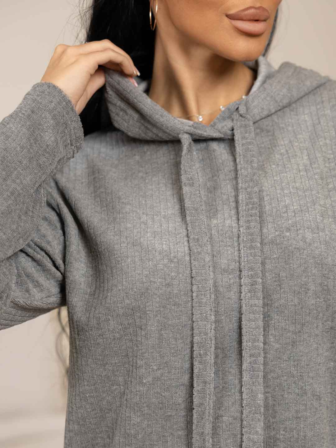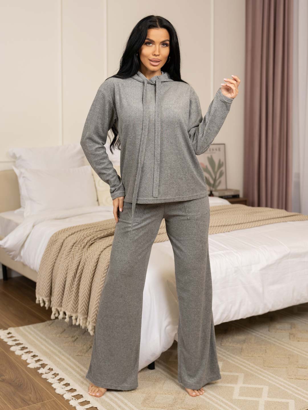 Домашний махровый костюм, идеальный выбор для прохладной погоды. Толстовка свободного силуэта с капюшоном и длинным рукавом, брюки прямого кроя с карманами в боковых швах.