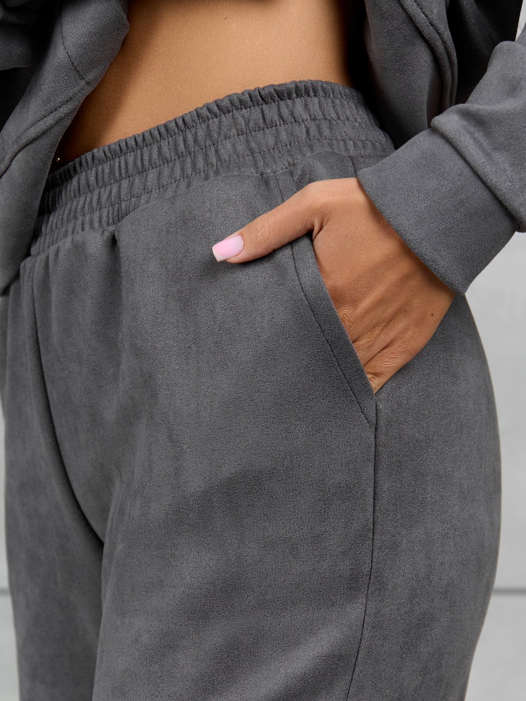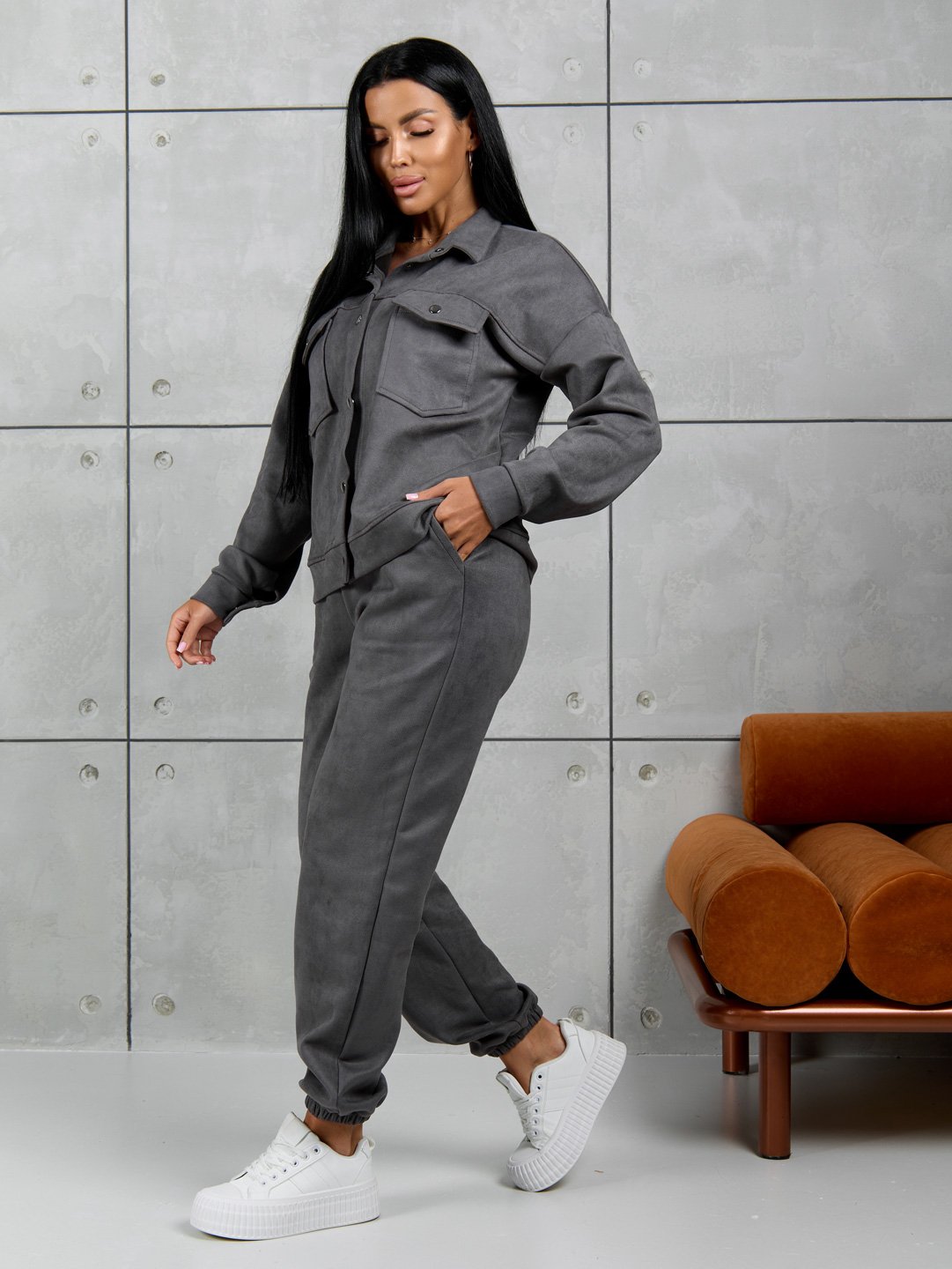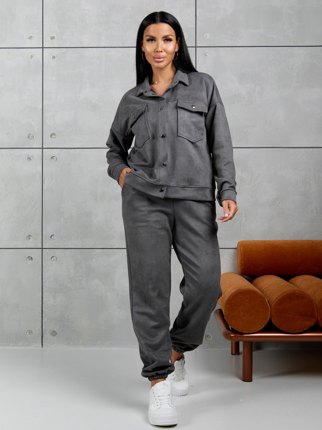 Костюм женский из мягкой, приятной замши. Тренд сезона. Куртка с длинным рукавом, на манжетах. Укомплектована удобными застежками на кнопках. Стильный отложный воротник и накладные карманы делают данную модель еще более эффектной и привлекающей взгляды. Удобные брюки на манжетах, с поясом на резинке и боковыми карманами.