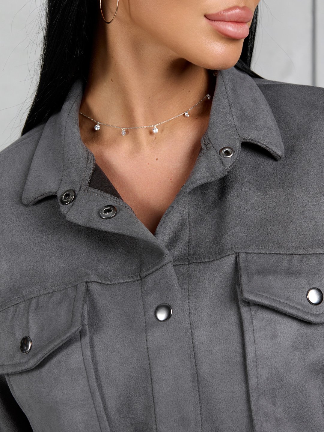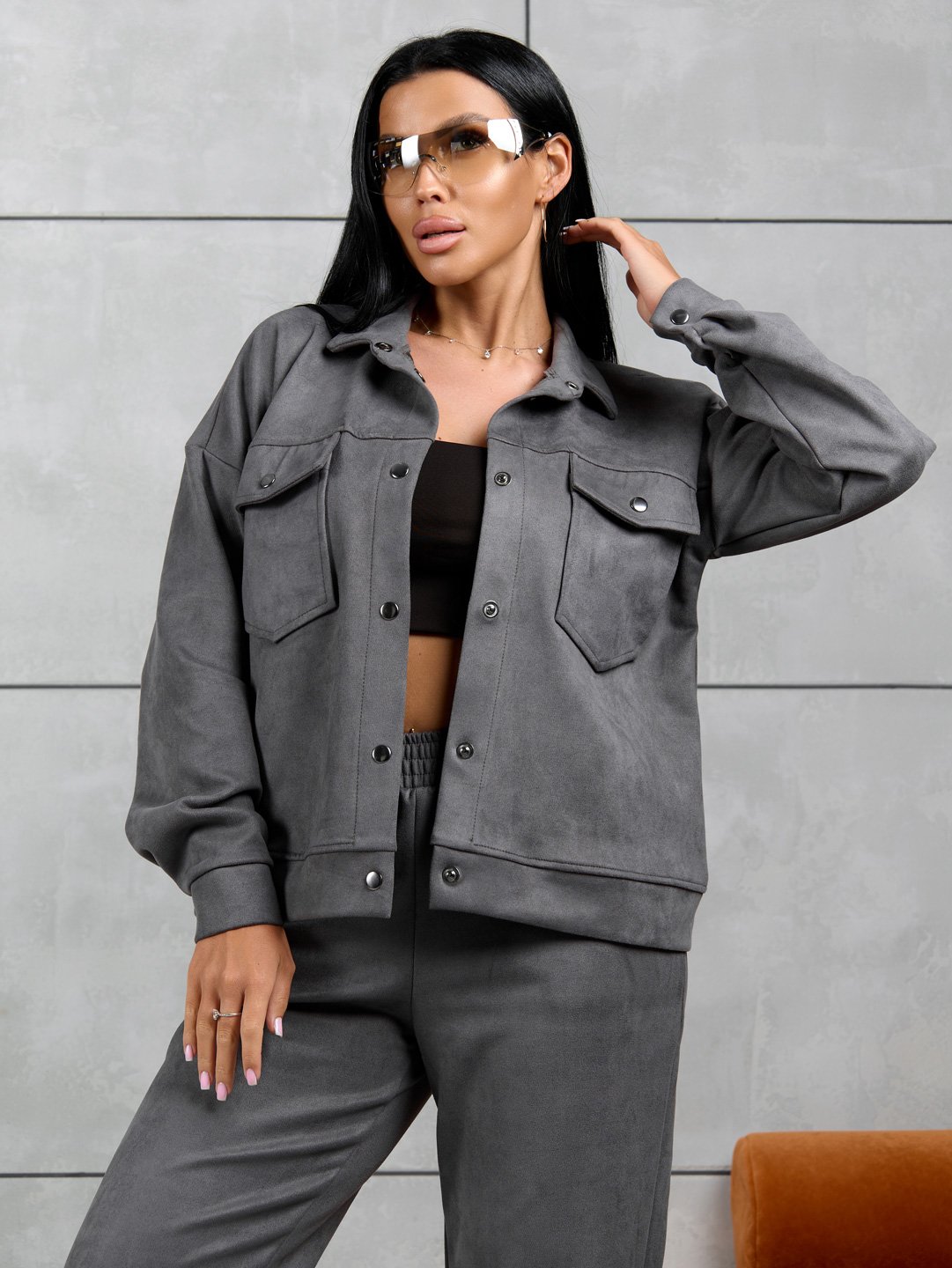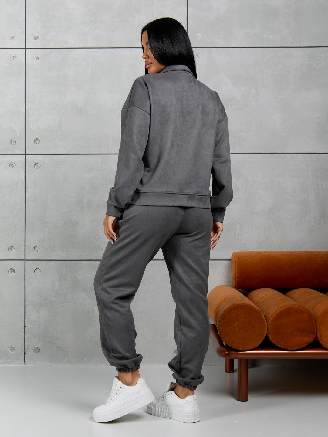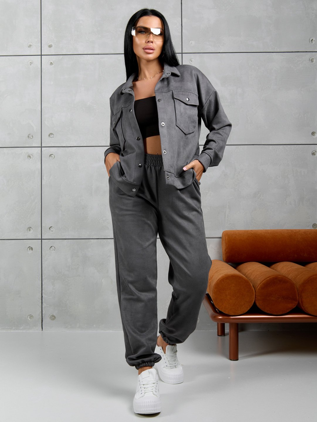 Костюм женский из мягкой, приятной замши. Тренд сезона. Куртка с длинным рукавом, на манжетах. Укомплектована удобными застежками на кнопках. Стильный отложный воротник и накладные карманы делают данную модель еще более эффектной и привлекающей взгляды. Удобные брюки на манжетах, с поясом на резинке и боковыми карманами.