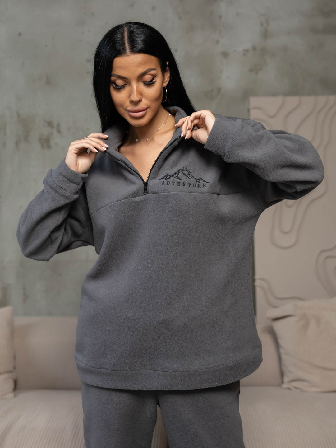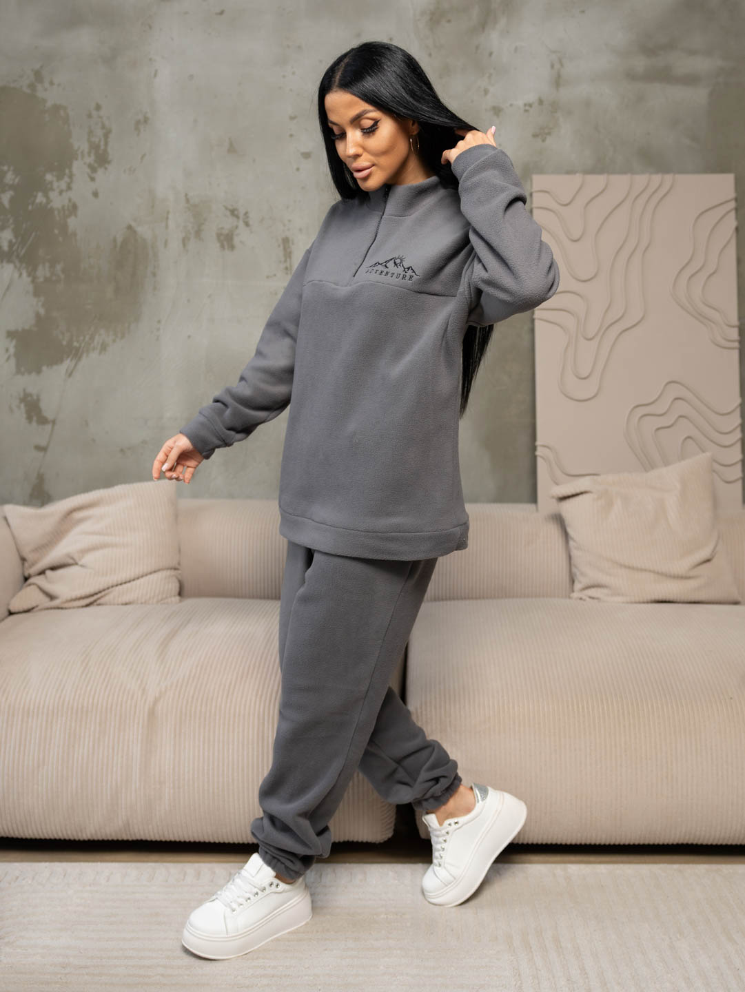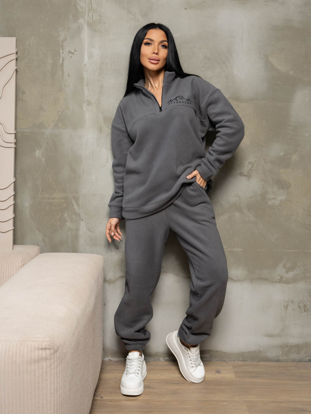 Костюм женский утепленный. Худи в стиле "оверсайз", с воротником - стойка на молнии, спущенным рукавом на манжетах и вышивкой на груди. Брюки - прямые, с удобным поясом на резинке, для лучшей посадки, и глубокими карманами с отрезным бочком. Низ брюк на резинке. Данный костюм - это уникальное сочетание стиля и комфорта в одной модели.