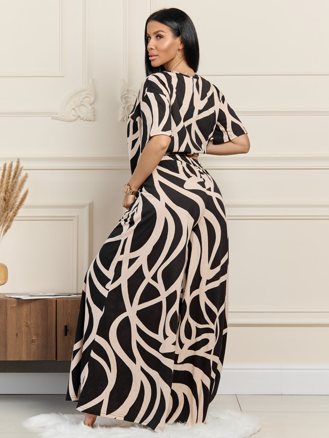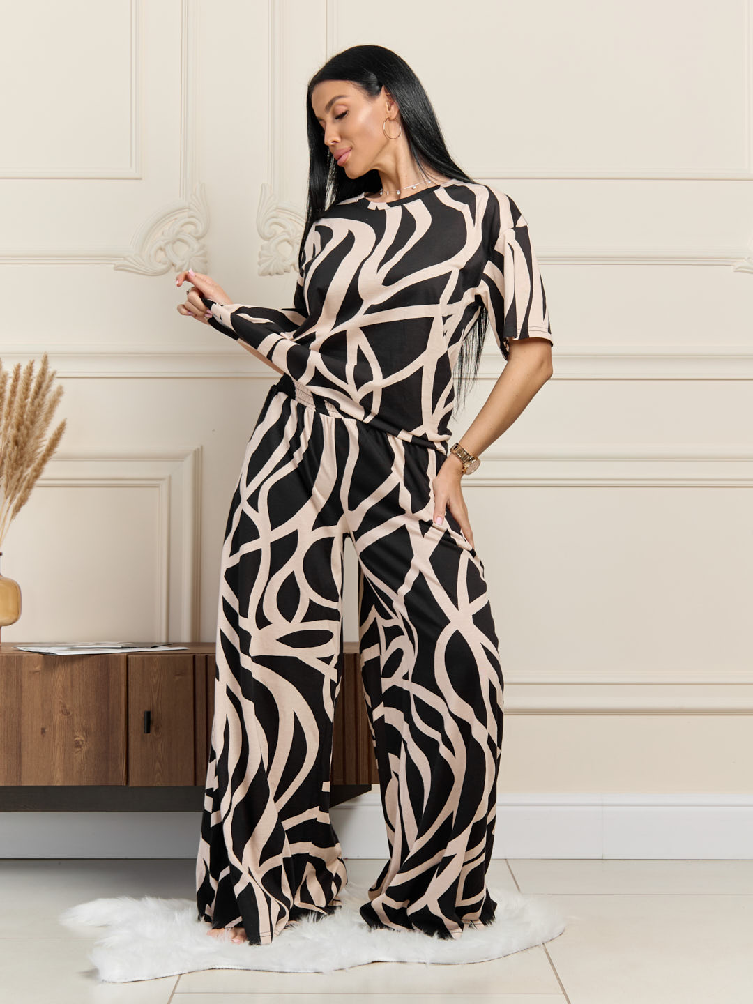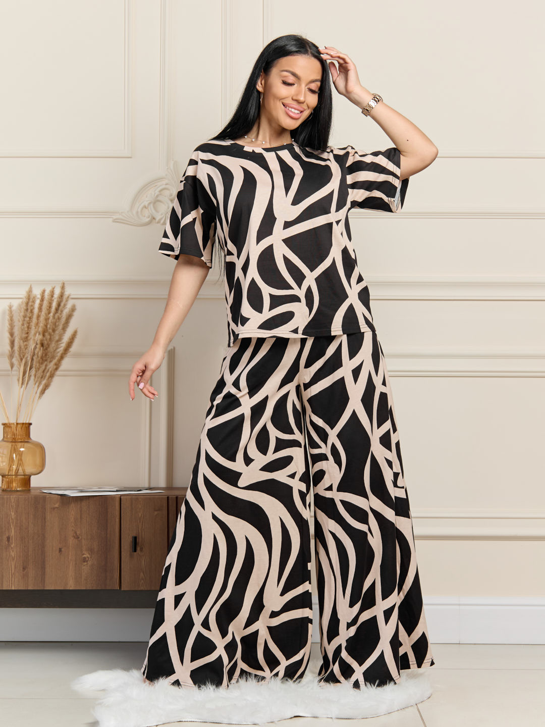 Элегентный домашний костюм из хлопка. Футболка с О-образной горловиной, спущенной линией плеча и коротким рукавом. Брюки-солнце с карманами и поясом на резинке.