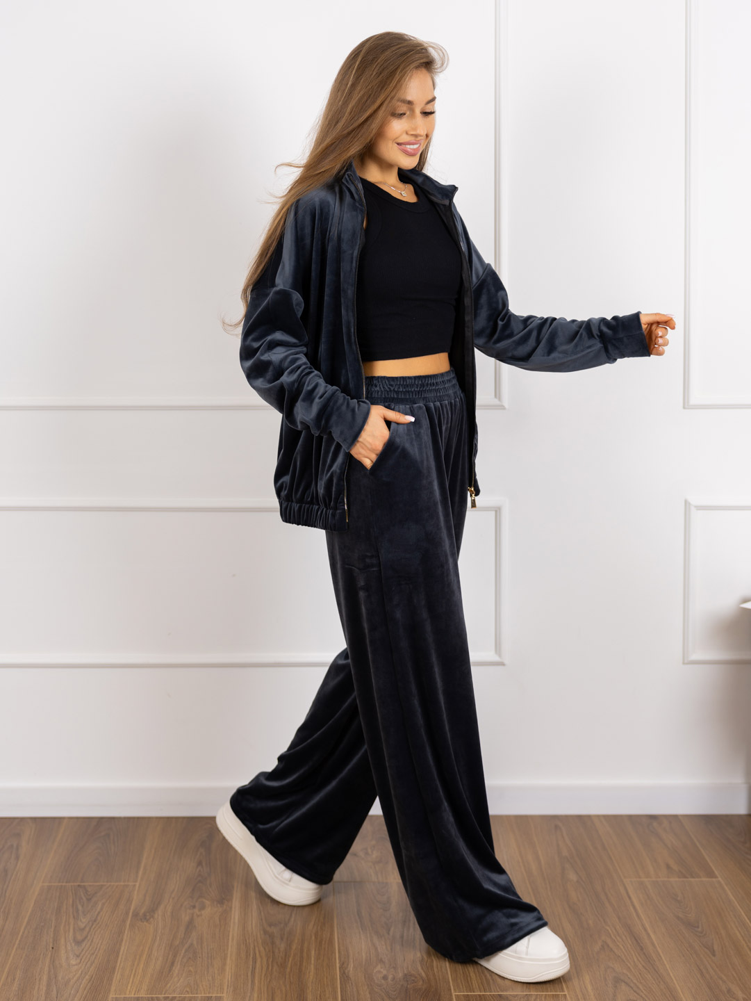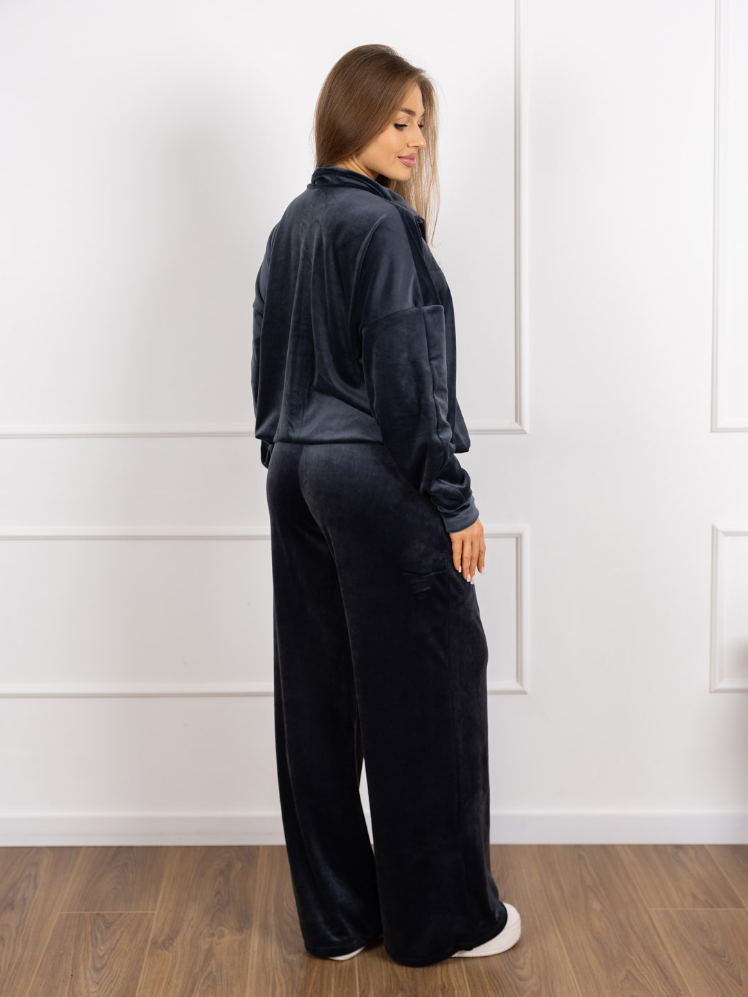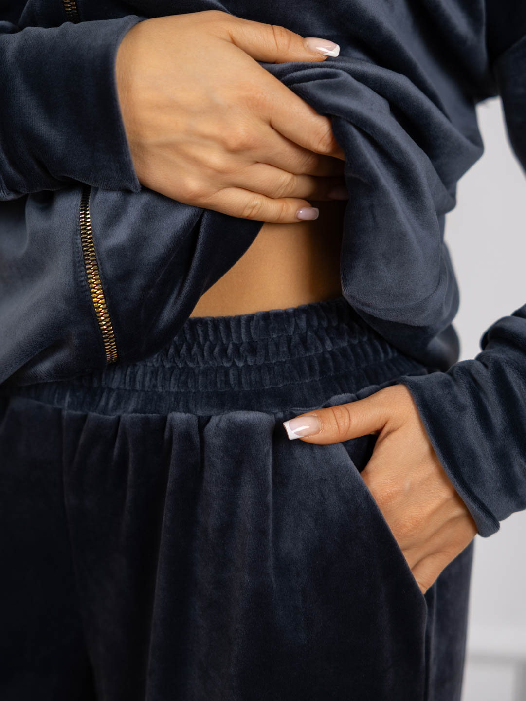 Женский велюровый костюм: худи и брюки из приятного к телу материала с качественной фурнитурой. Толстовка с воротником стойкой окантованной внутри , спущенным плечом, широкой манжетой по рукаву и резинкой по низу изделия. Брюки на поясе-резинке с несколькими декоративным строчками, карманами в боковых швах с отрезным бочком и затяжкой по низу брюк.