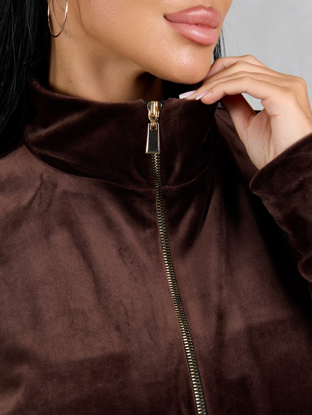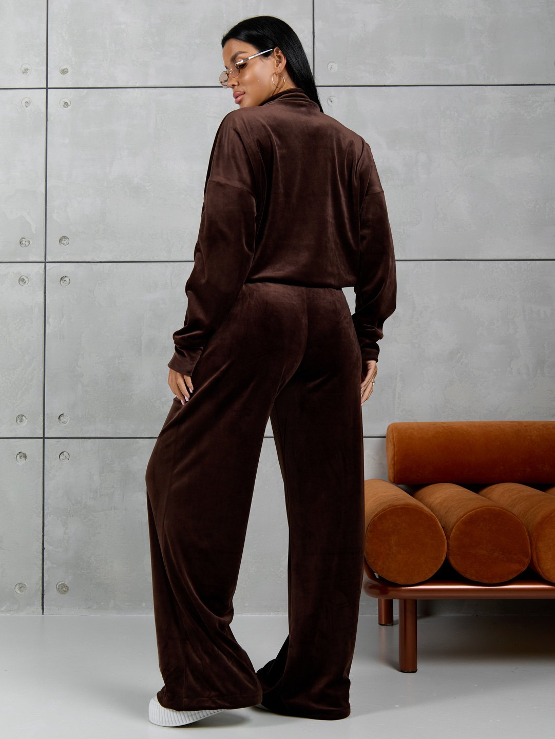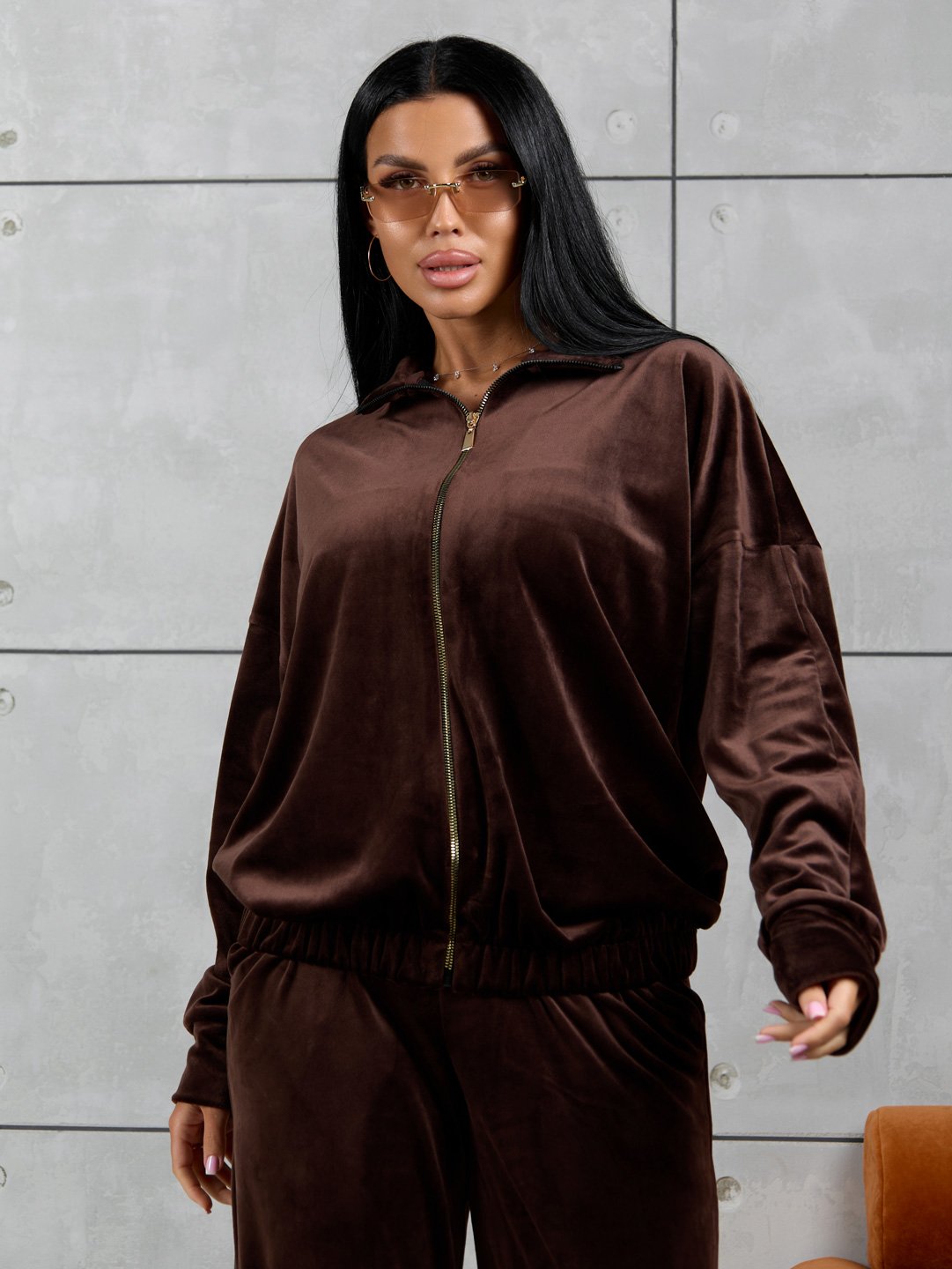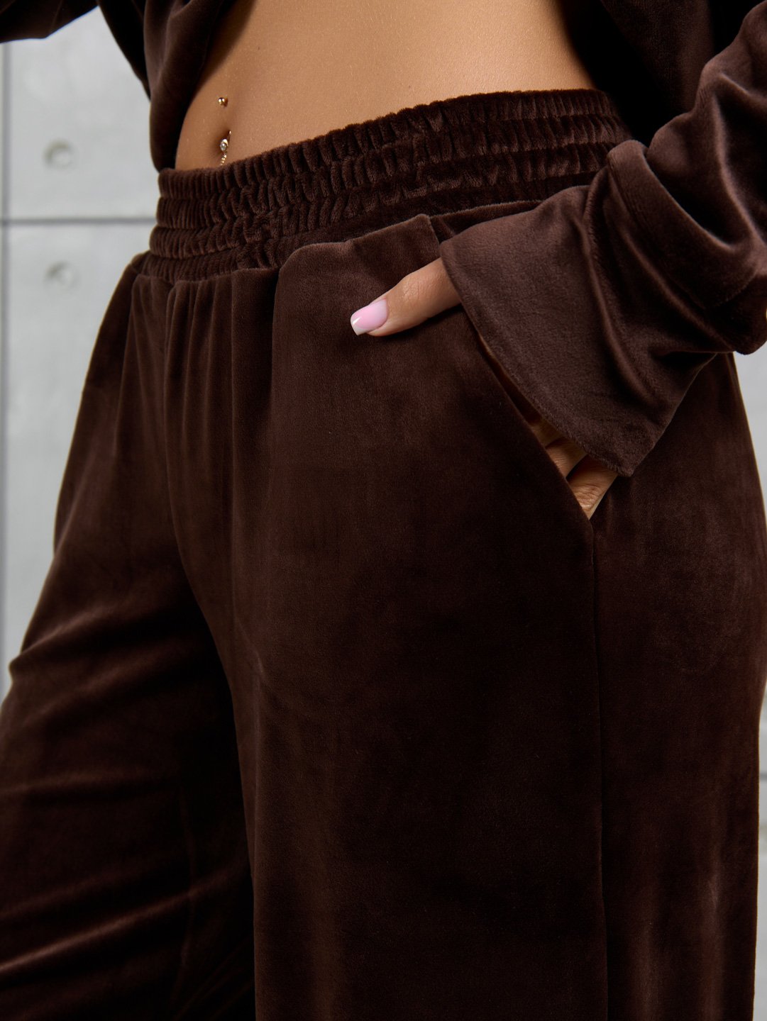 Женский велюровый костюм: худи и брюки из приятного к телу материала с качественной фурнитурой. Толстовка с воротником стойкой окантованной внутри , спущенным плечом, широкой манжетой по рукаву и резинкой по низу изделия. Брюки на поясе-резинке с несколькими декоративным строчками, карманами в боковых швах с отрезным бочком и затяжкой по низу брюк.