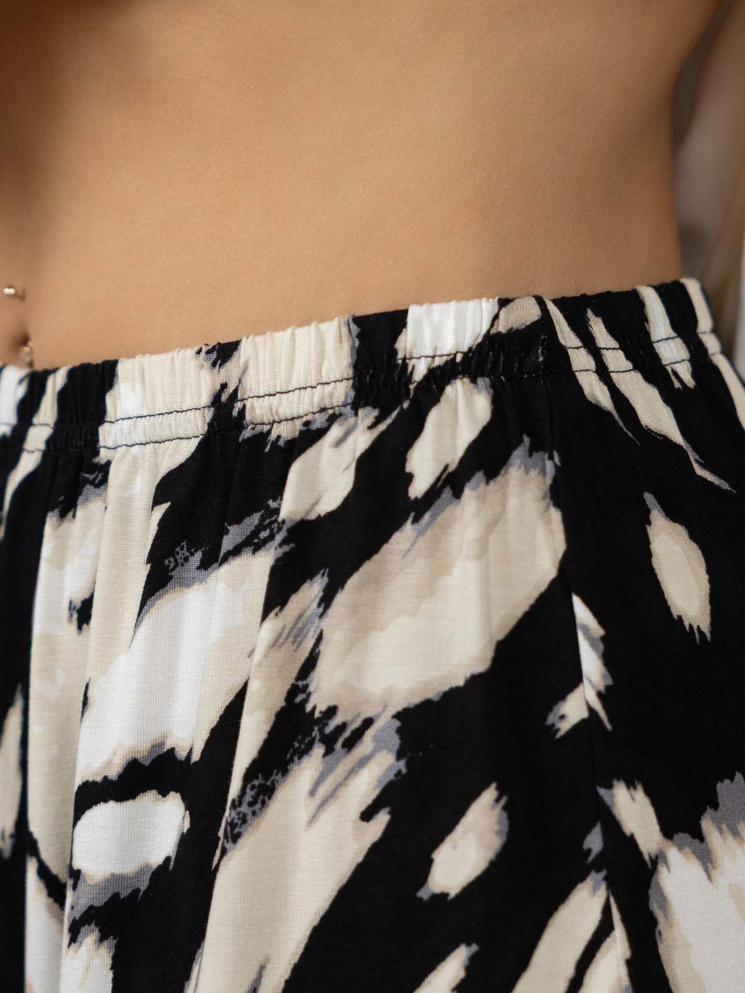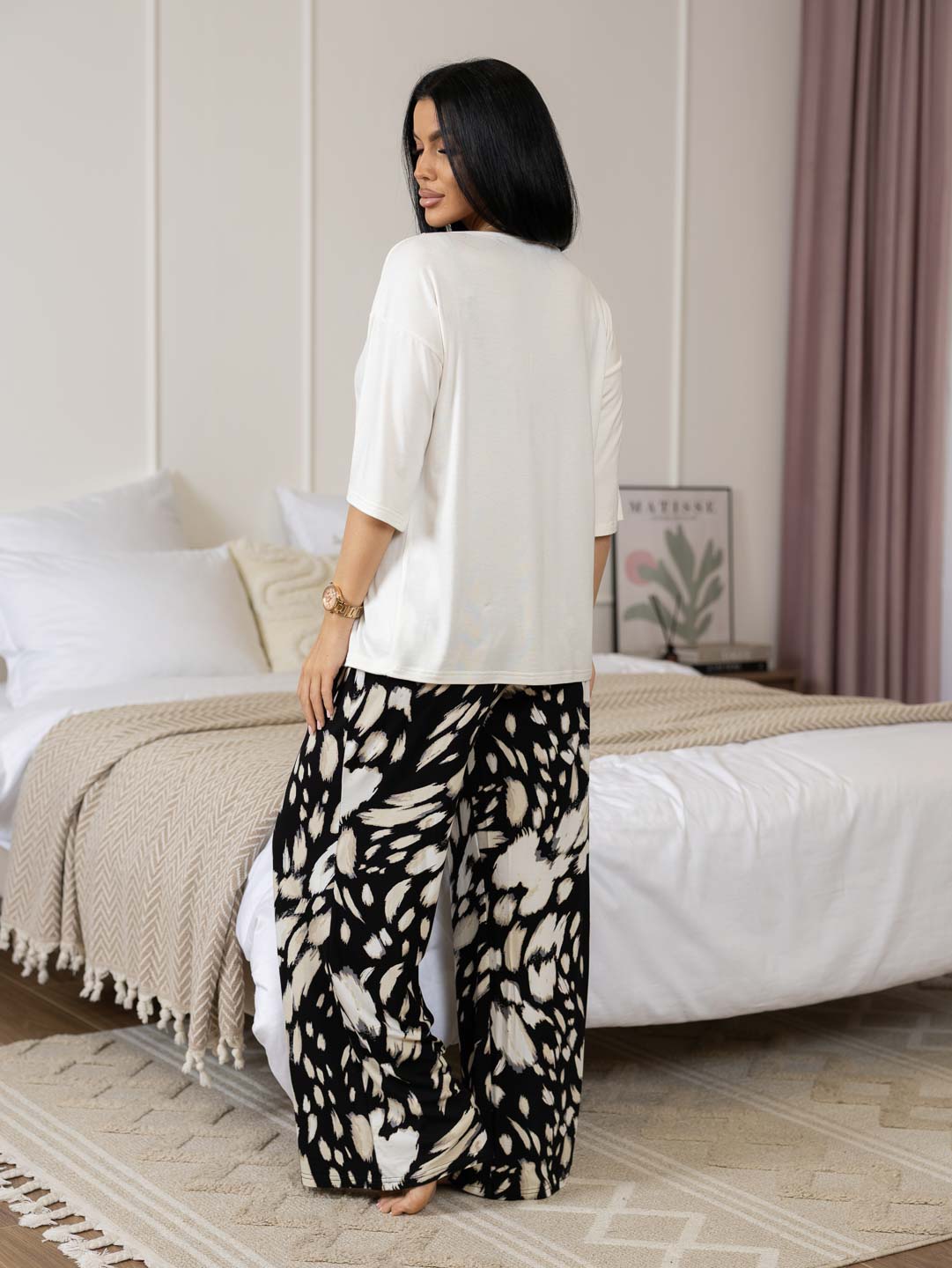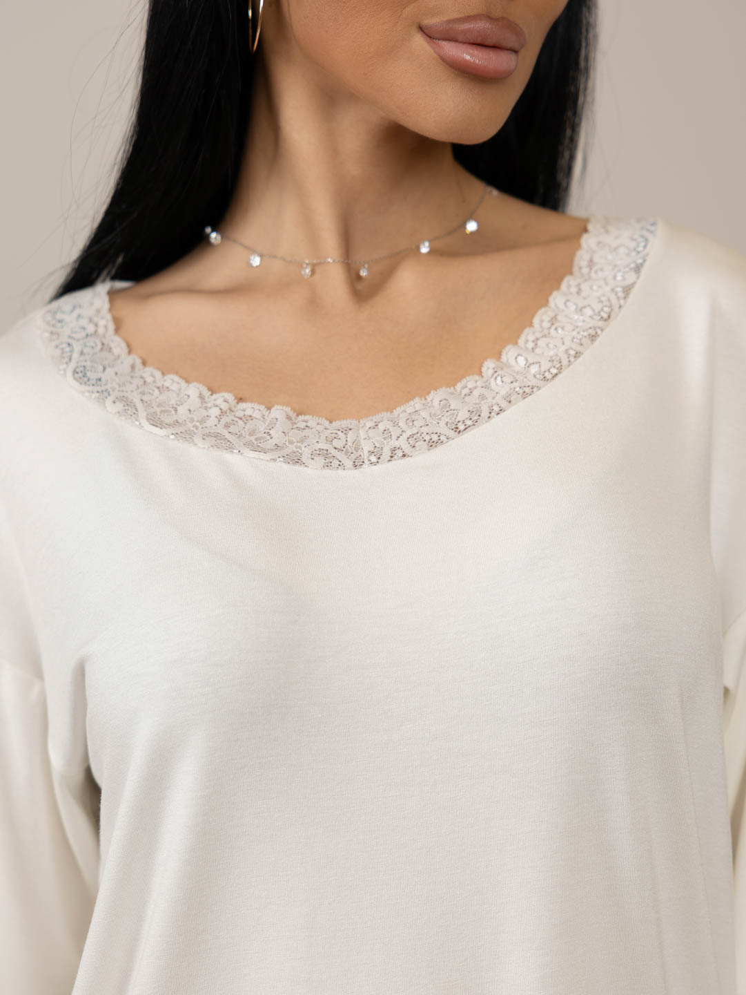 Костюм из вискозы с брюками и футболкой. Футболка со спущенным рукавом и кружевом по горловине. Широкие брюки на резинке.