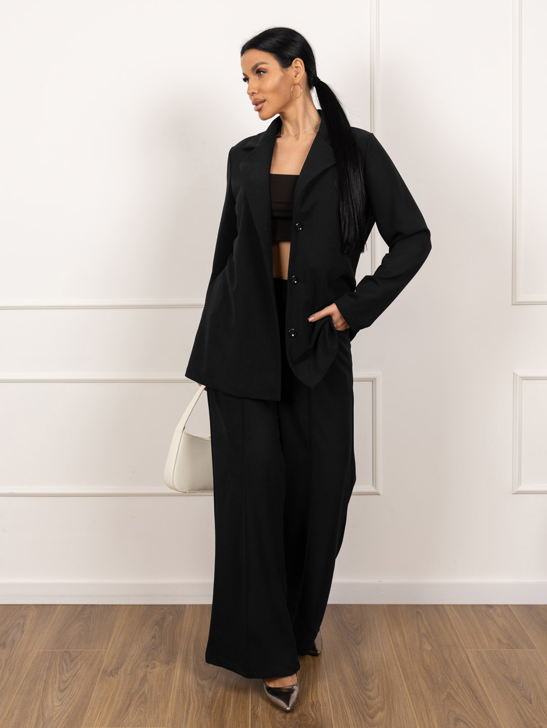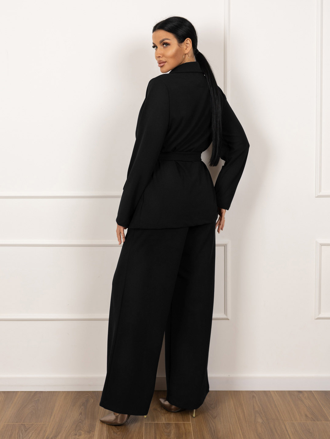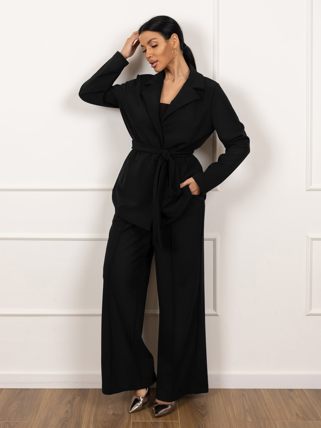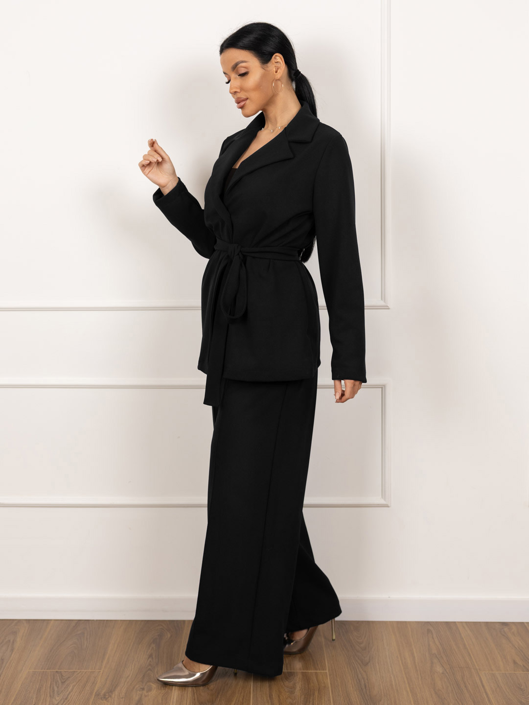 Женский брючный костюм из крепа. Верх - однобортный пиджак без подкладки, с застежкой на 3 пуговицы, втачным рукавом базового кроя и поясом кушаком. Брюки на резинке (сзади), спереди имитация гульфика и стрелки, карманы в боковых швах.