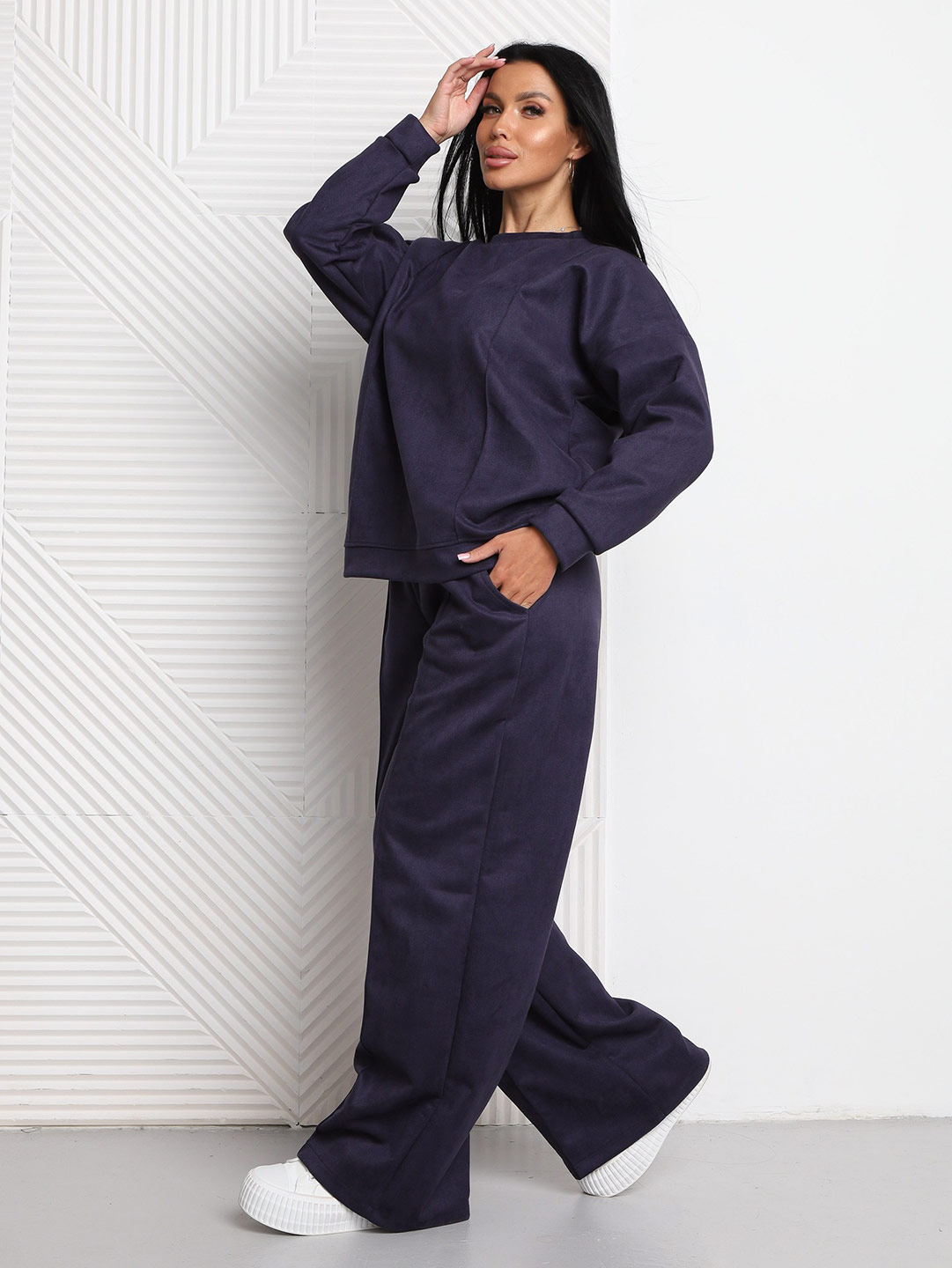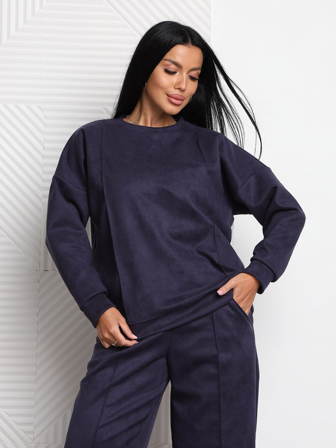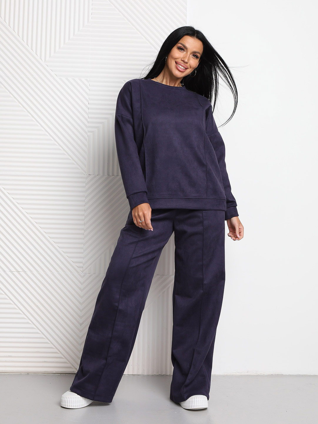 Брючный замшевый костюм из качественного приятного на ощупь полотна. Толстовка выполнена в стиле спорт шик со спущенным плечом, О-образной горловиной, стрелками на полочке и манженой по низу изделия и рукаву. Брюки прямого кроя, со стрелками и карманами в боковых швах, полной длины.
