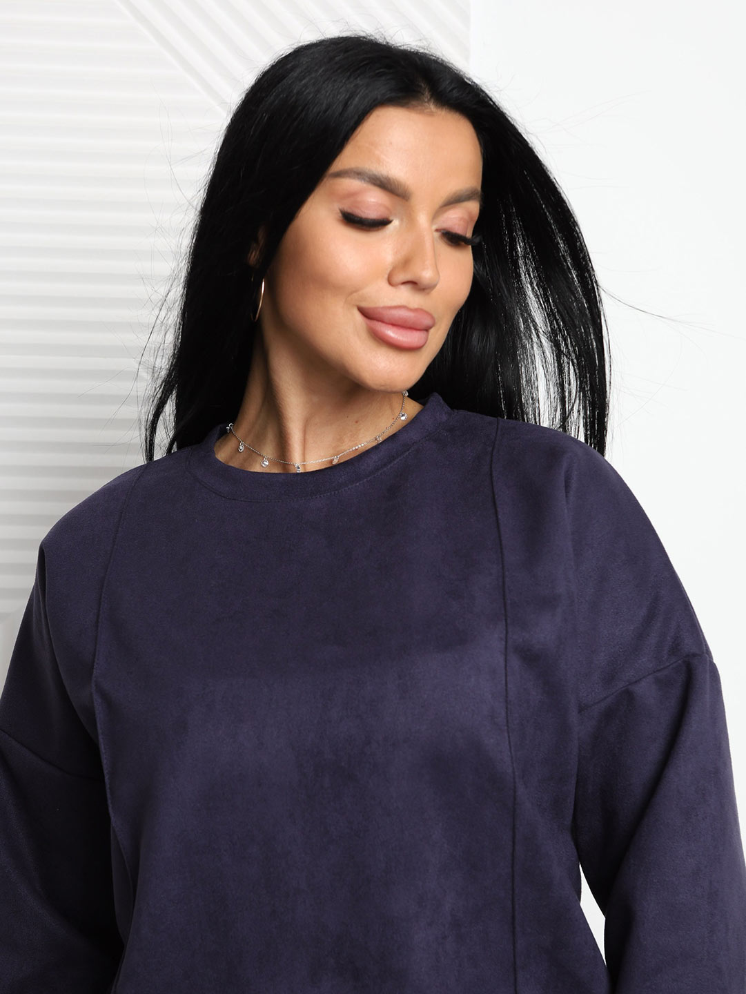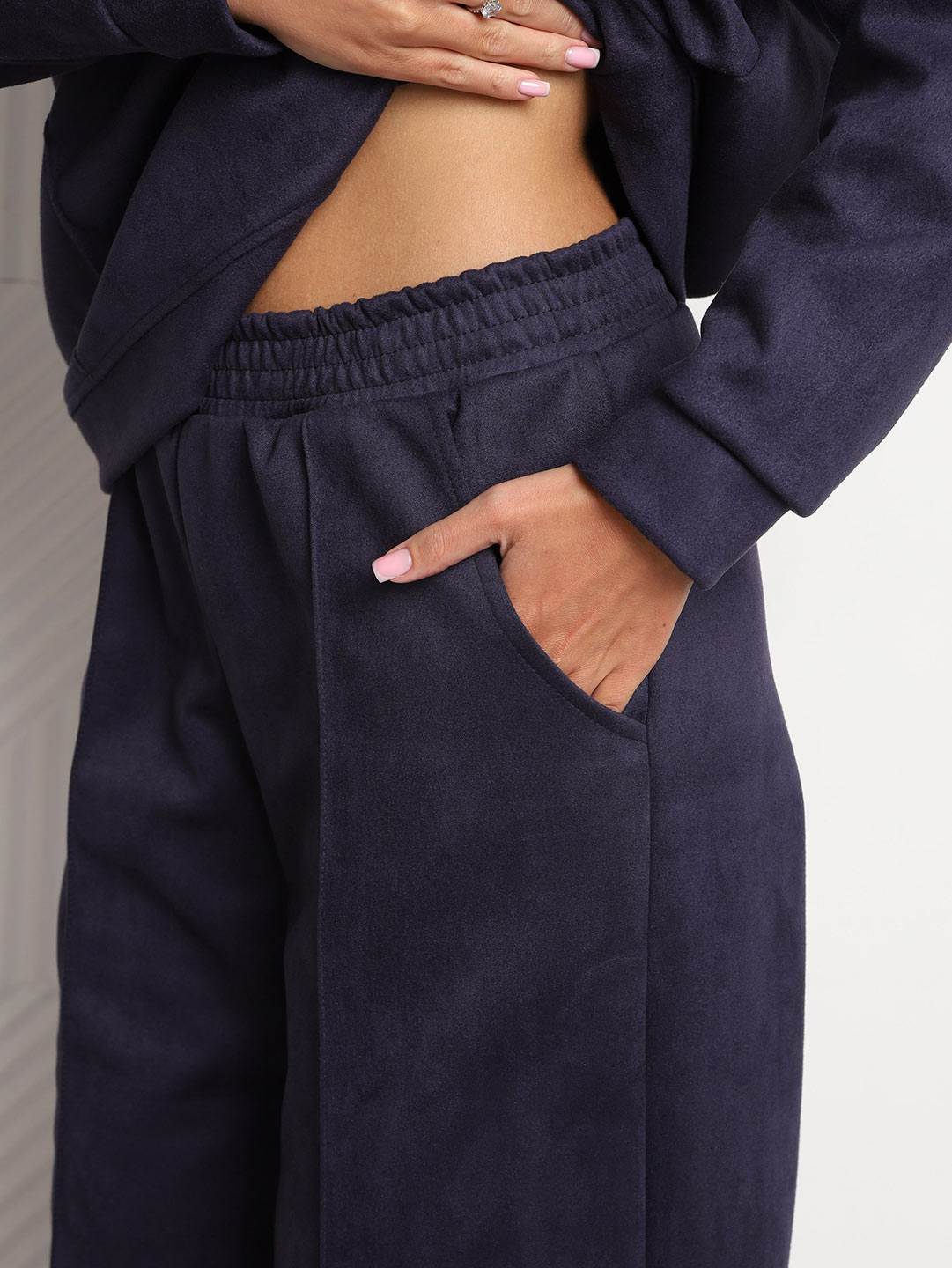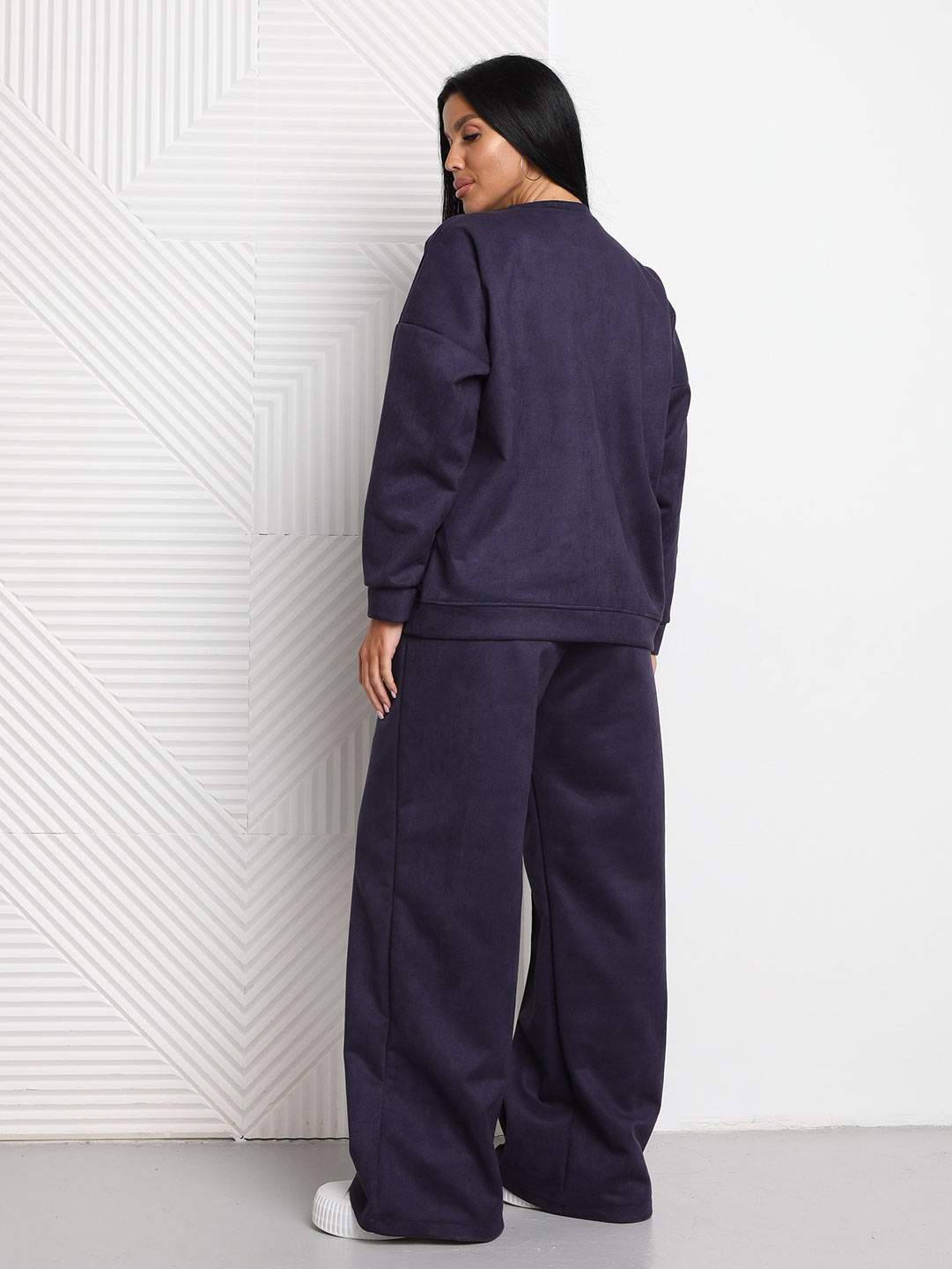 Брючный замшевый костюм из качественного приятного на ощупь полотна. Толстовка выполнена в стиле спорт шик со спущенным плечом, О-образной горловиной, стрелками на полочке и манженой по низу изделия и рукаву. Брюки прямого кроя, со стрелками и карманами в боковых швах, полной длины.