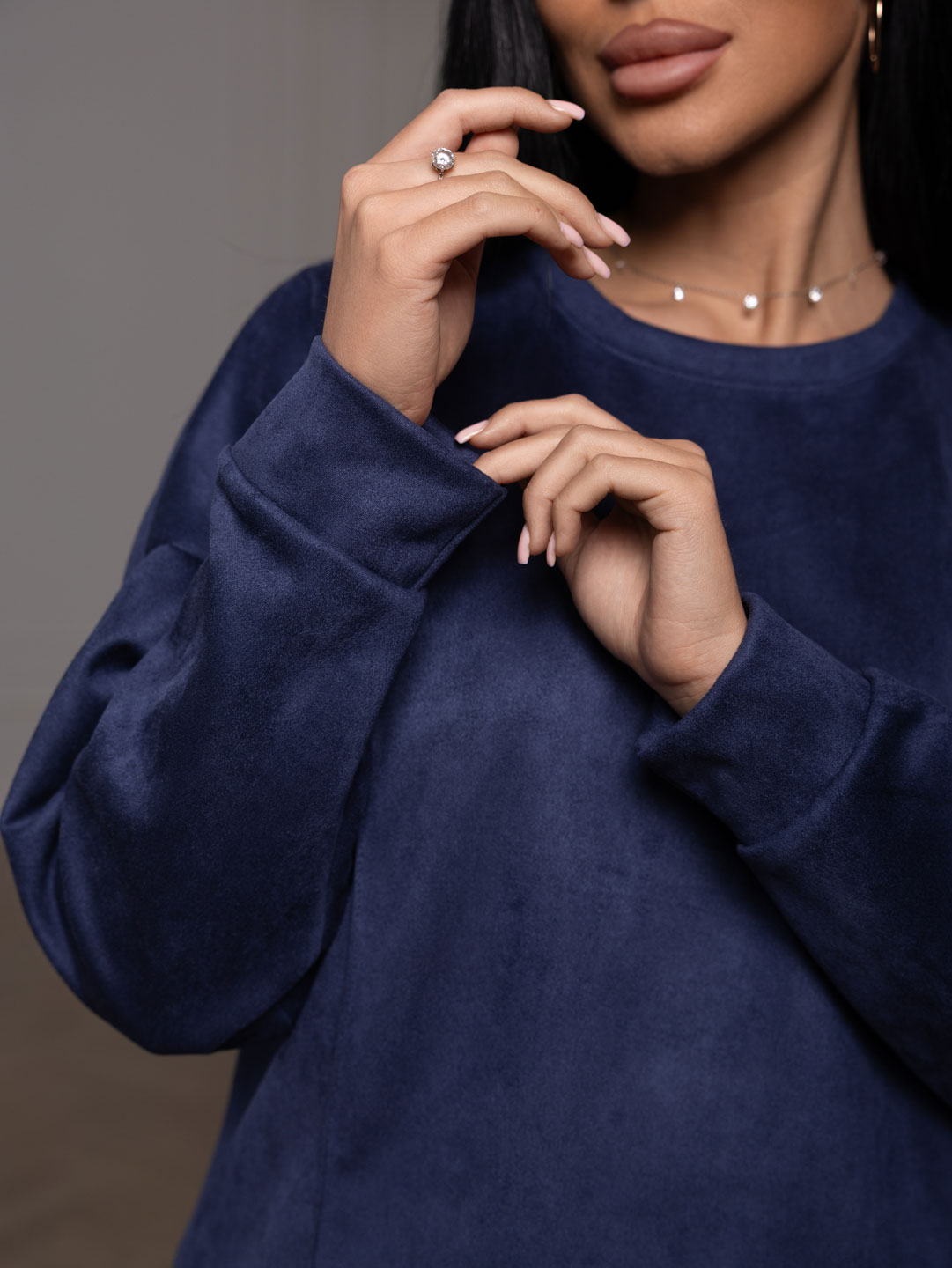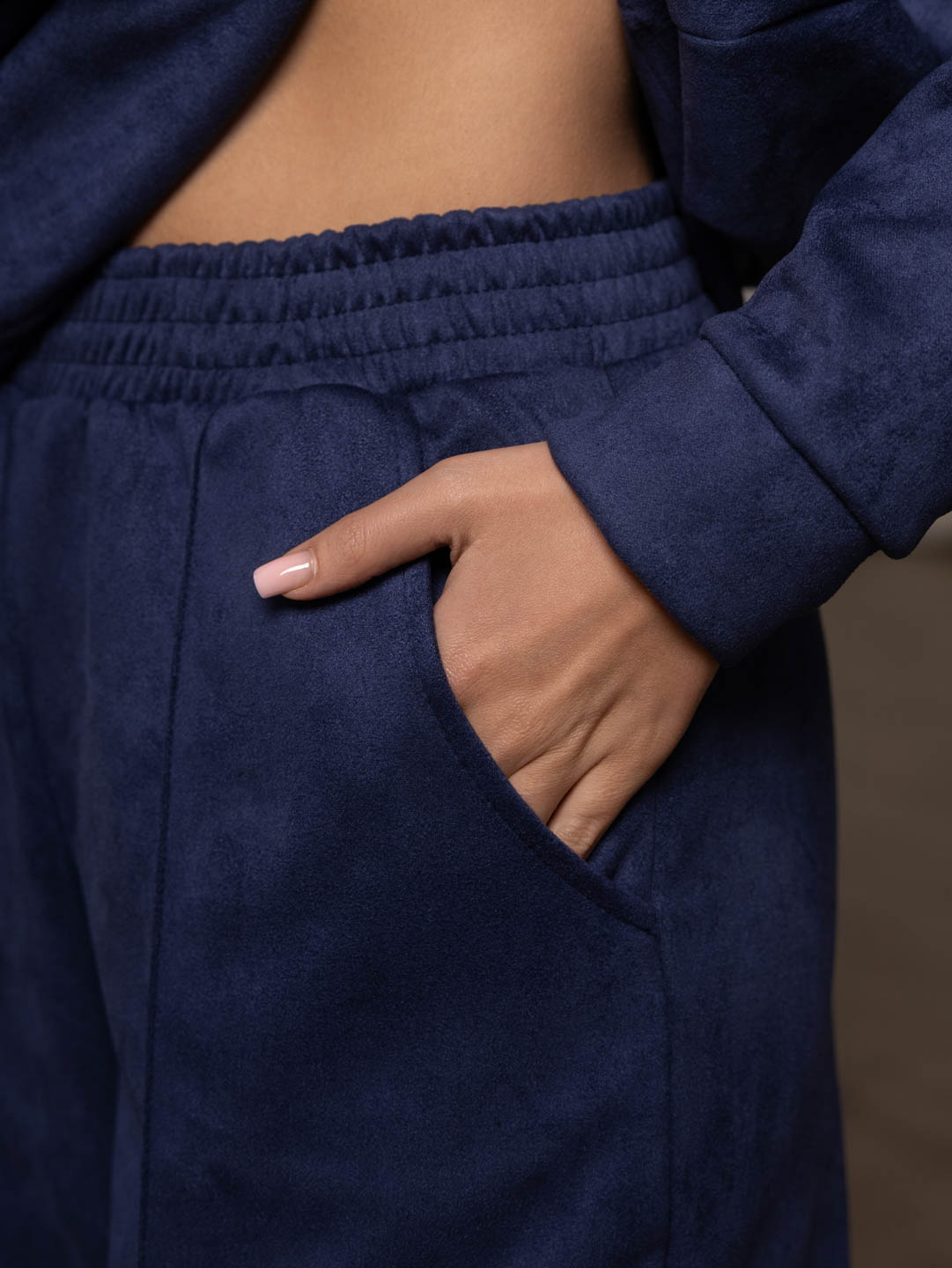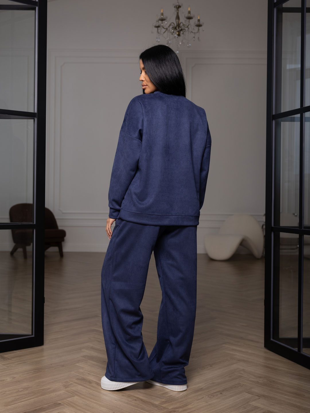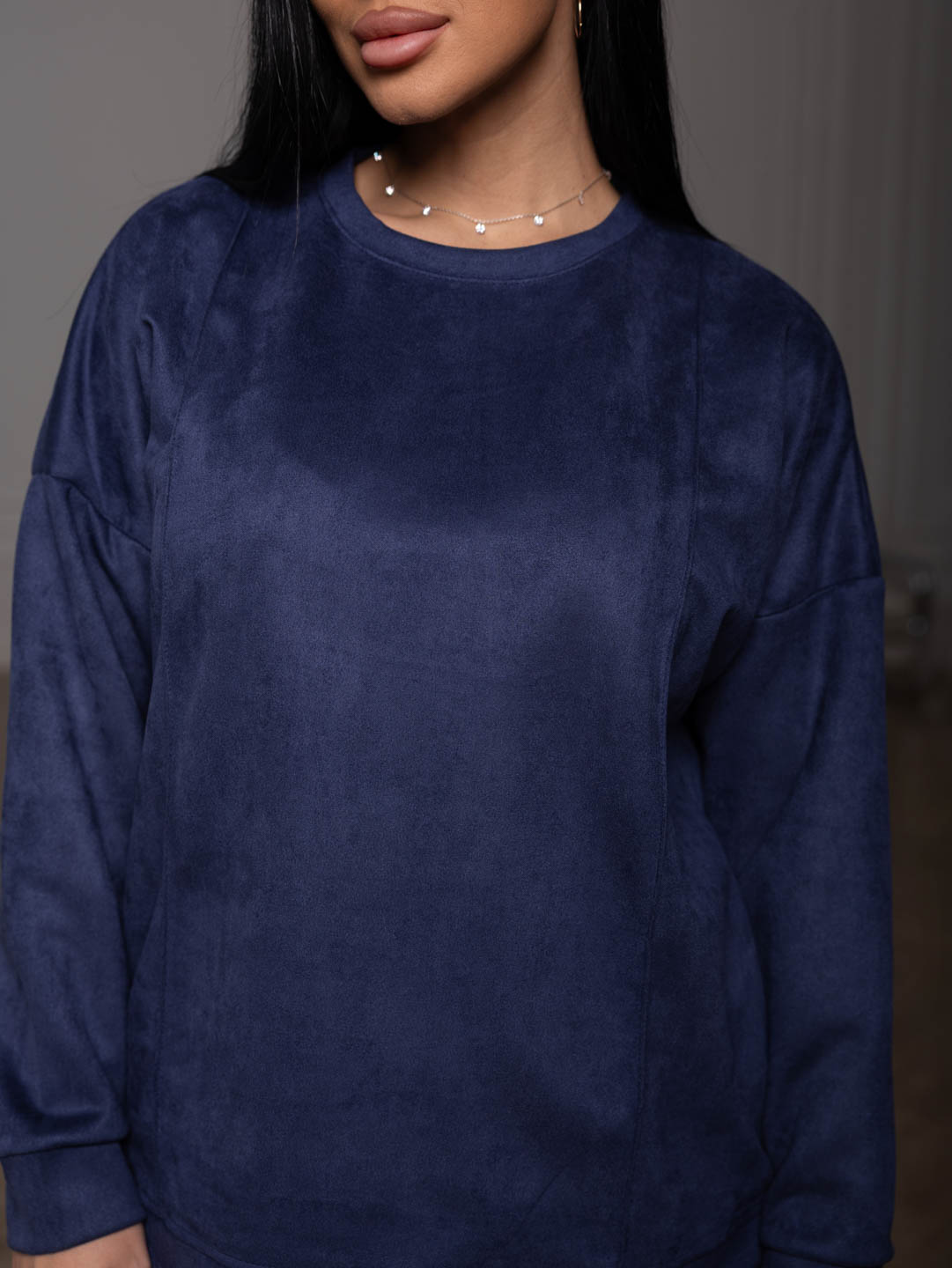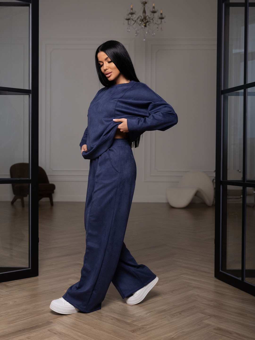Брючный замшевый костюм из качественного приятного на ощупь полотна. Толстовка выполнена в стиле спорт шик со спущенным плечом, О-образной горловиной, стрелками на полочке и манженой по низу изделия и рукаву. Брюки прямого кроя, со стрелками и карманами в боковых швах, полной длины.
