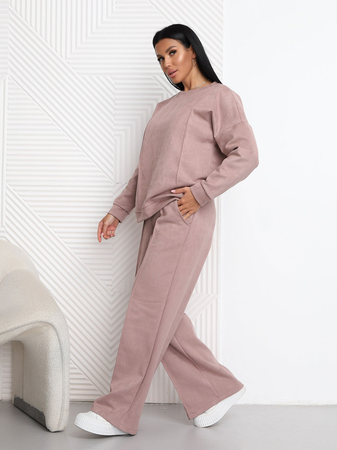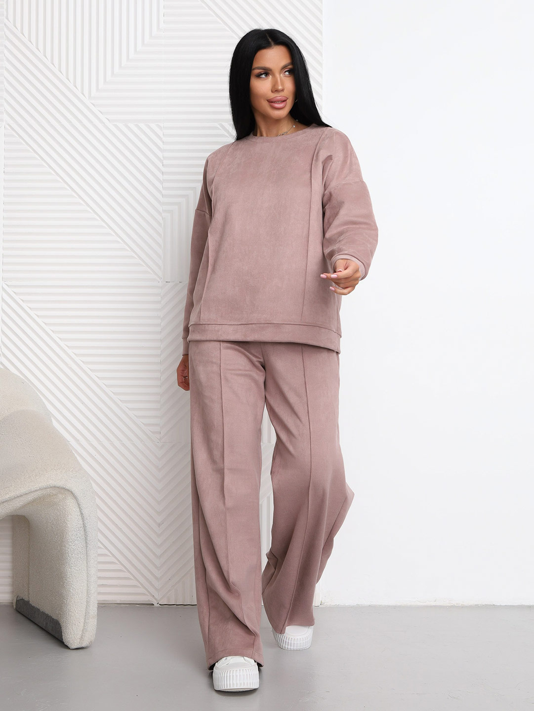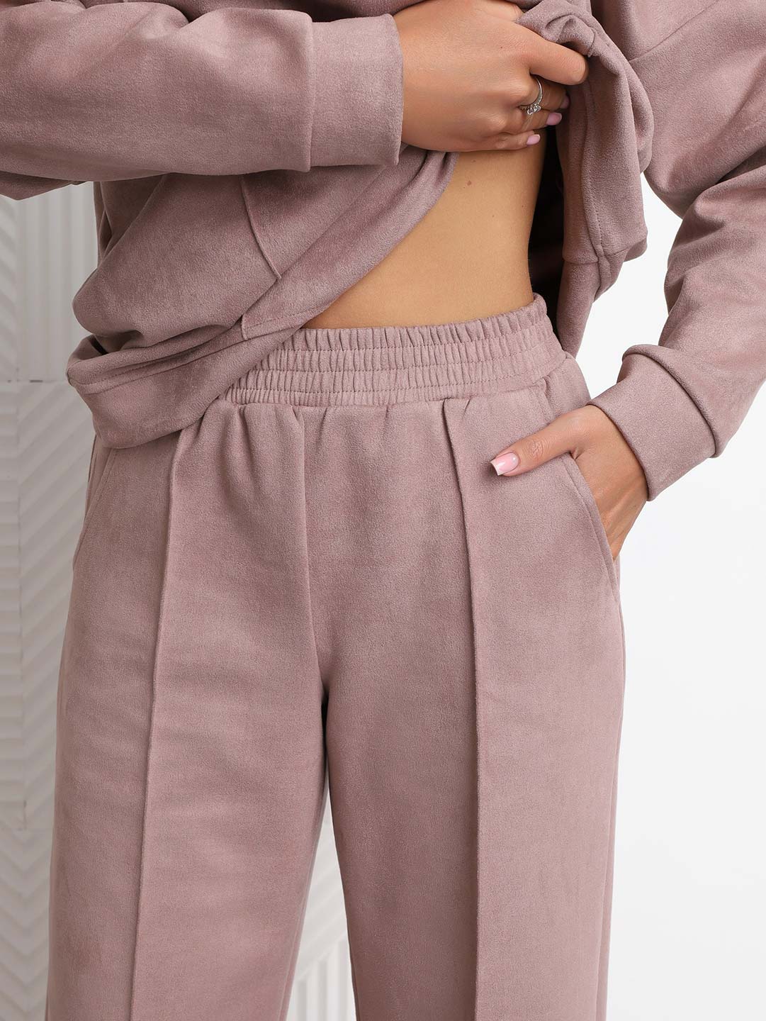 Брючный замшевый костюм из качественного приятного на ощупь полотна. Толстовка выполнена в стиле спорт шик со спущенным плечом, О-образной горловиной, стрелками на полочке и манженой по низу изделия и рукаву. Брюки прямого кроя, со стрелками и карманами в боковых швах, полной длины.