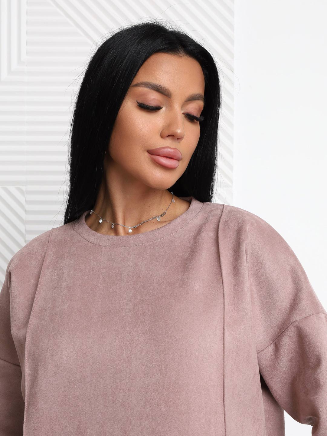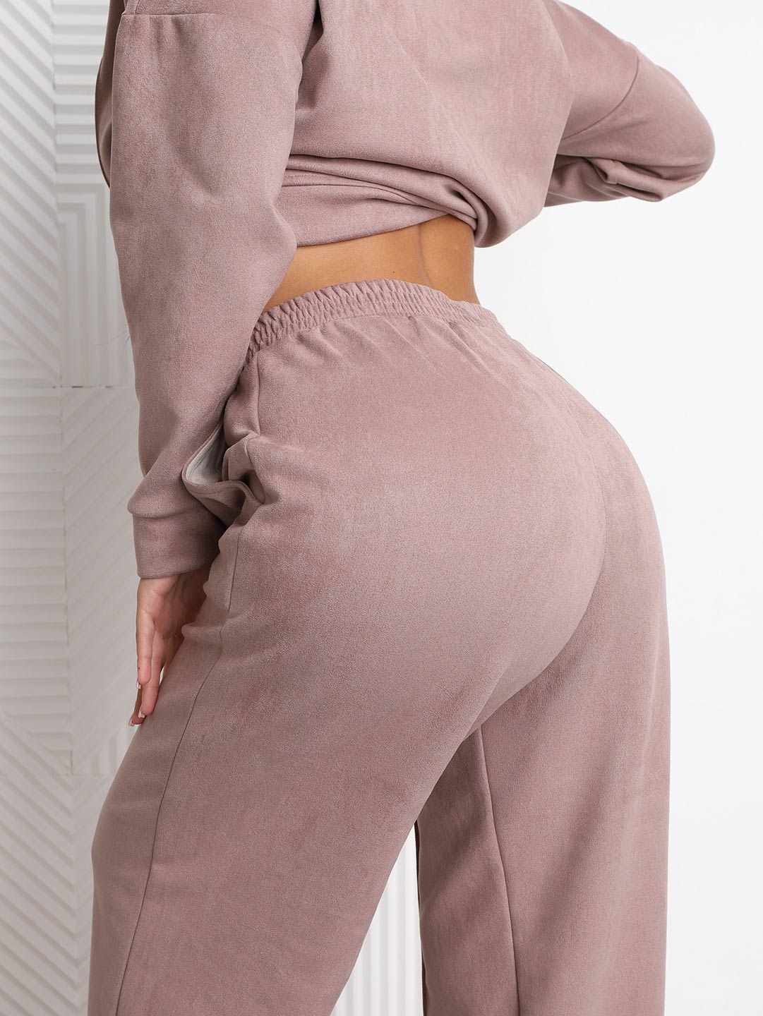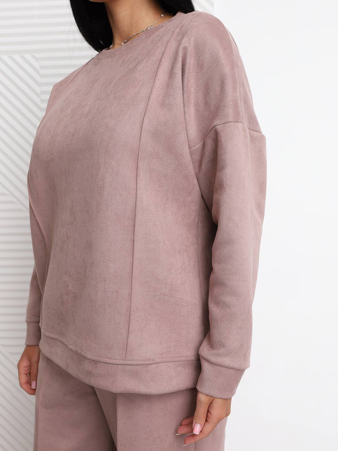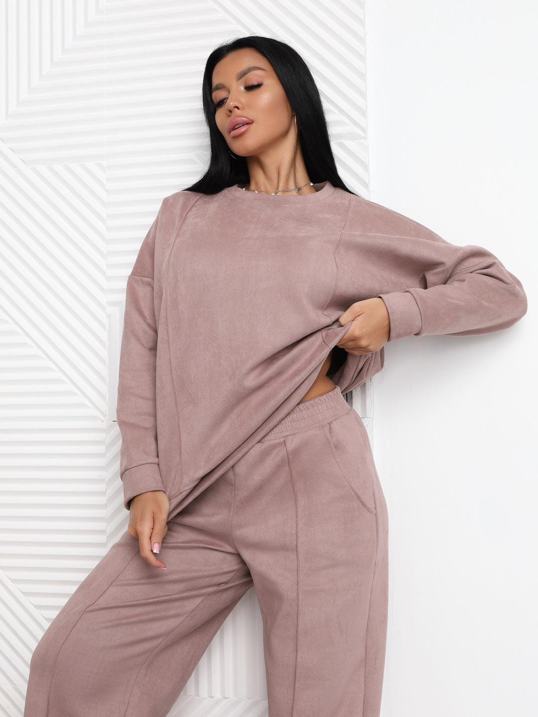 Брючный замшевый костюм из качественного приятного на ощупь полотна. Толстовка выполнена в стиле спорт шик со спущенным плечом, О-образной горловиной, стрелками на полочке и манженой по низу изделия и рукаву. Брюки прямого кроя, со стрелками и карманами в боковых швах, полной длины.