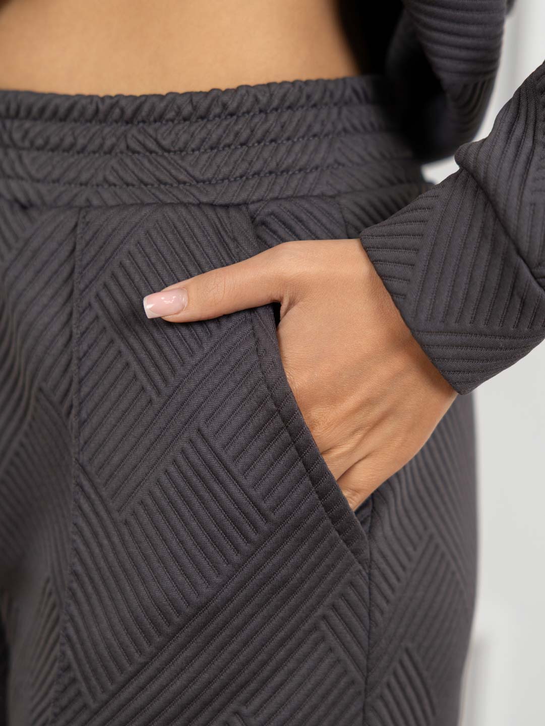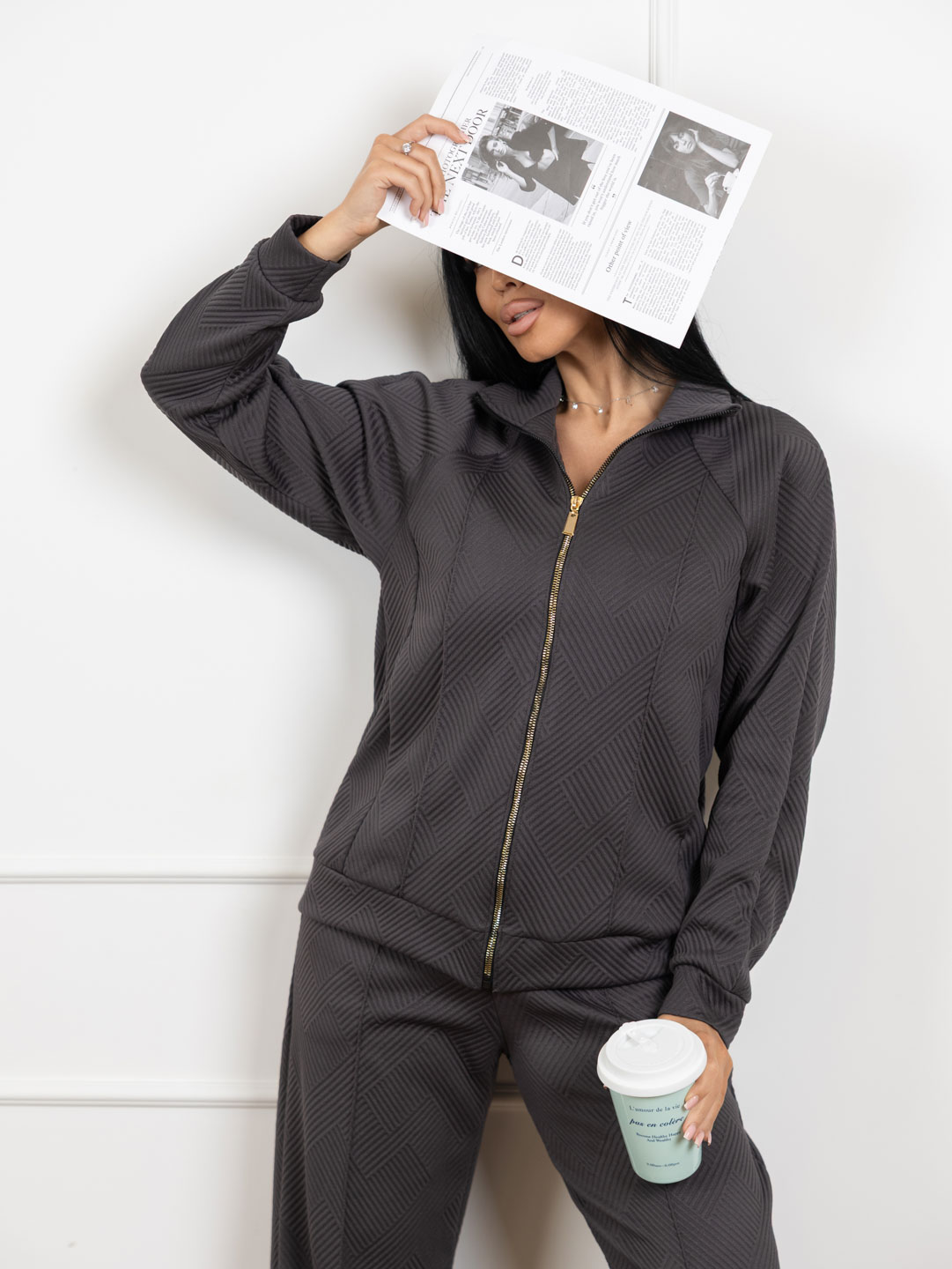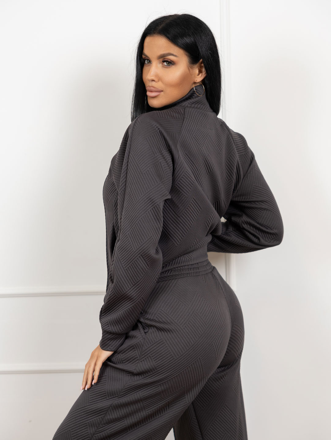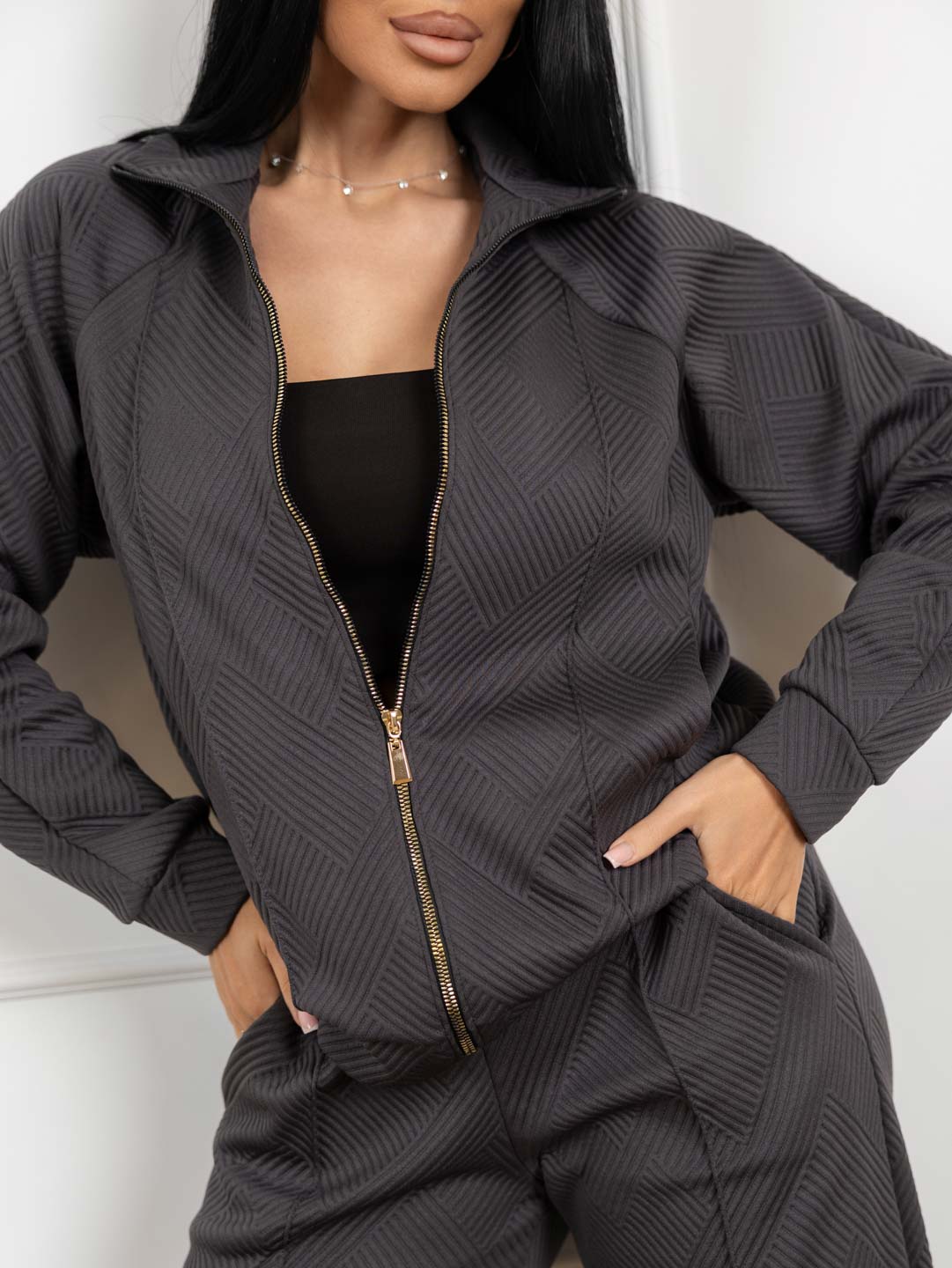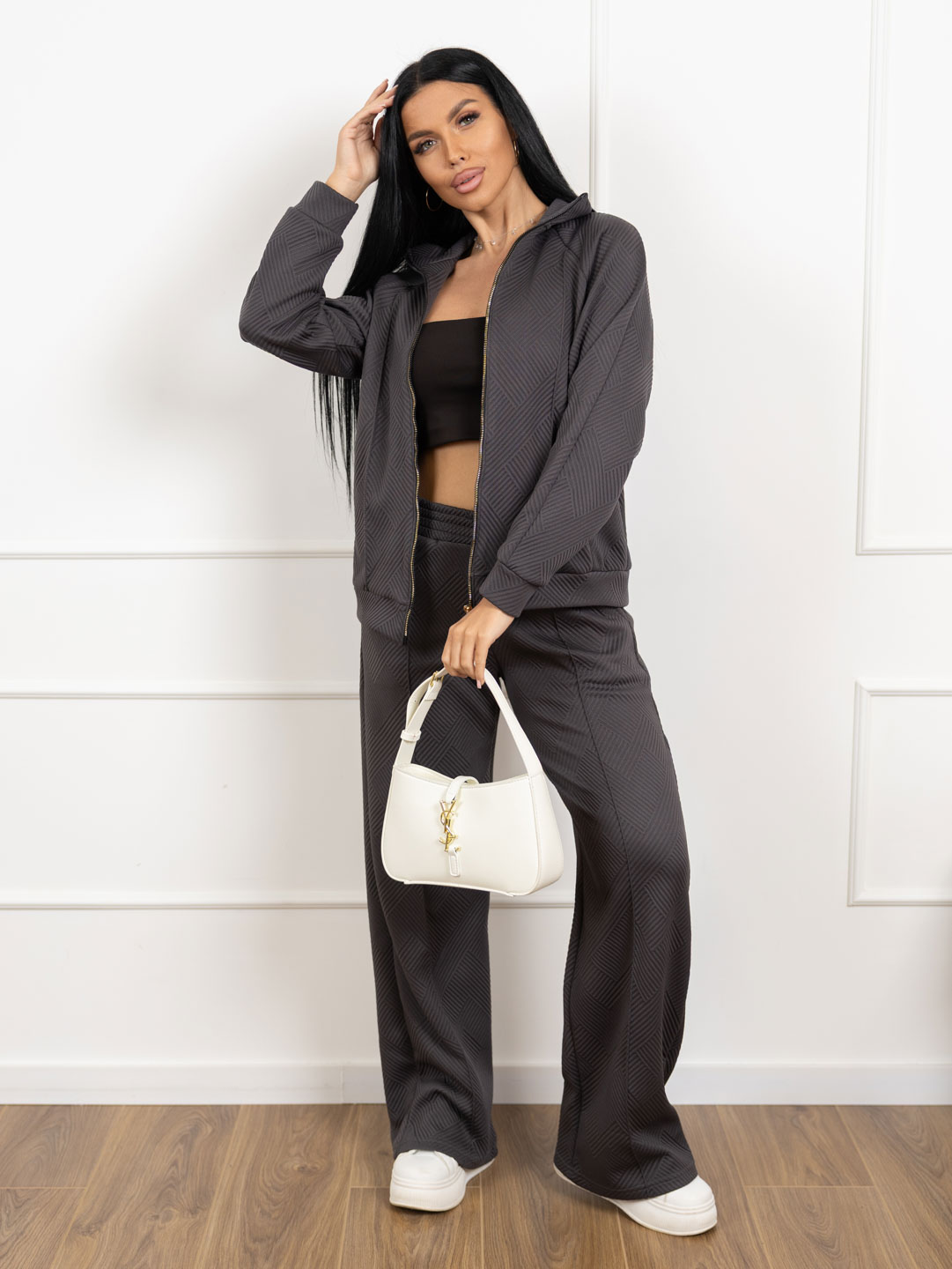 Женский костюм с брюками палаццо из фактурной ткани. Толстовка на молнии с рельефами, декоративной отстрочкой, карманами в рельефах и рукавом реглан. Брюки со стрелками, на поясе с несколькими отстрочками и карманами в боковых швах.