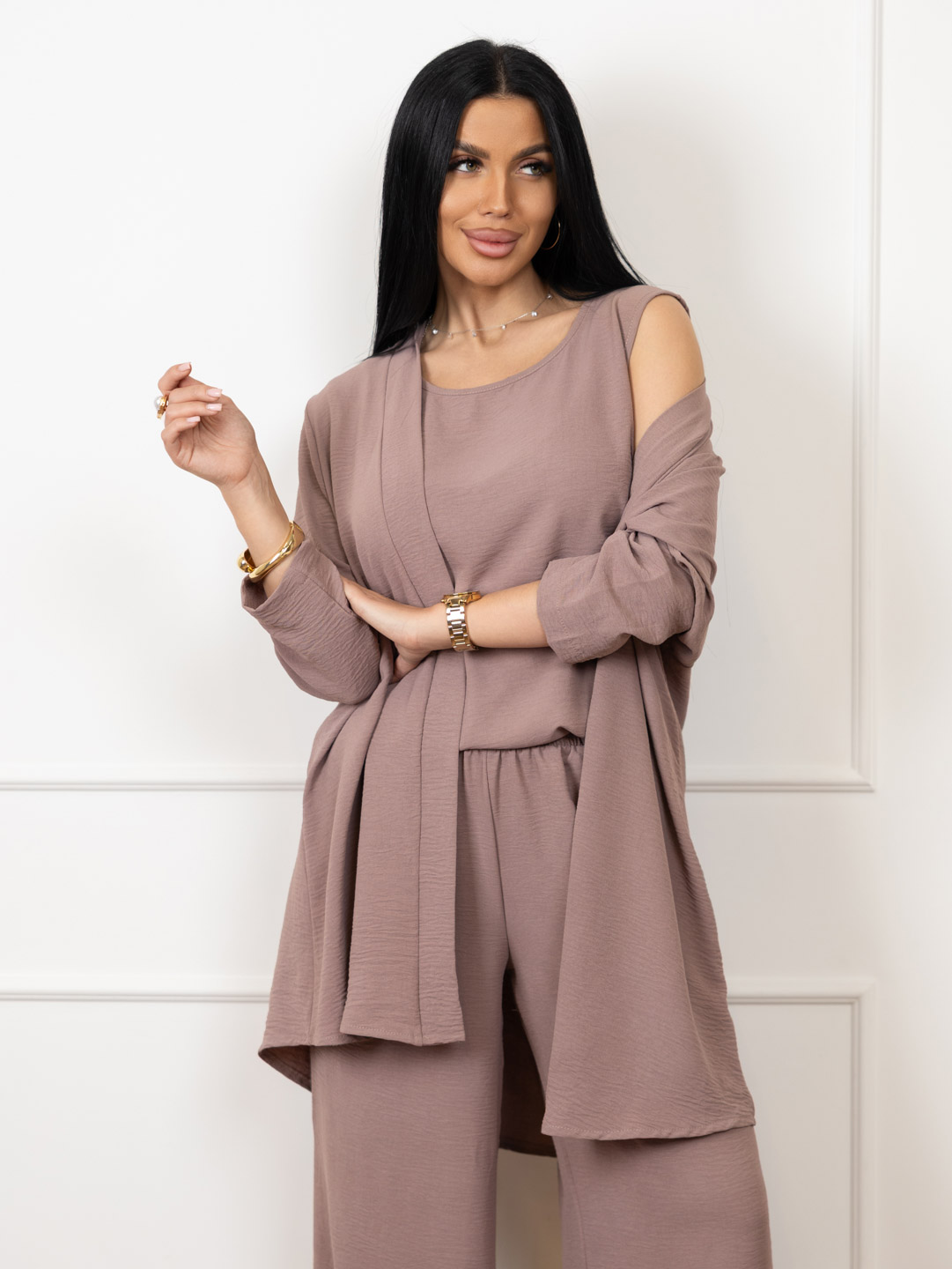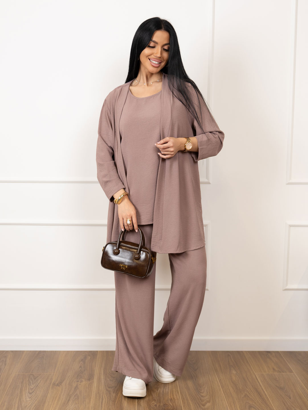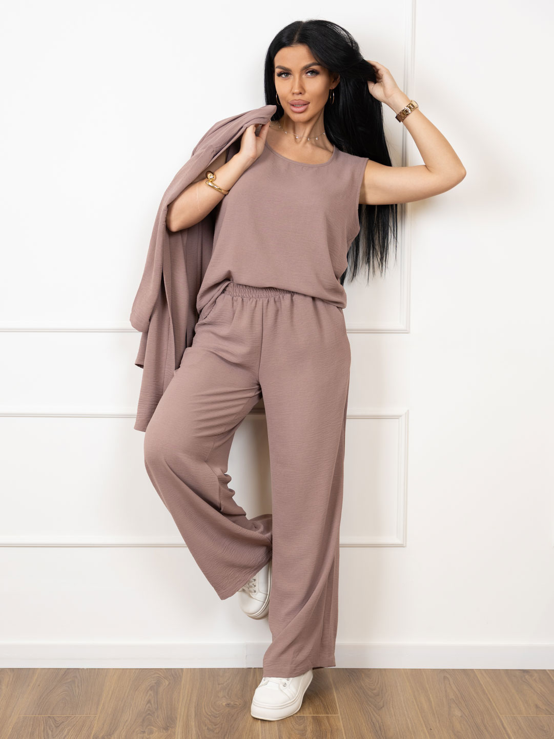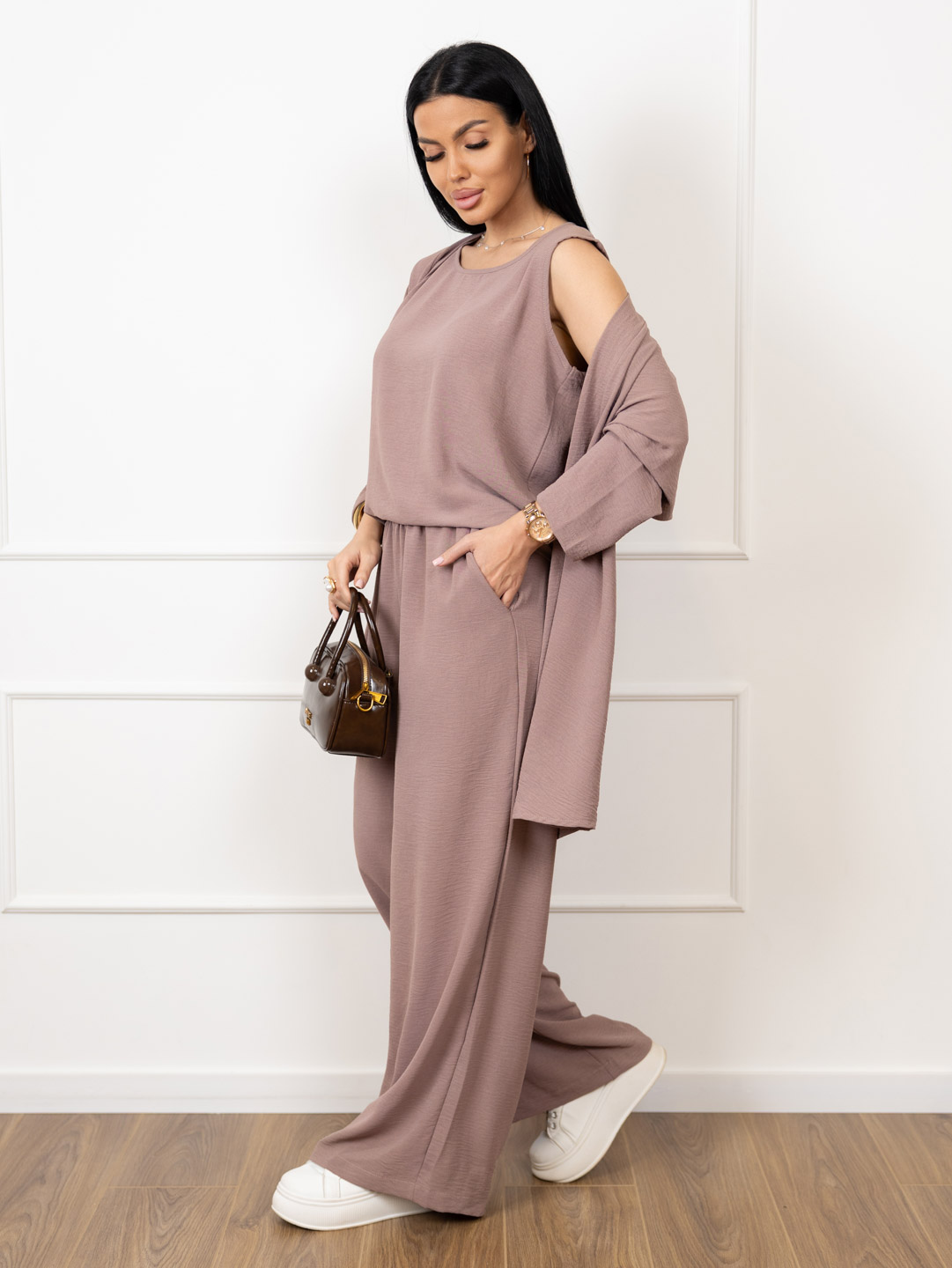 Летний женский костюм-тройка: стильное кимоно, майка и свободные брюки. Майка без рукавов,с О-образной горловиной, длиной до середены бедра. Накидка-кимоно с втачным рукавом длиной 3/4. Брюки палаццо с карманами в боковых швах и поясом с эластичной резинкой и отстрочкой на поясной машине.