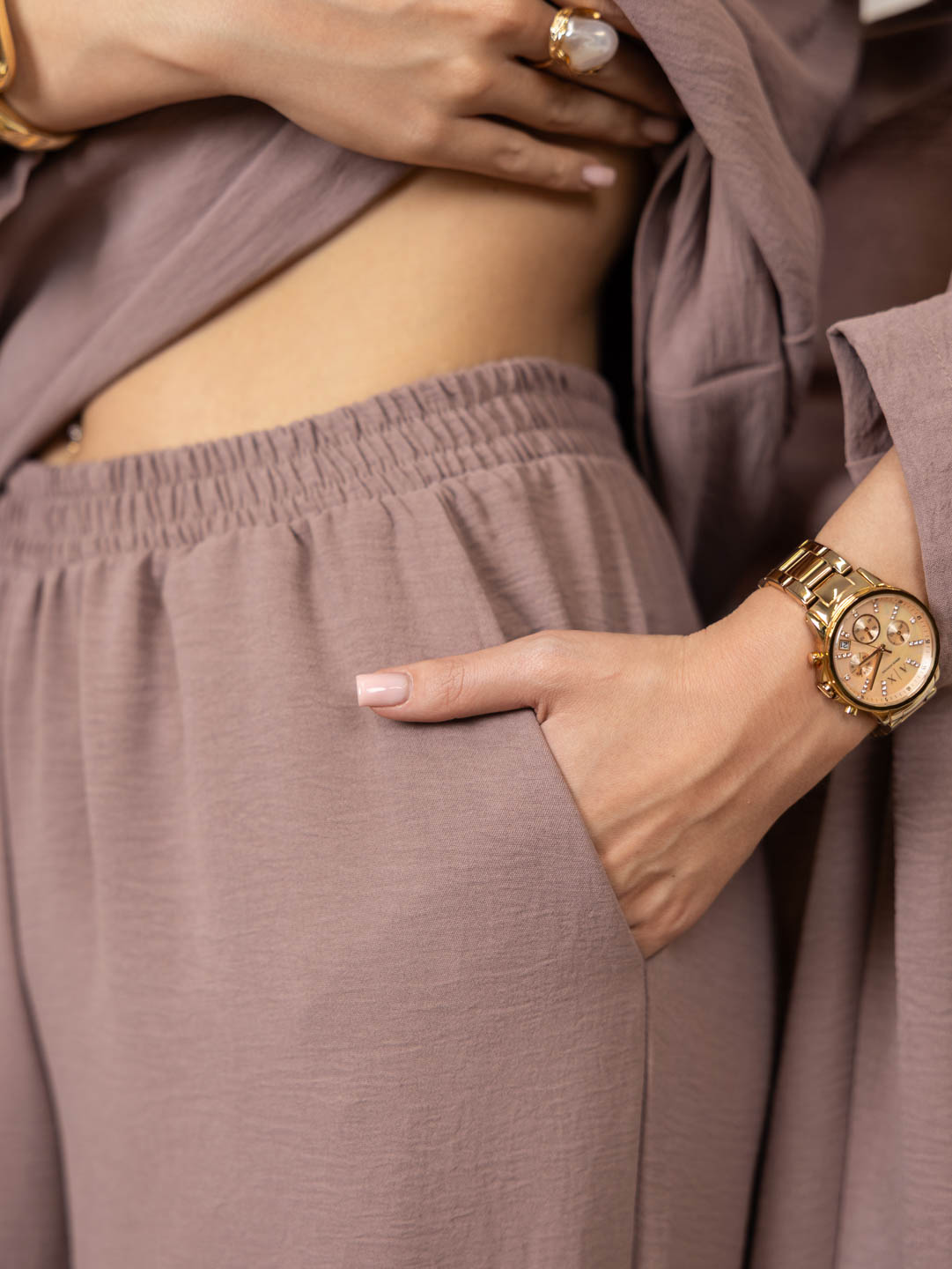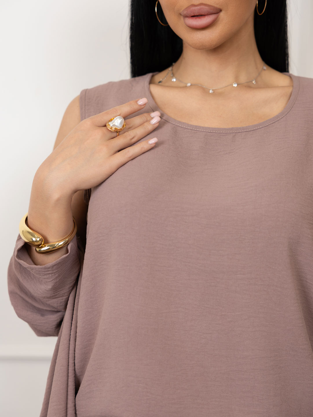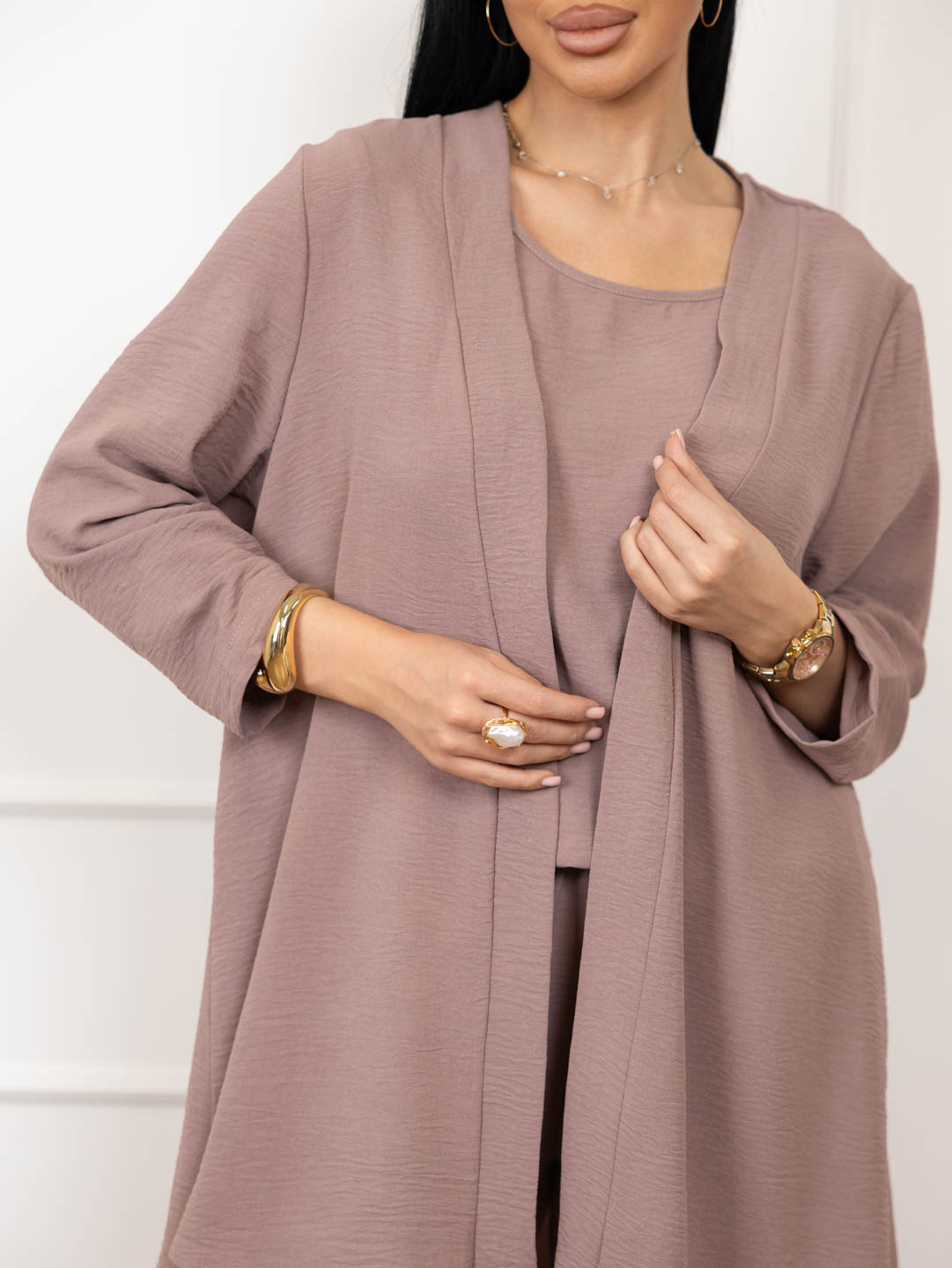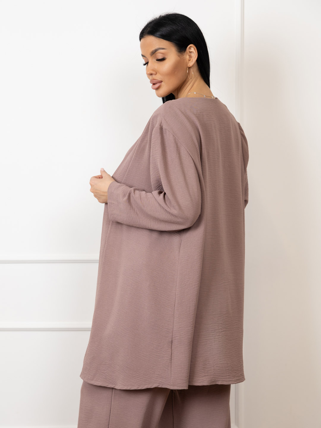 Летний женский костюм-тройка: стильное кимоно, майка и свободные брюки. Майка без рукавов,с О-образной горловиной, длиной до середены бедра. Накидка-кимоно с втачным рукавом длиной 3/4. Брюки палаццо с карманами в боковых швах и поясом с эластичной резинкой и отстрочкой на поясной машине.