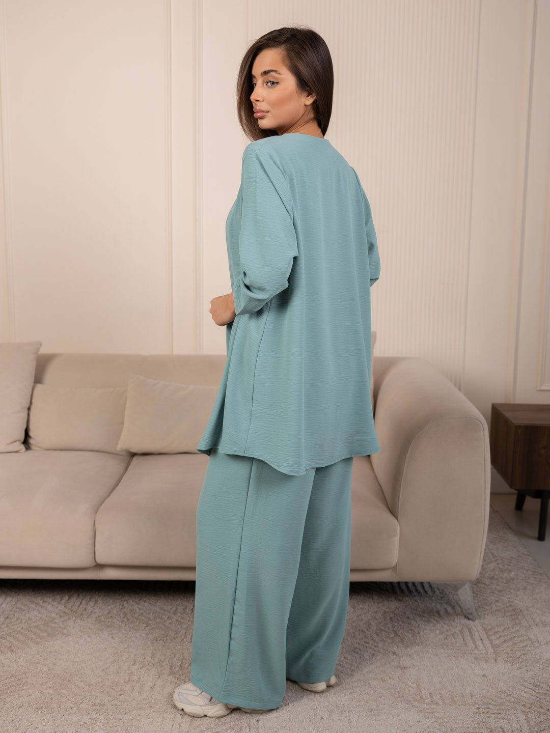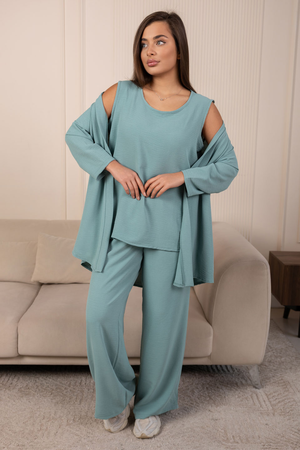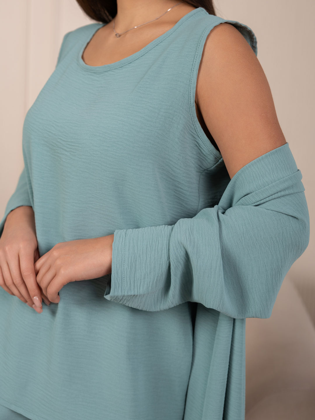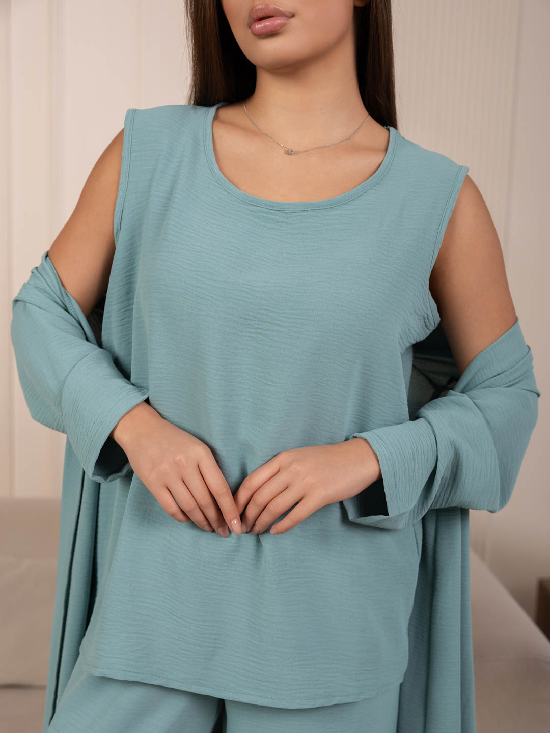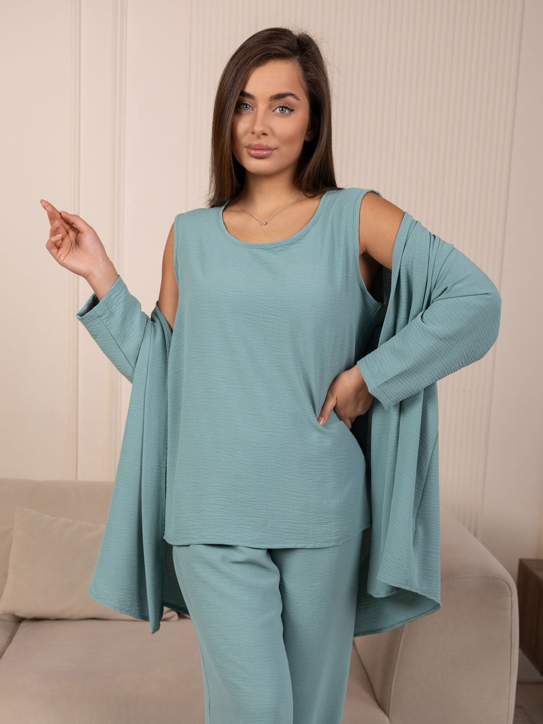 Летний женский костюм-тройка: стильное кимоно, майка и свободные брюки. Майка без рукавов,с О-образной горловиной, длиной до середены бедра. Накидка-кимоно с втачным рукавом длиной 3/4. Брюки палаццо с карманами в боковых швах и поясом с эластичной резинкой и отстрочкой на поясной машине.