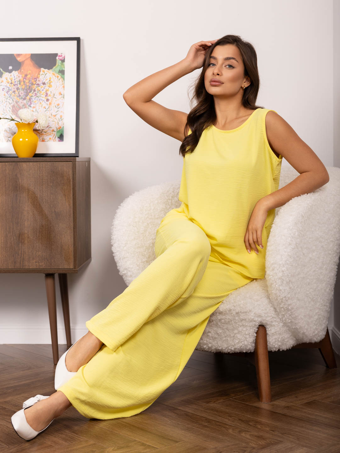 Брючный костюи из легкого, воздушного материала с легким жатым эффектом. Майка с О-образной горловиной, до середины бедра. Брюки палаццо с карманами, поясом на резинке и несколькими декоративными строчками. Рост модели 167см.