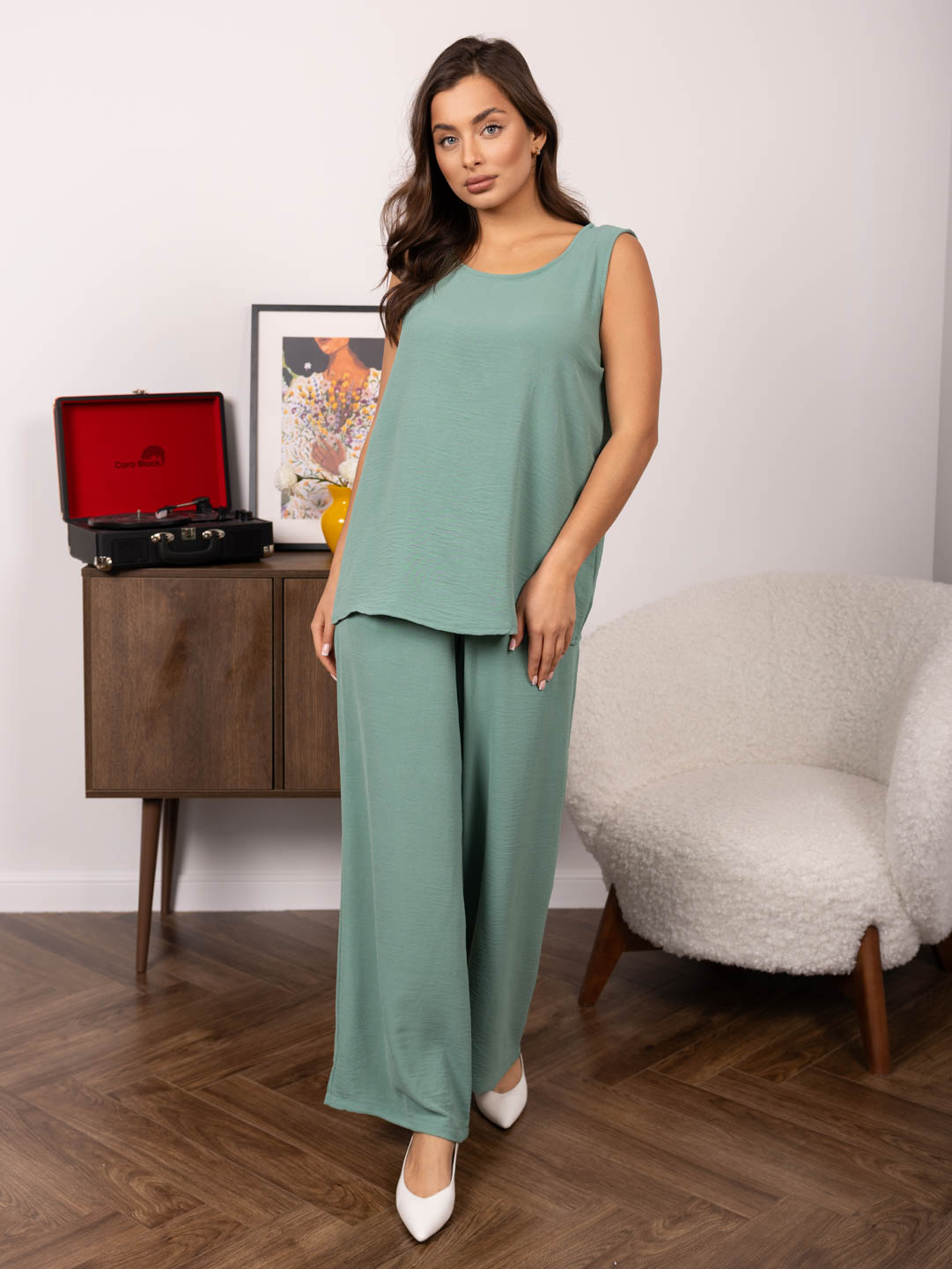 Брючный костюи из легкого, воздушного материала с легким жатым эффектом. Майка с О-образной горловиной, до середины бедра. Брюки палаццо с карманами, поясом на резинке и несколькими декоративными строчками. Рост модели 167см.
