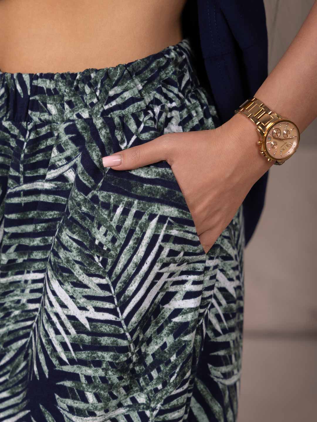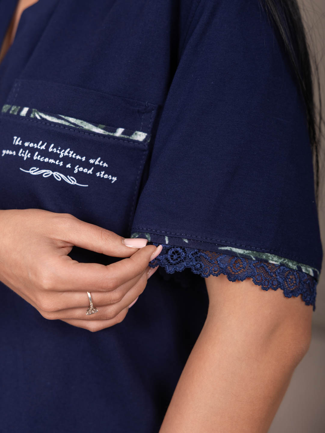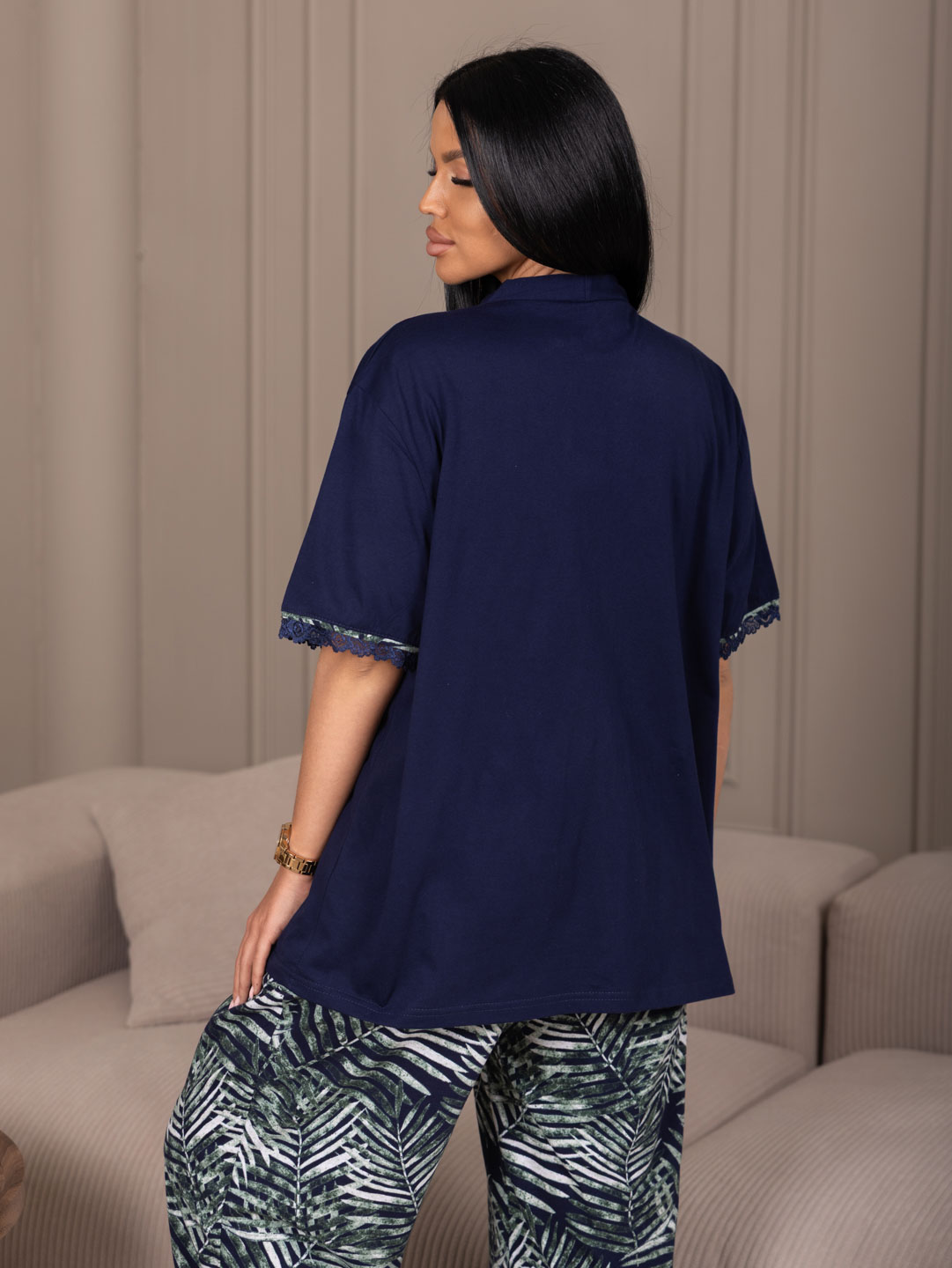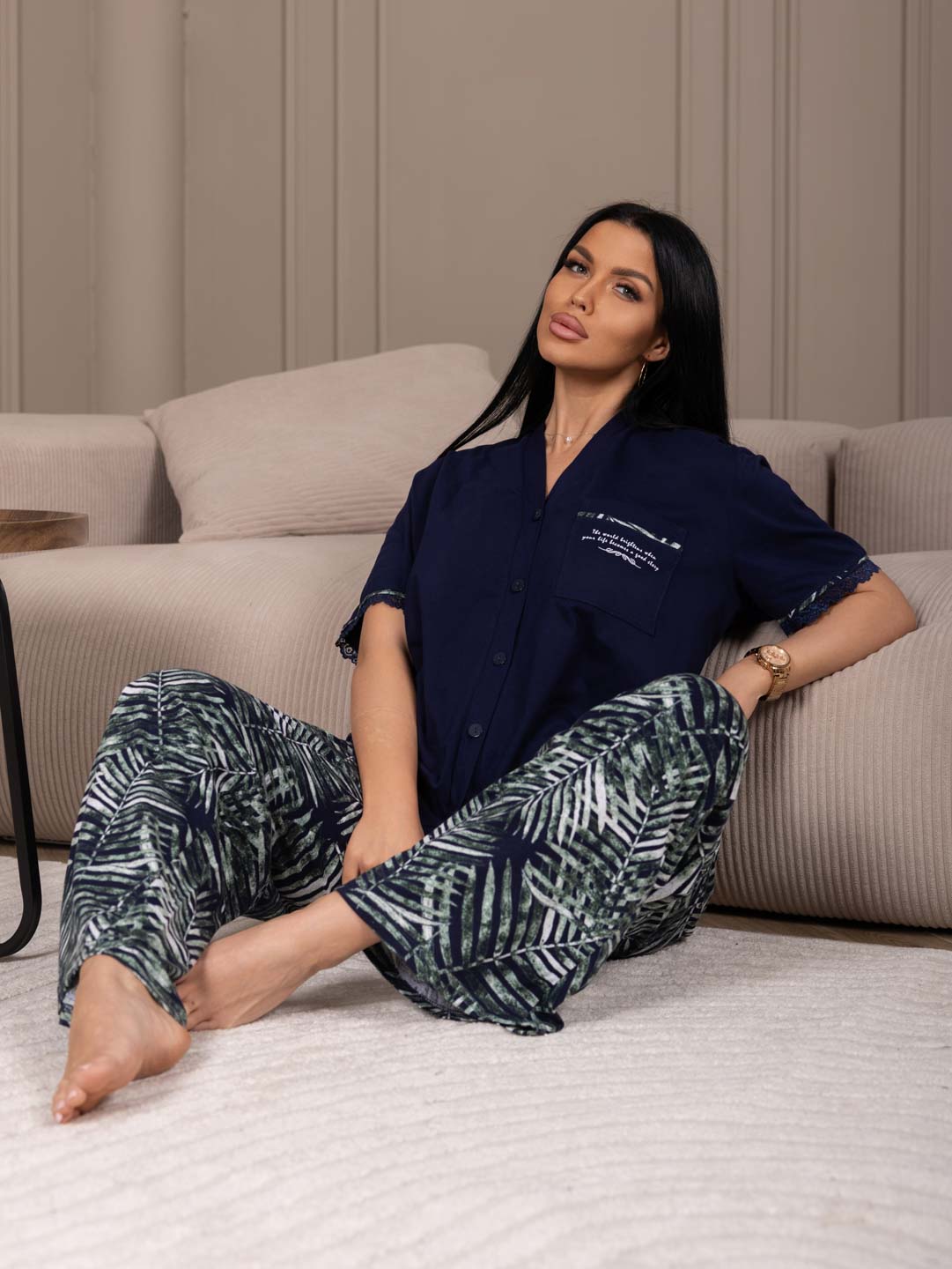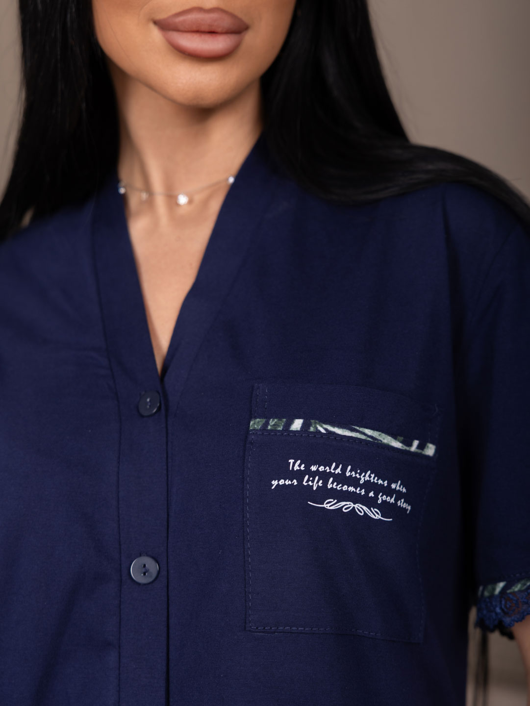 Домашний костюм из хлопка на пуговицах. Футбола с коротким рукавом, с отделкой кружевом, спереди накладной карман с печатью. Брюки прямые на поясе с карманами в бокорвых швах.