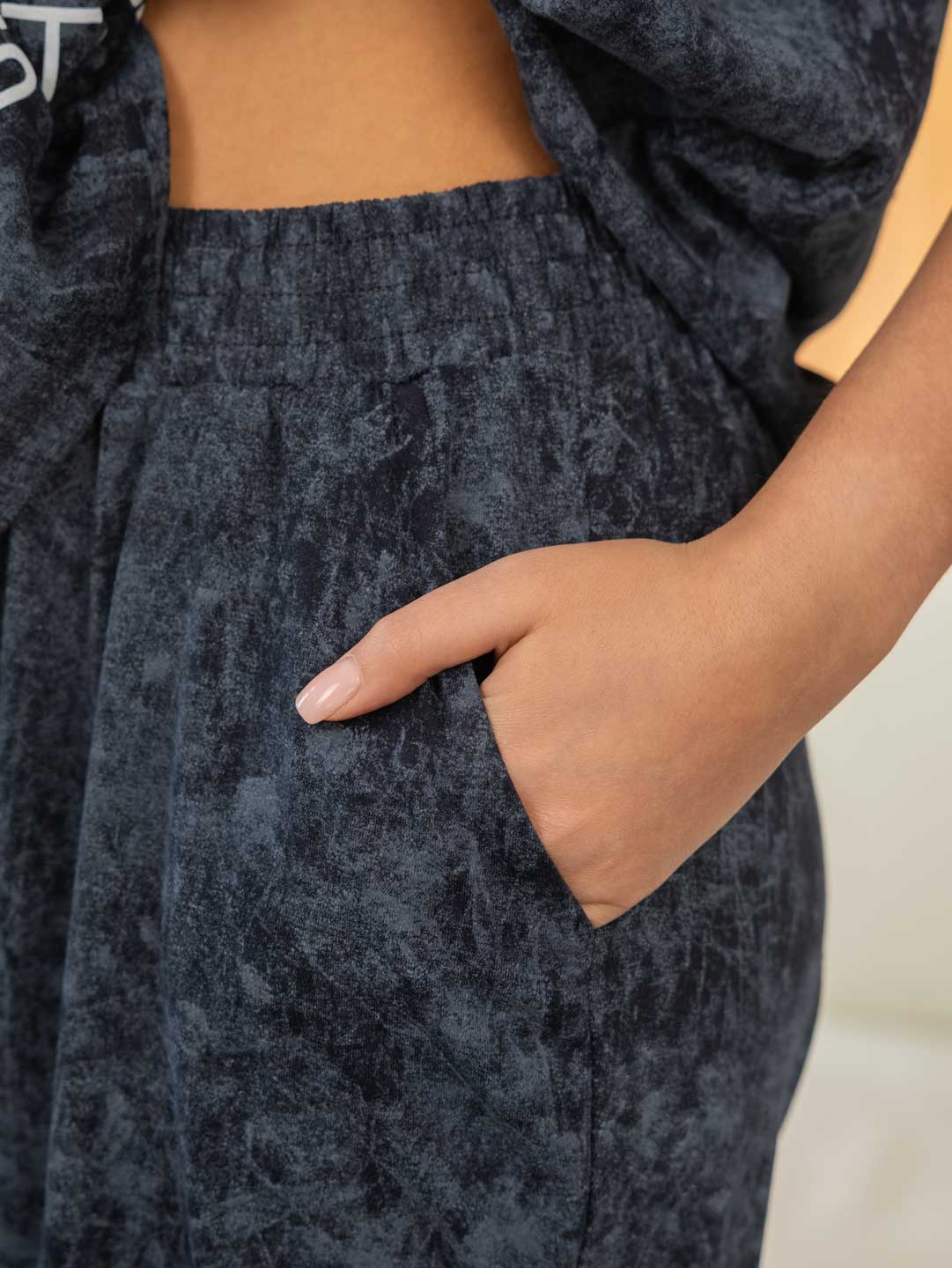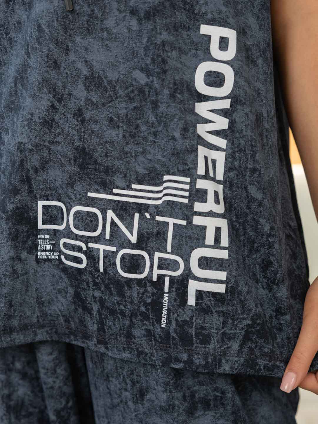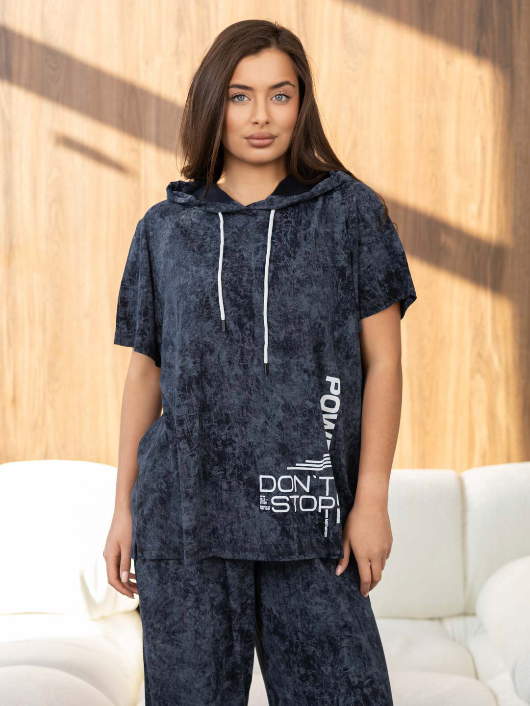 Женский костюм из хлопка с эффектом варенки, футболка с капюшоном, втачным рукавом и печатью спереди. Брюки прямые на резинке, с карманами в боковых швах.