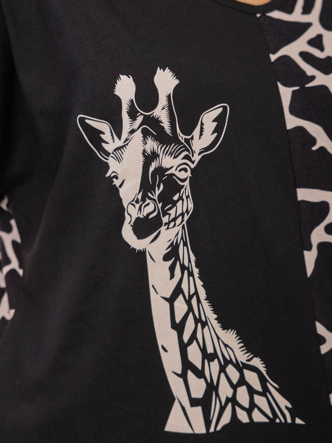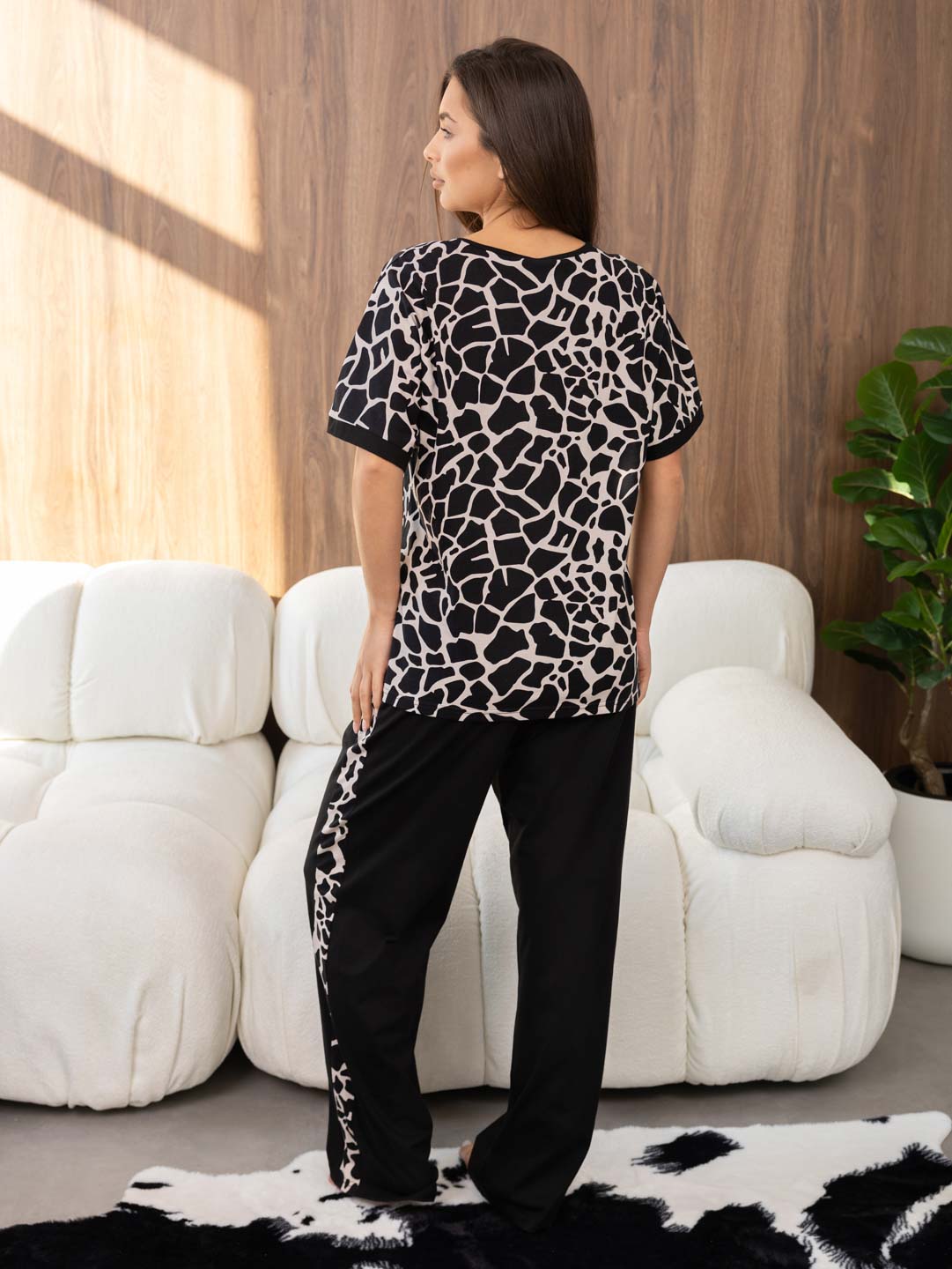 Женский костюм из хлопка. Футболка с цельнокроеным рукавом, манжетой, спереди печать на полочке с одной стороны и V-образным вырезом. Брюки с лампасами и карманами в боковых швах.