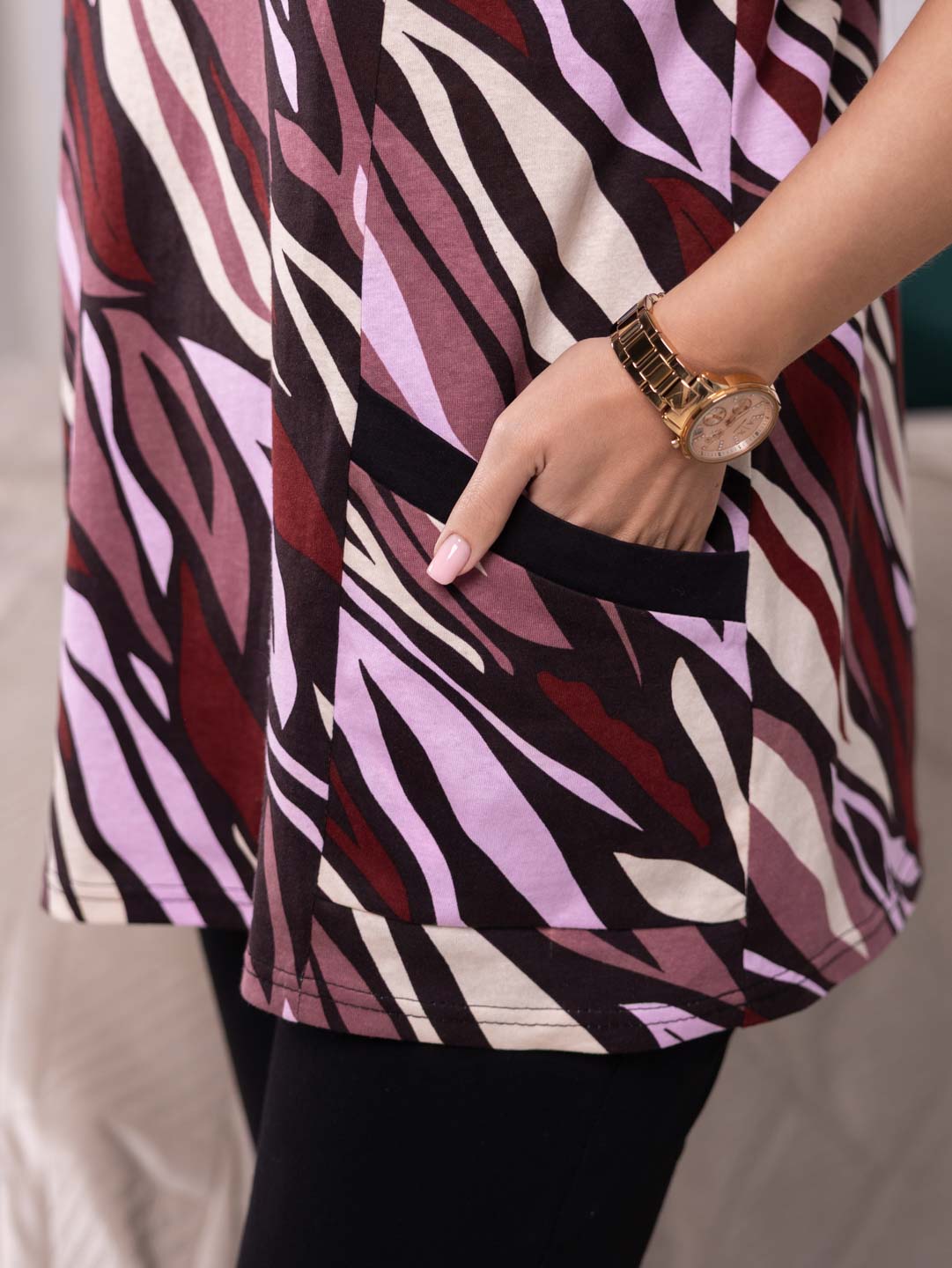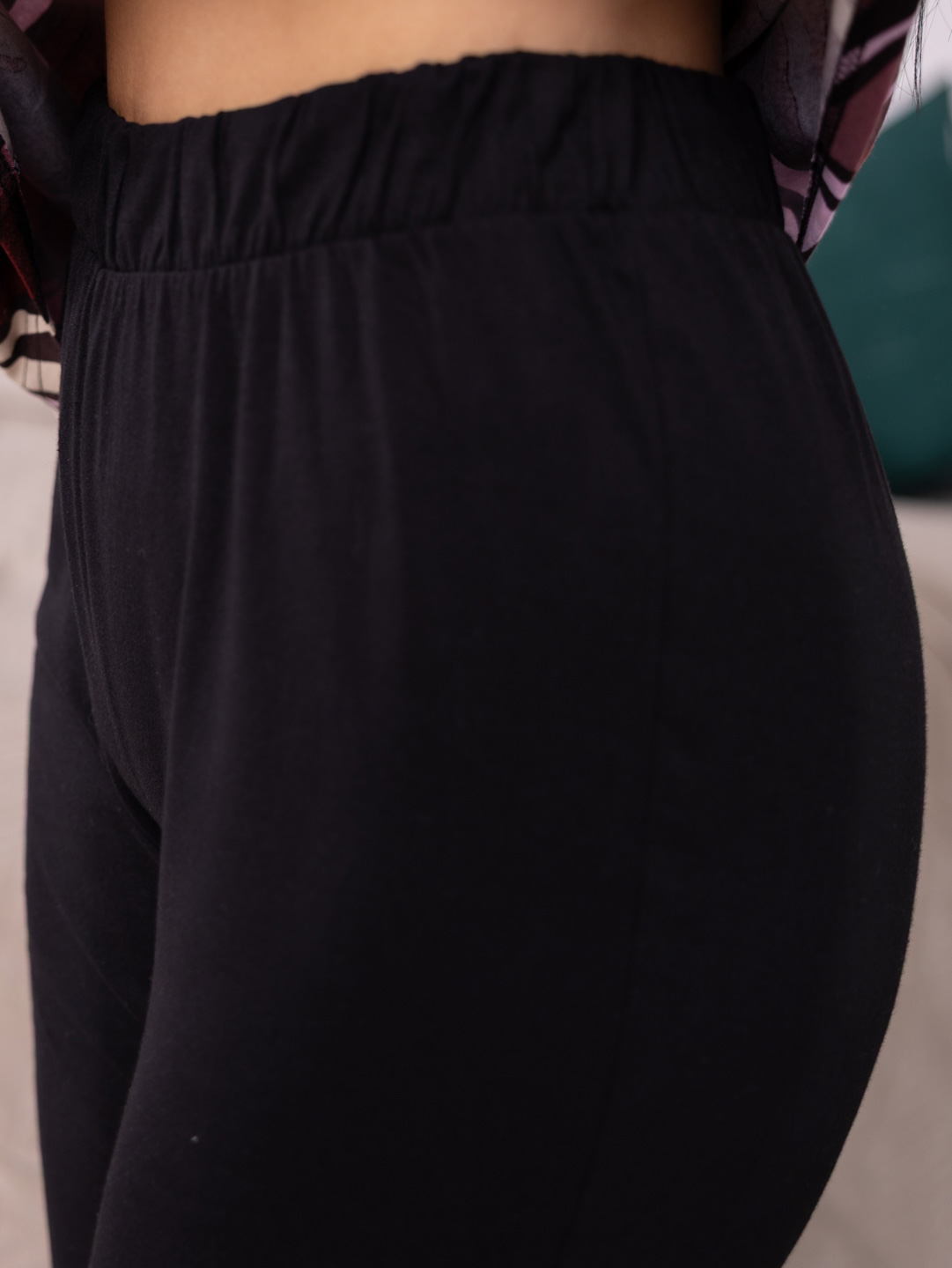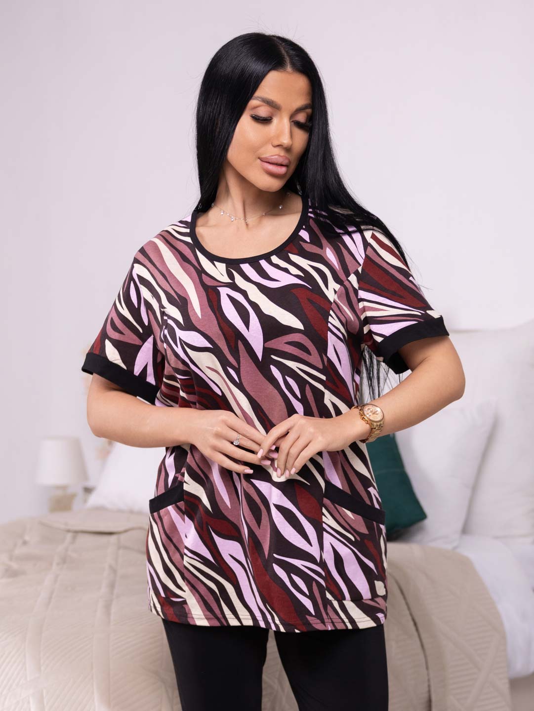 Костюм женский из комбинированного трикотажного полотна, состоящий из бридж и кофты. Кофта полуприлегающего силуэта длинной чуть ниже уровня бёдер из набивного трикотажного полотна с отделкой в цвет бридж. Полочка с рельефами и двумя накладными карманами, на которых имеются планки из отделочного материала. Рукав втачной короткий. Вырез горловины О-образный. Бриджи из однотонного трикотажного полотна длинной ниже уровня колена.