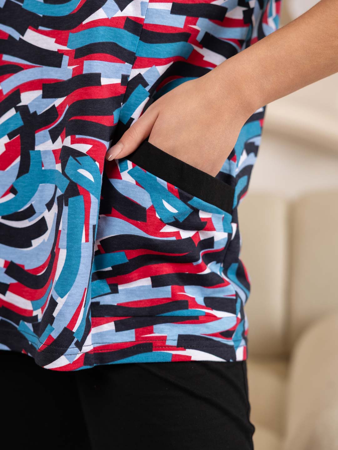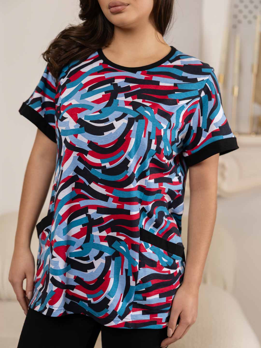 Костюм женский из комбинированного трикотажного полотна, состоящий из бридж и кофты. Кофта полуприлегающего силуэта длинной чуть ниже уровня бёдер из набивного трикотажного полотна с отделкой в цвет бридж. Полочка с рельефами и двумя накладными карманами, на которых имеются планки из отделочного материала. Рукав втачной короткий. Вырез горловины О-образный. Бриджи из однотонного трикотажного полотна длинной ниже уровня колена.