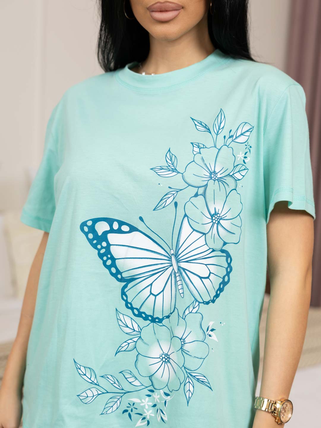 Женская пижама с бриджами из 100% хлопка. Футболка со спущенным плечом, печатью и декоративной отстрочкой: по горловине, рукаву и низу изделия. Бриджи из набивки с поясом-резинкой.