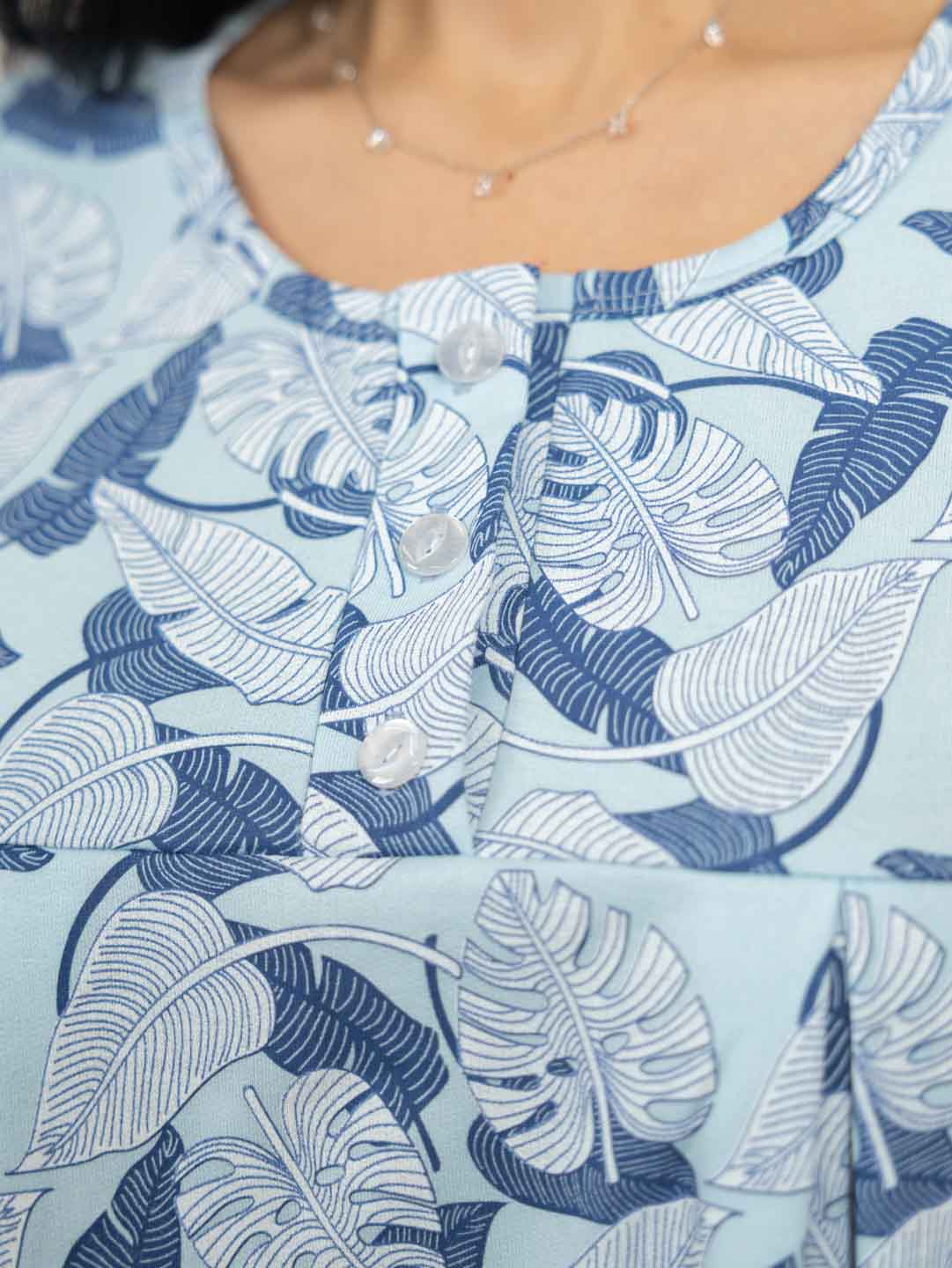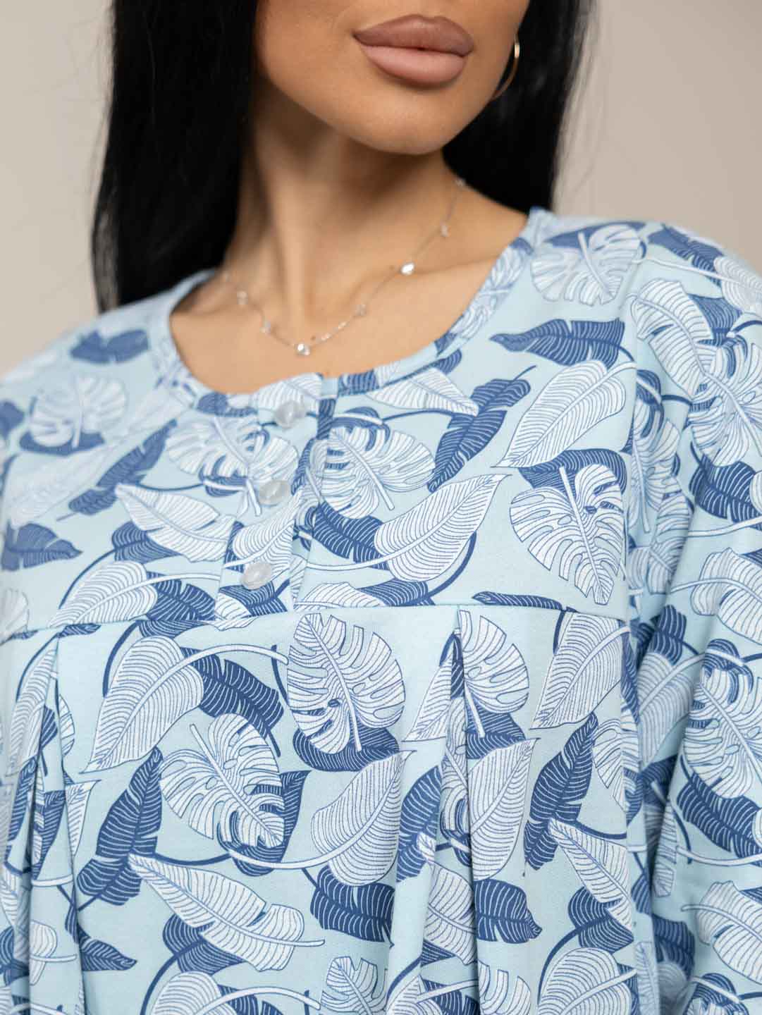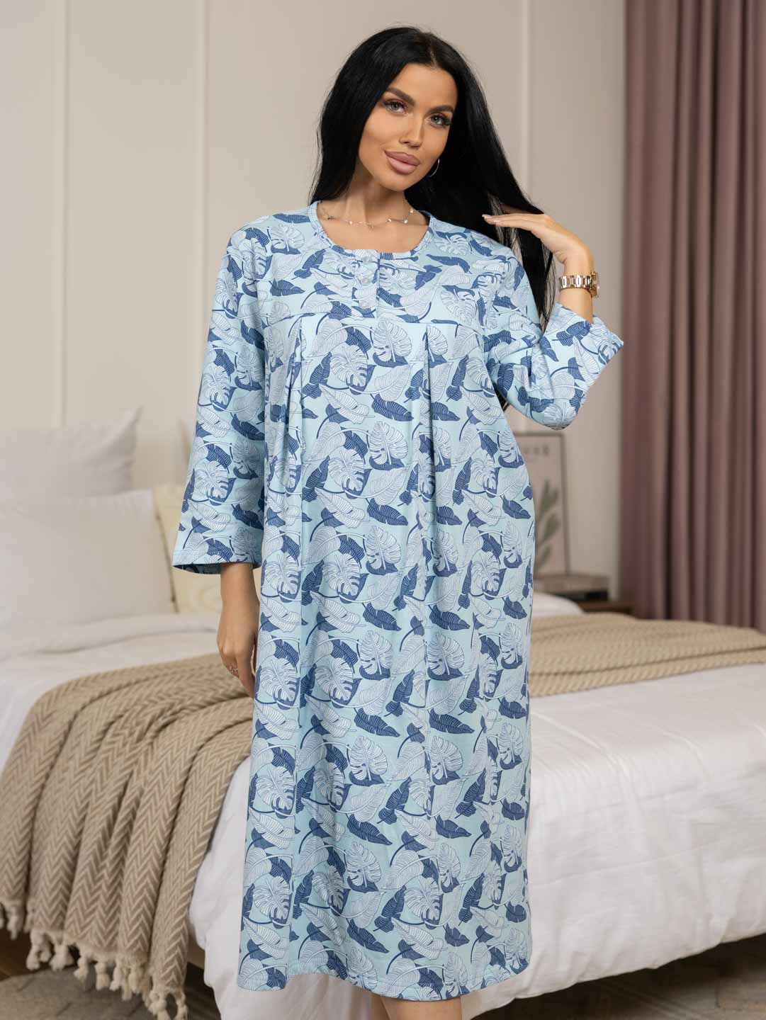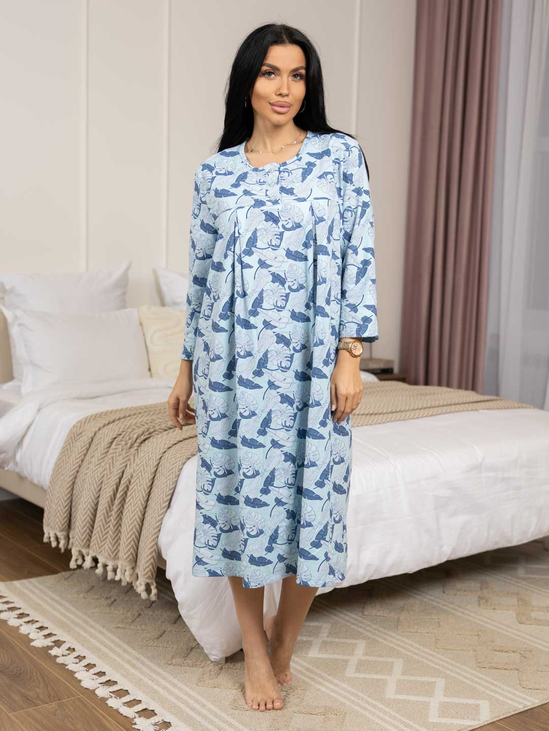 Женская ночная сорочка длиной ниже колена с рукавом 3/4 и округлой горловиной на пуговицах. Материал имеет притную к телу изнанку, благодаря которой вы не замерзните даже в самые морозные дни.