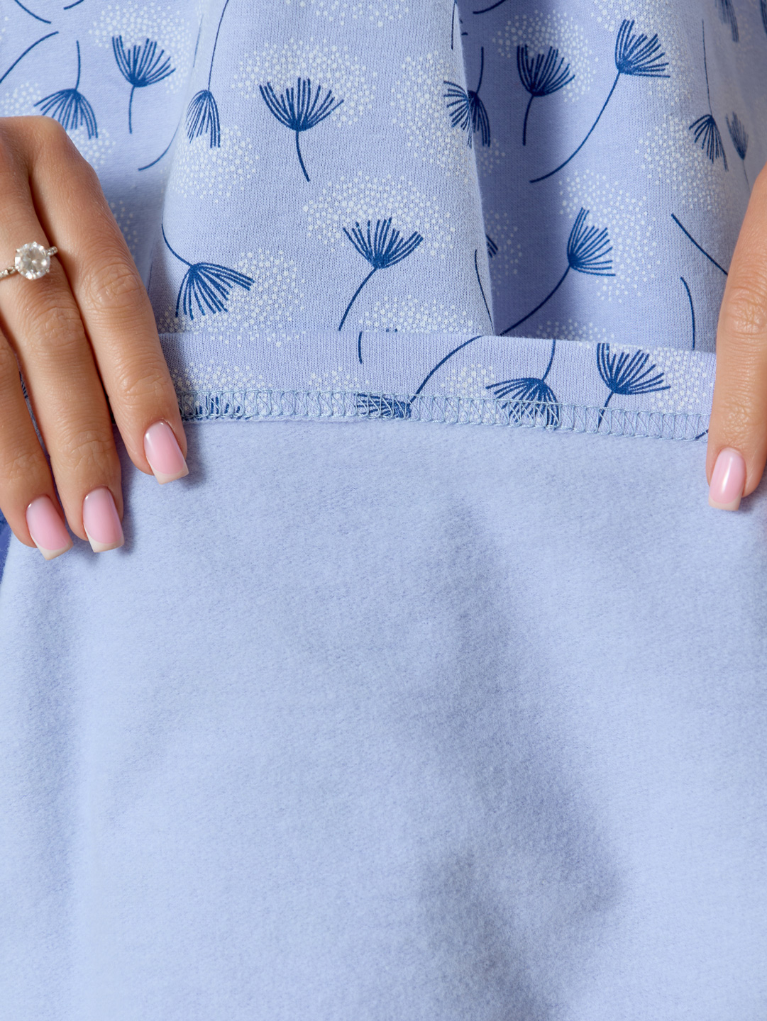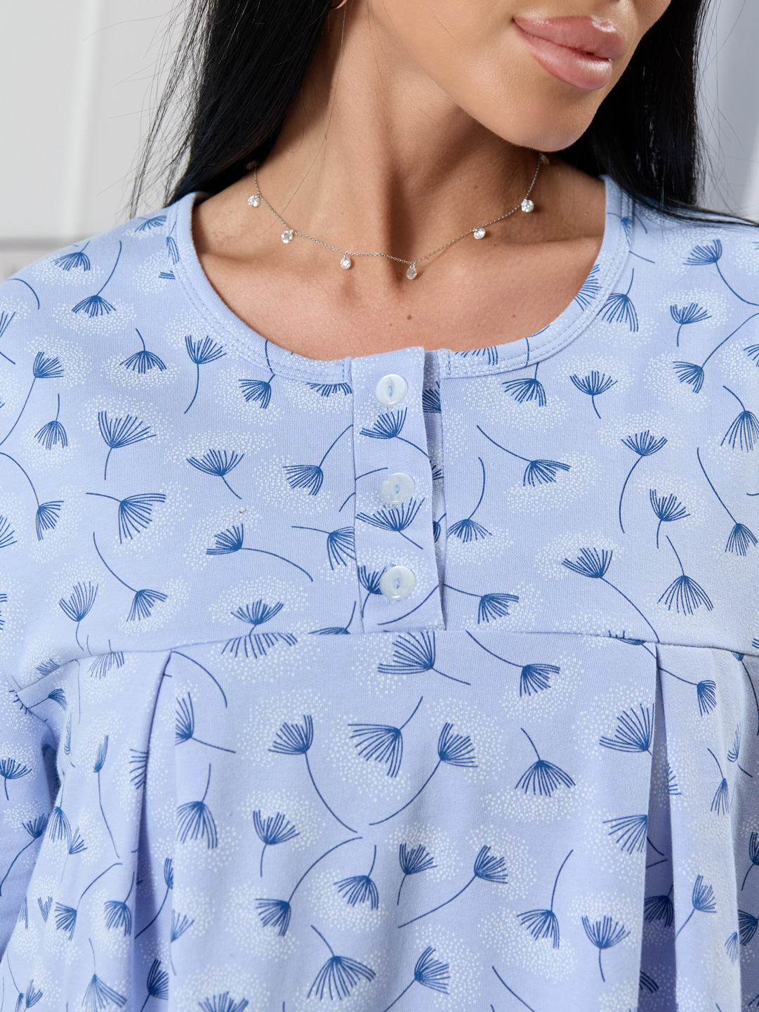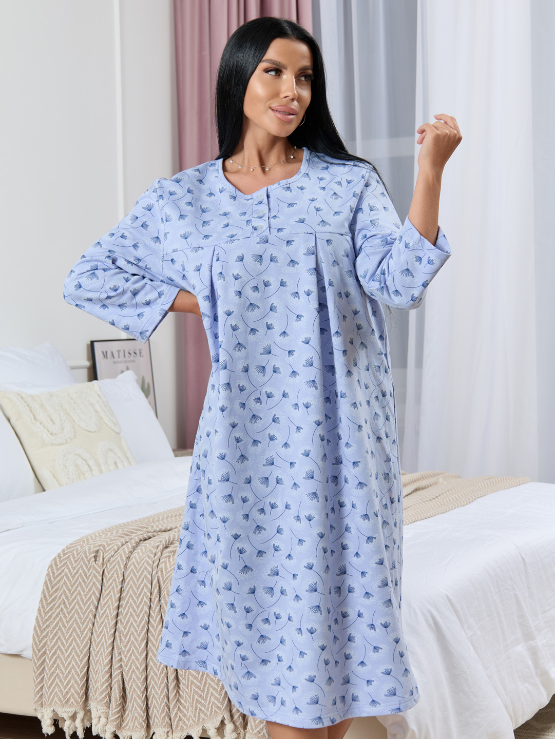 Женская ночная сорочка длиной ниже колена с рукавом 3/4 и округлой горловиной на пуговицах. Материал имеет притную к телу изнанку, благодаря которой вы не замерзните даже в самые морозные дни.