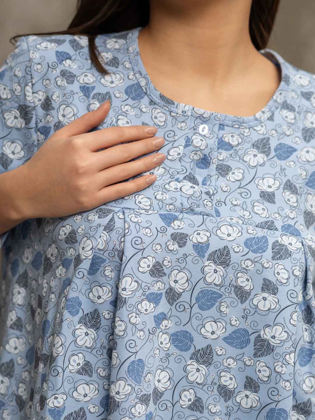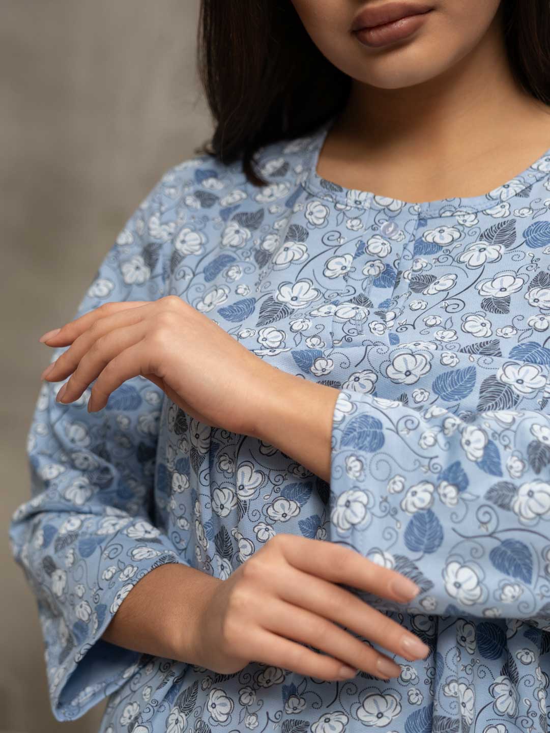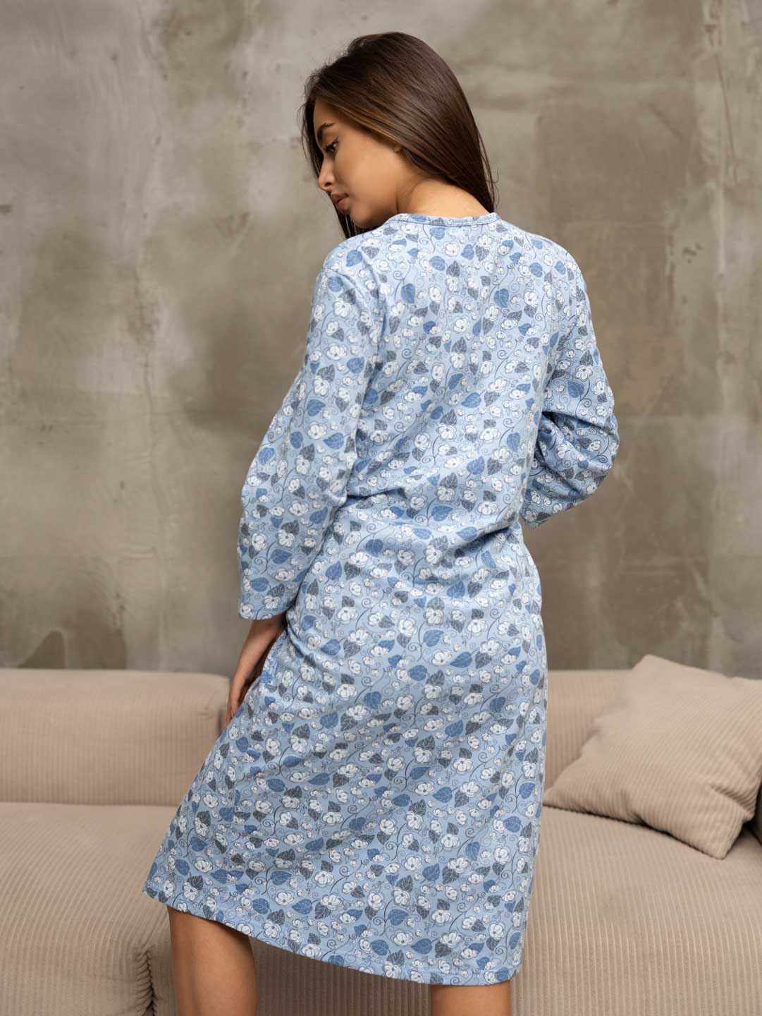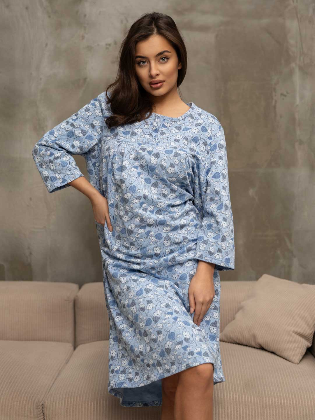 Женская ночная сорочка длиной ниже колена с рукавом 3/4 и округлой горловиной на пуговицах. Материал имеет прияную к телу изнанку, благодаря которой вы не замерзните даже в самые морозные дни..