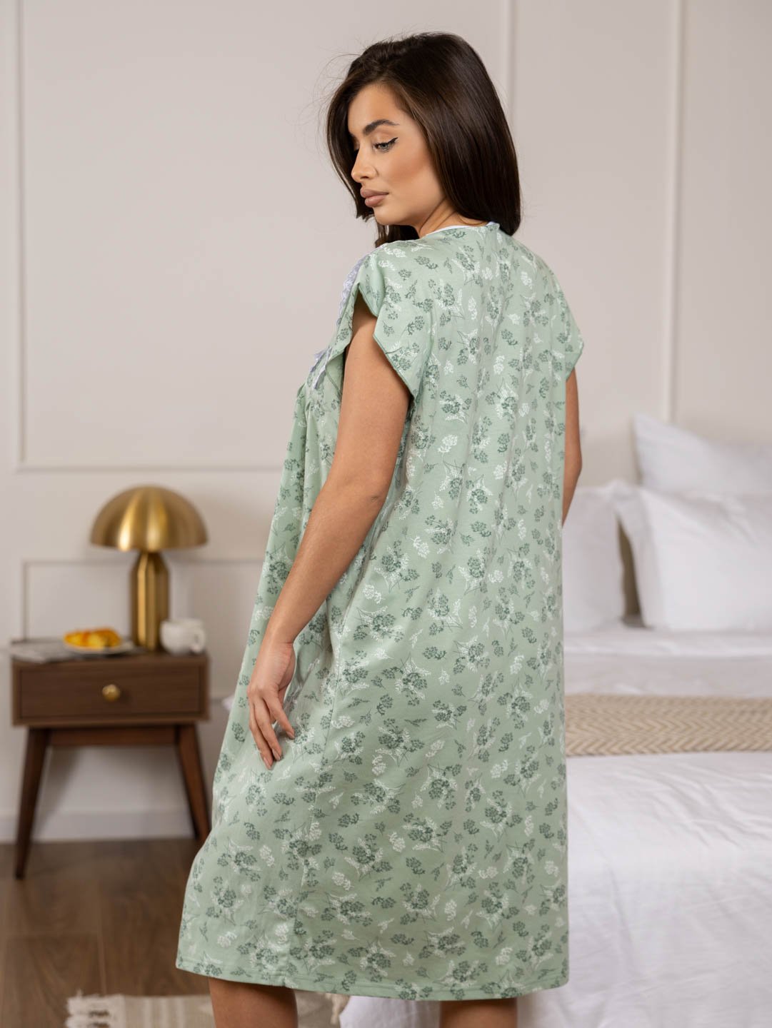 Сорочка женская для сна, длиной чуть ниже уровня колена. С округлым вырезом и коротким втачным рукавом. На передней части декоративные элементы в виде кружева и бантика.
