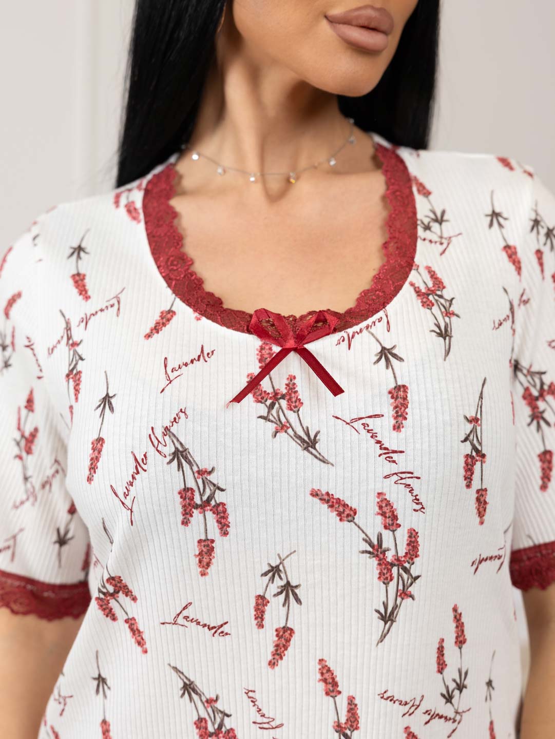 Ночная сорочка из хлопкового кашкорсе с набивыным рисунком, О-образной горловиной, коротким втачным рукавом, длиной чуть ниже колена. Горловина и край рукава украшены кружевом. Подол обработан роликовым швом, контрастными нитками в цвет рисунка.