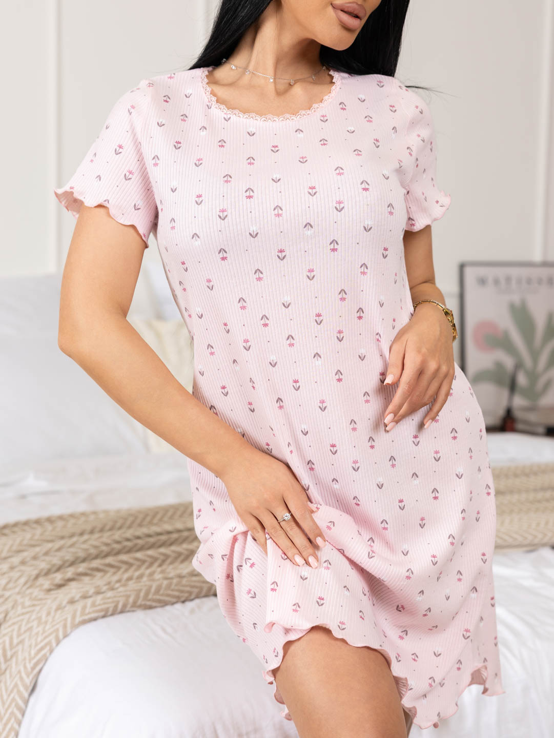 Ночная сорочка из хлопкового кашкорсе с набивыным рисунком, О-образной горловиной украшенной тонким кружевом в цвет основы ткани, коротким втачным рукавом, длиной до колена. Низ рукава и подол обработаны роликовым швом, нитки подобраны в цвет основы ткани.