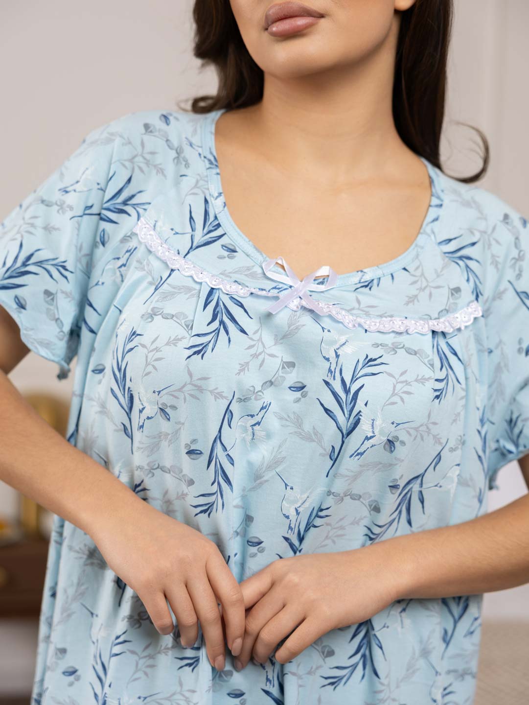 Ночная женская сорочка из набивной кулирки, с отделкой по кокетке из хлопкового кружева, рукавом реглан, длиной чуть ниже колена. Рост модели 165.