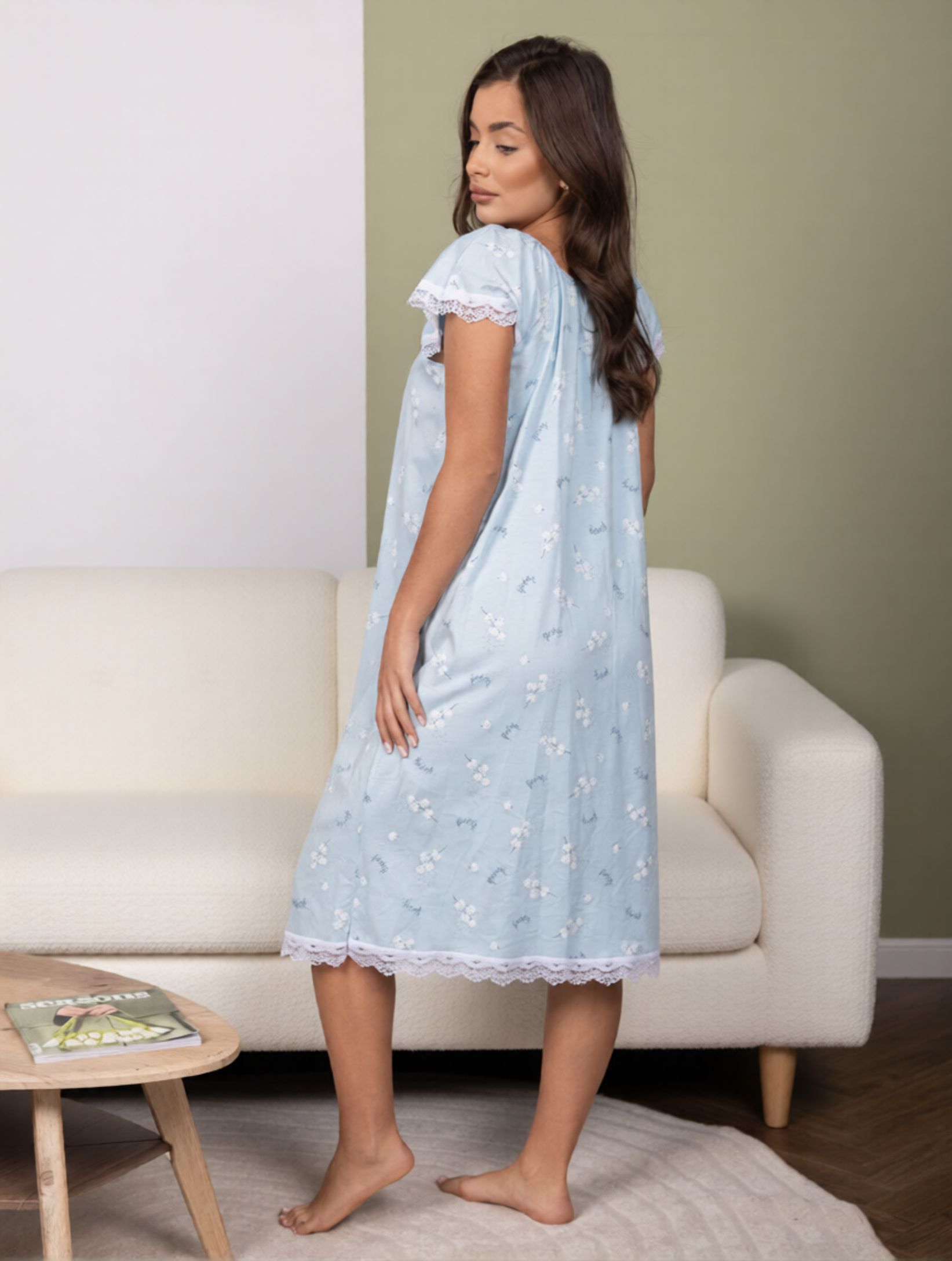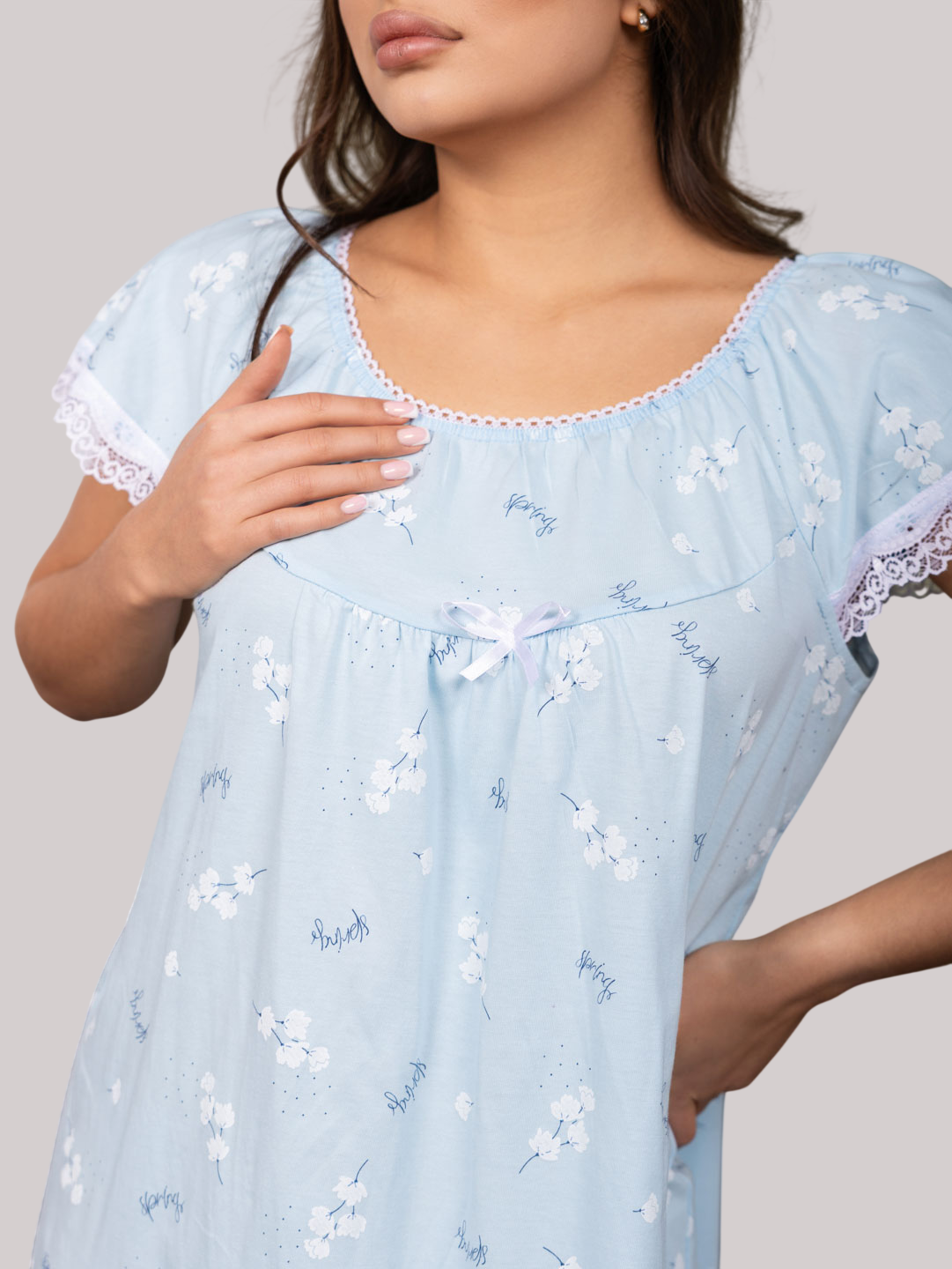 Ночная сорочка из хлопка длиной ниже колена, с О-образной горловиной, по горловине ажурная резинка, рукав крылышко и низ сорочки украшены кружевом. Рост модели 165см