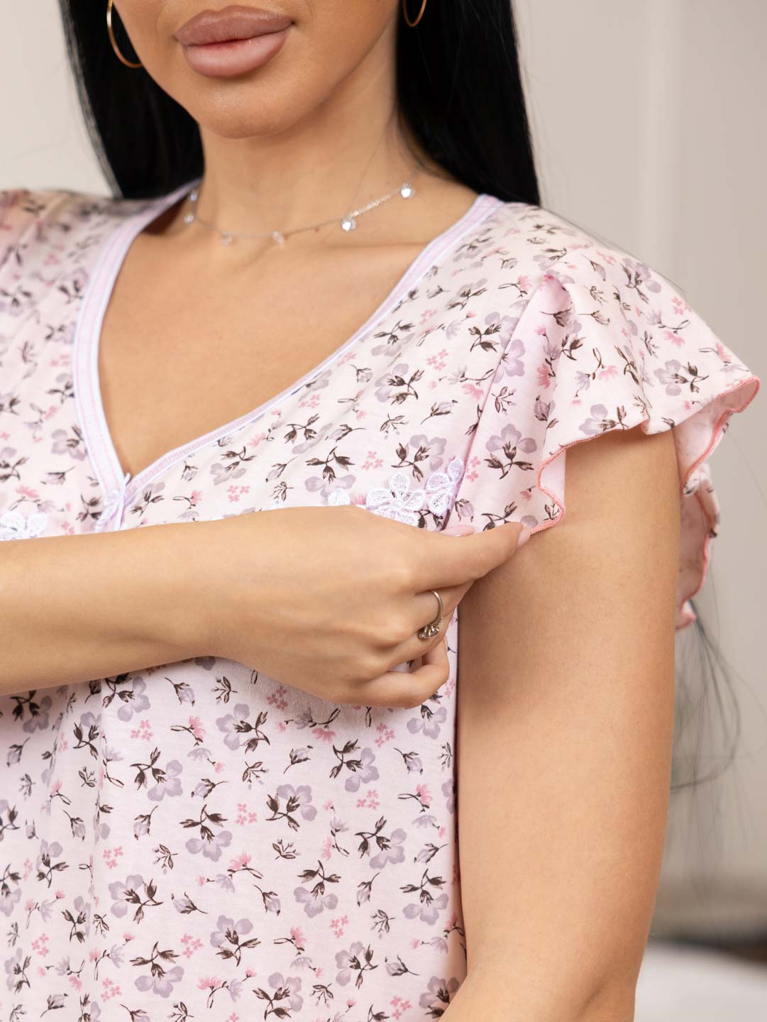 Женская ночная сорочка из хлопка, длиной ниже колена, с рукавом воланом и V-образной горловиной, украшена кружевом. Материал приятный к телу, обеспечивает комфорт во время сна.