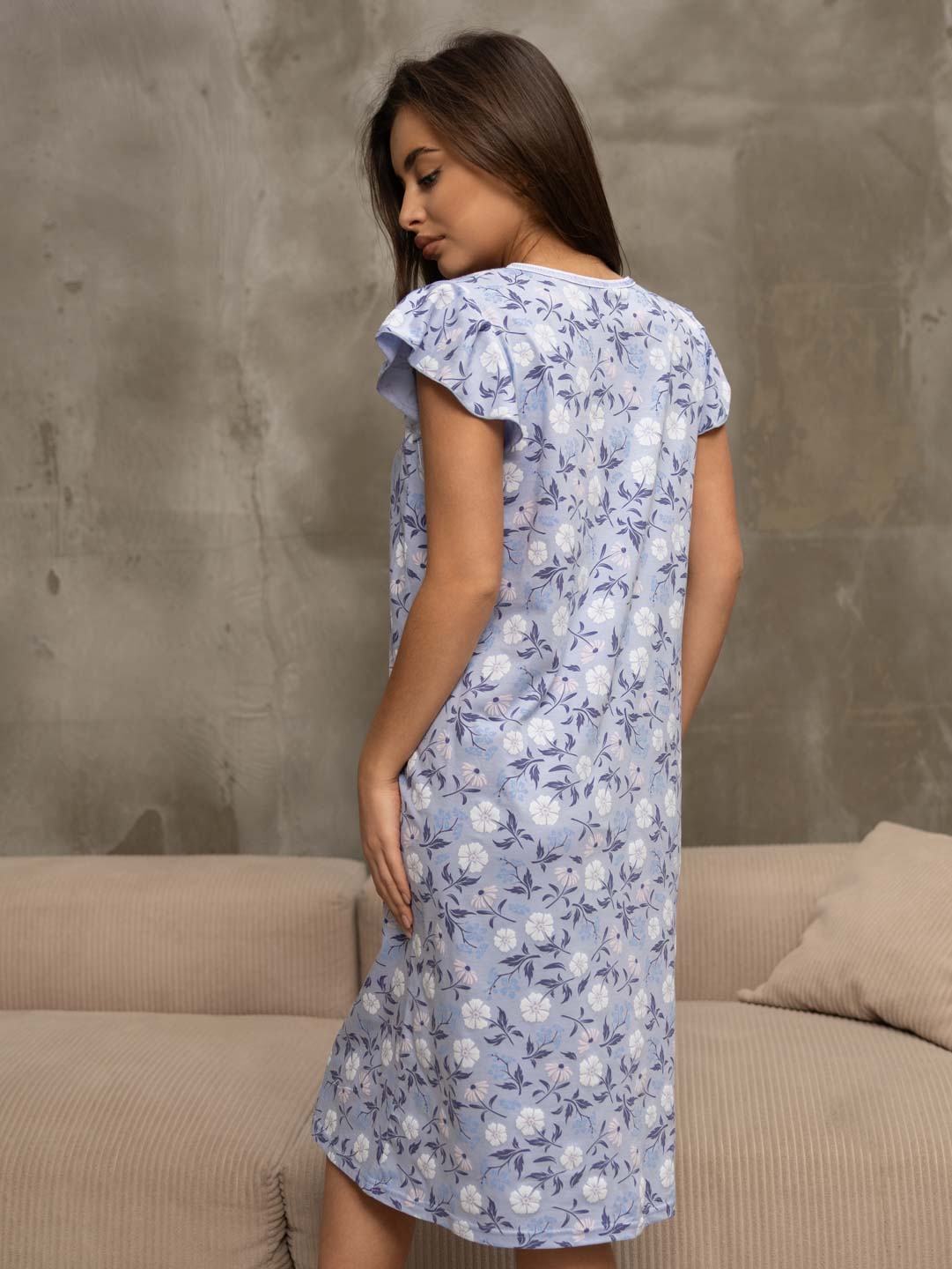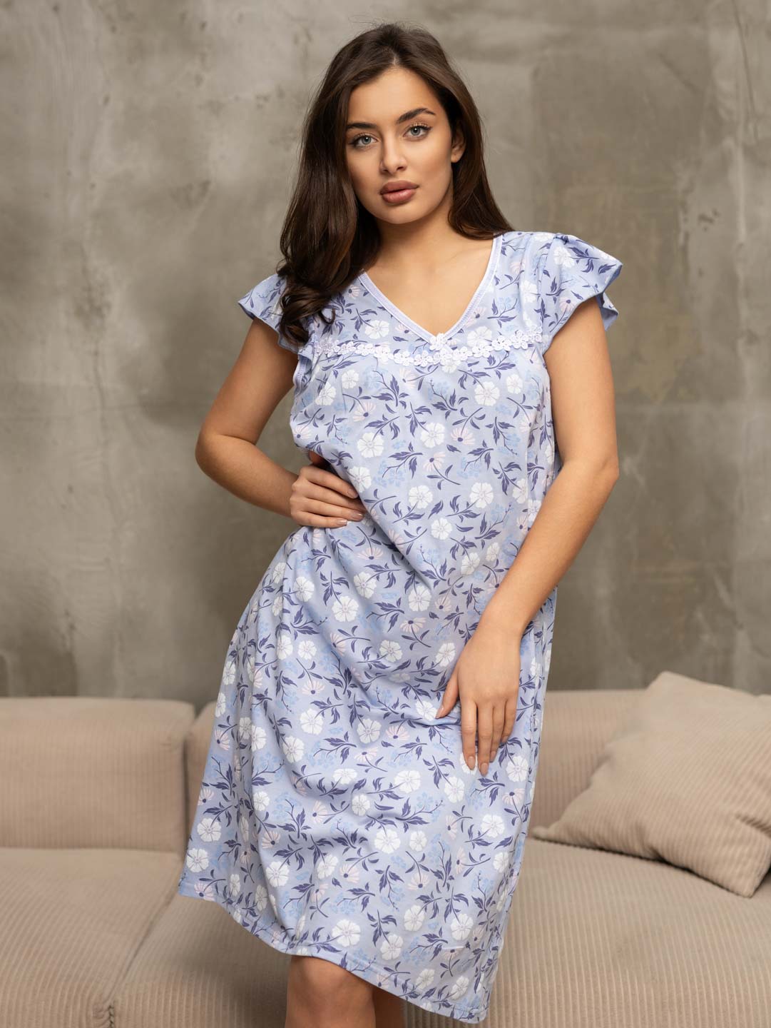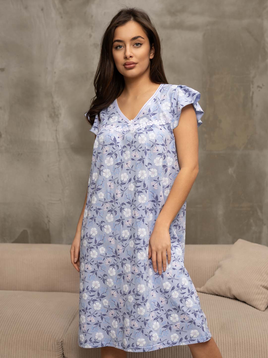 Женская ночная сорочка из хлопка, длиной ниже колена, с рукавом воланом и V-образной горловиной, украшена кружевом. Материал приятный к телу, обеспечивает комфорт во время сна.