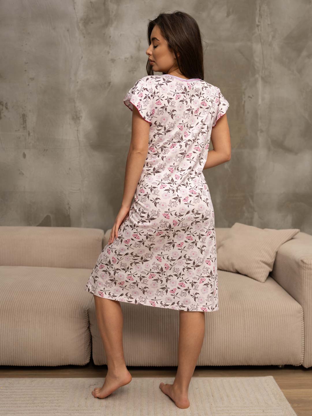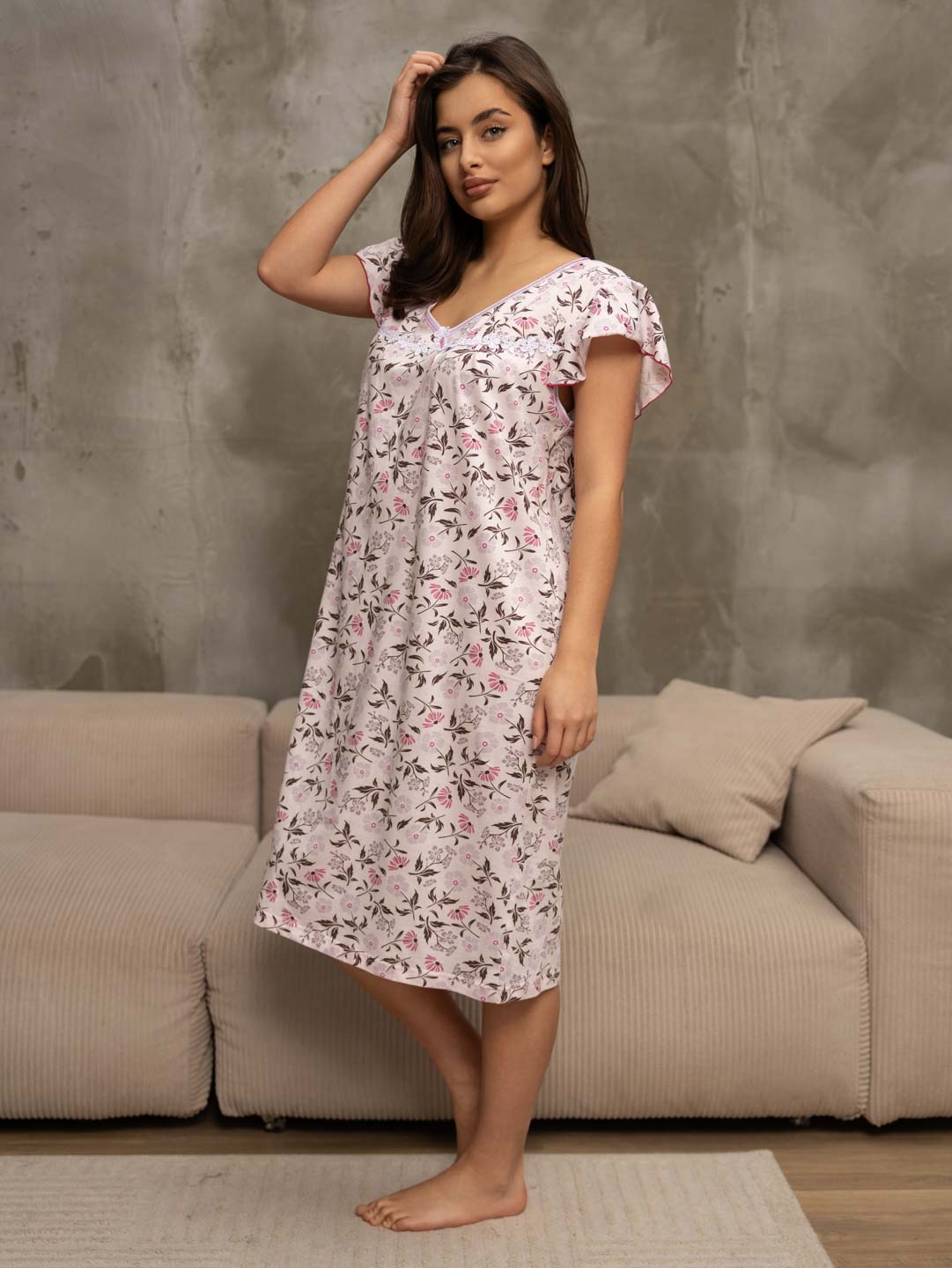 Женская ночная сорочка из хлопка, длиной ниже колена, с рукавом воланом и V-образной горловиной, украшена кружевом. Материал приятный к телу, обеспечивает комфорт во время сна.